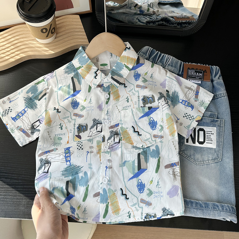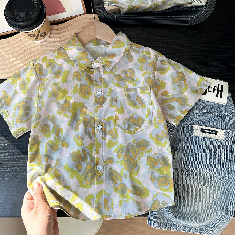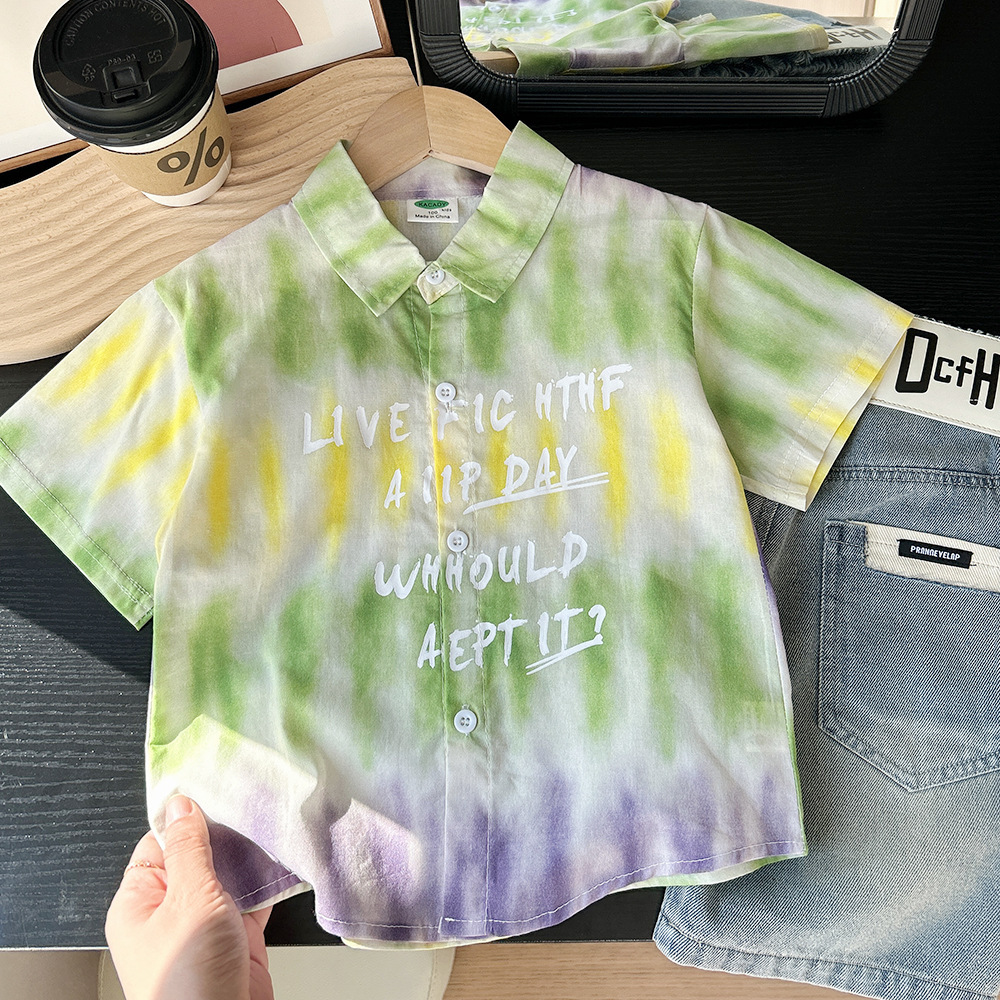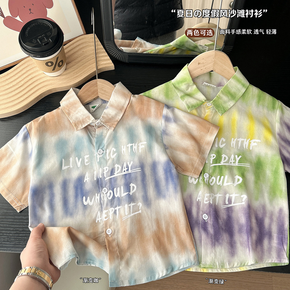 어린이 한국식 느슨한 반팔 셔츠 2025 여름 서양식 얇은 쿨 넥타이 염색 비치 탑스토어 가기