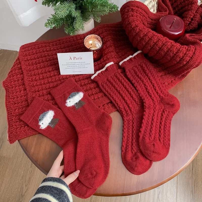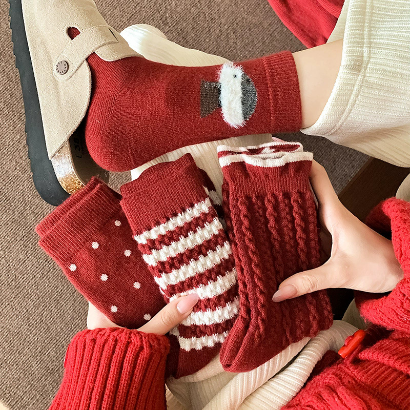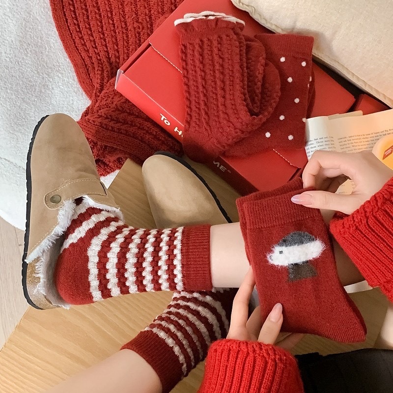 양말 여성 중간 길이 양말 새해 가을 겨울 새해 붉은 양말 일본식 웨이브 도트 두꺼운 따뜻한 스타킹