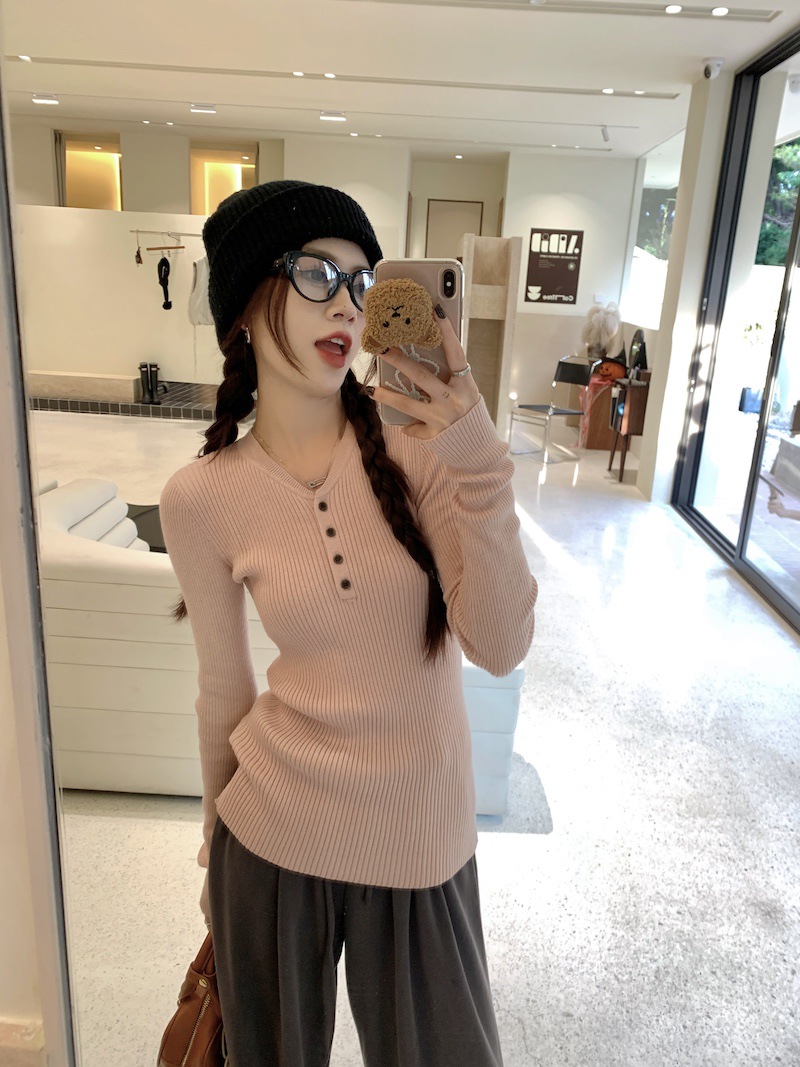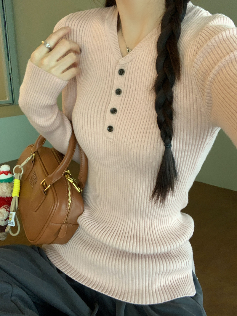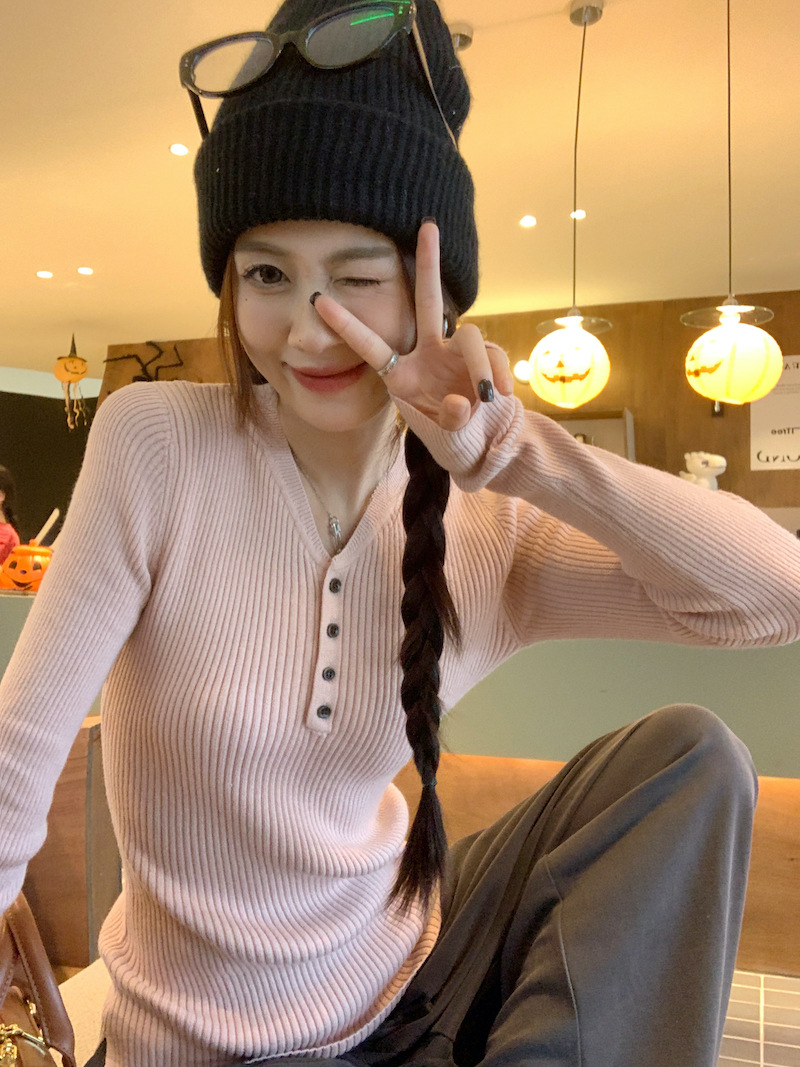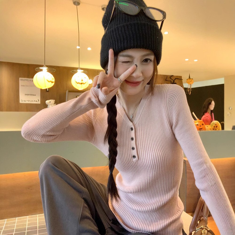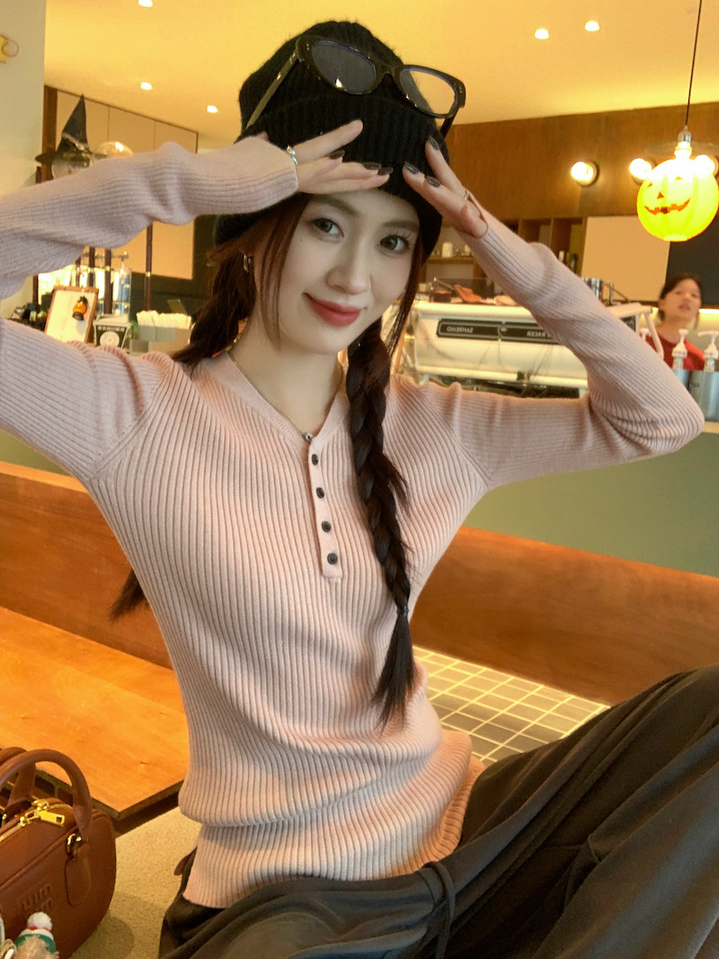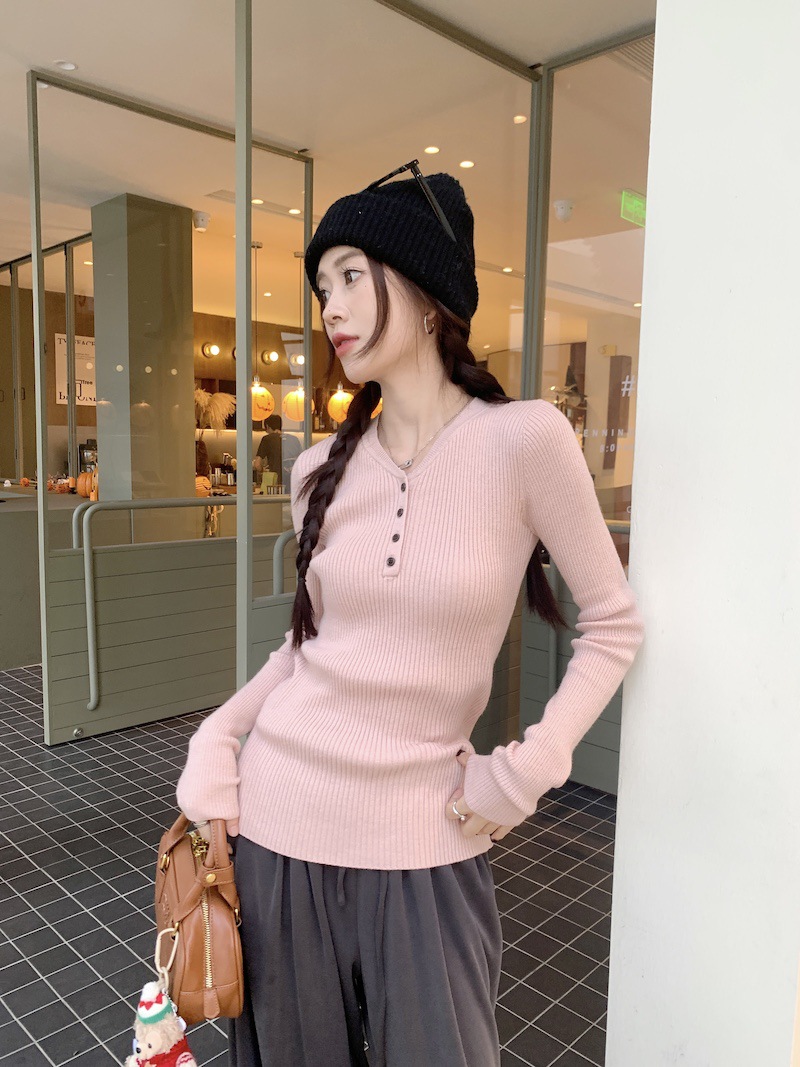 한국 스타일의 세련된 반 오픈 칼라베이스 셔츠 여성의 가을 및 겨울 새로운 슬림 핏 핑크 스웨터 고급 내부 니트 탑