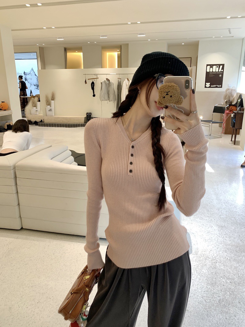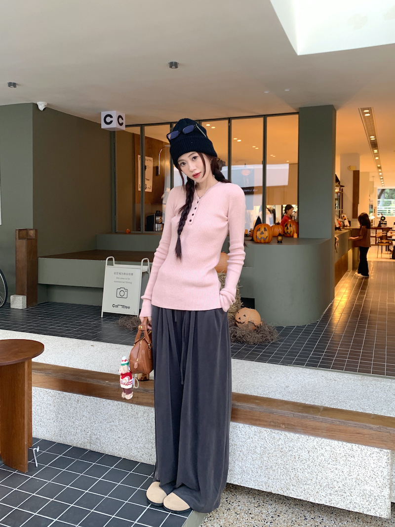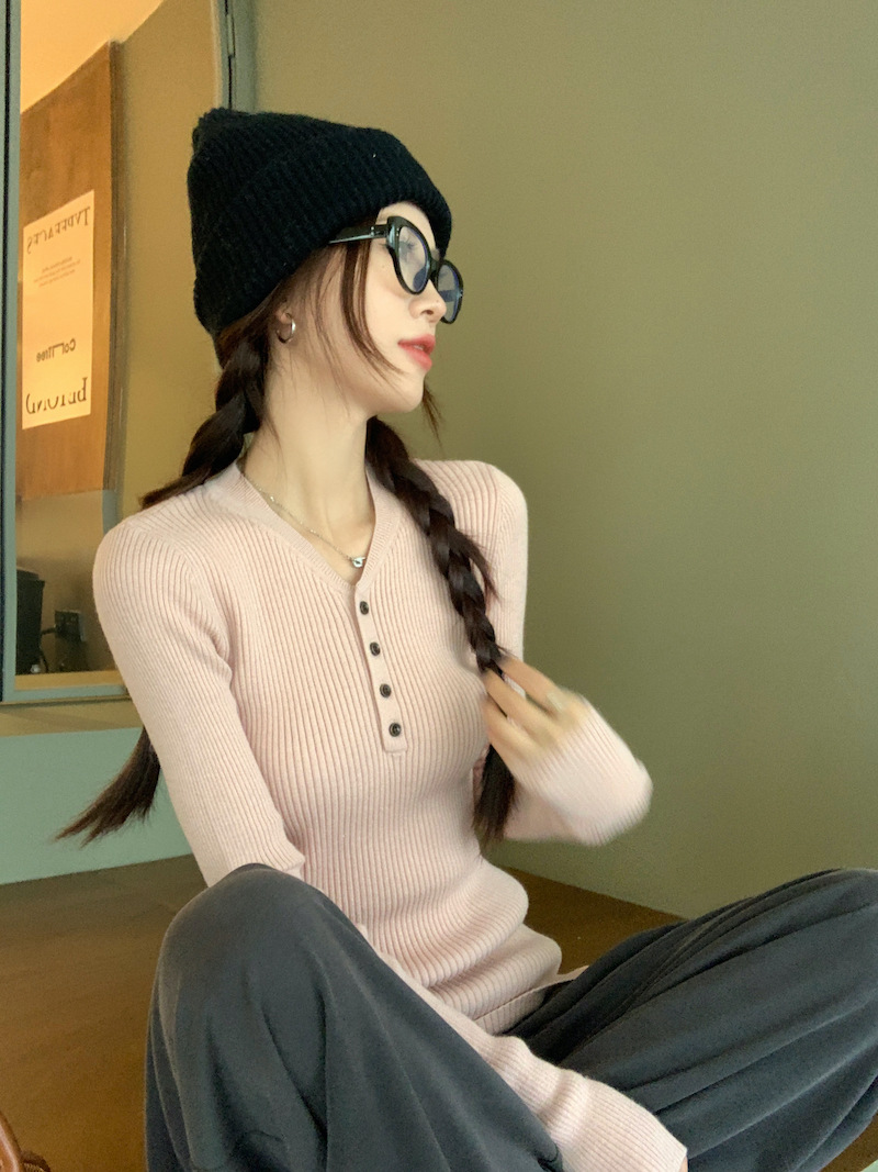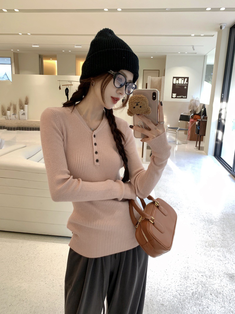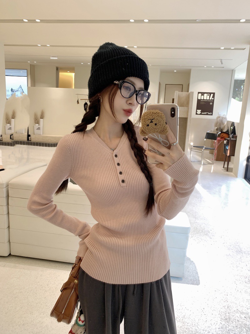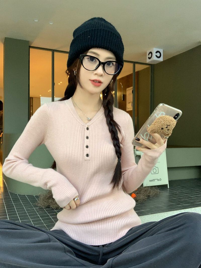 한국 스타일의 세련된 반 오픈 칼라베이스 셔츠 여성의 가을 및 겨울 새로운 슬림 핏 핑크 스웨터 고급 내부 니트 탑