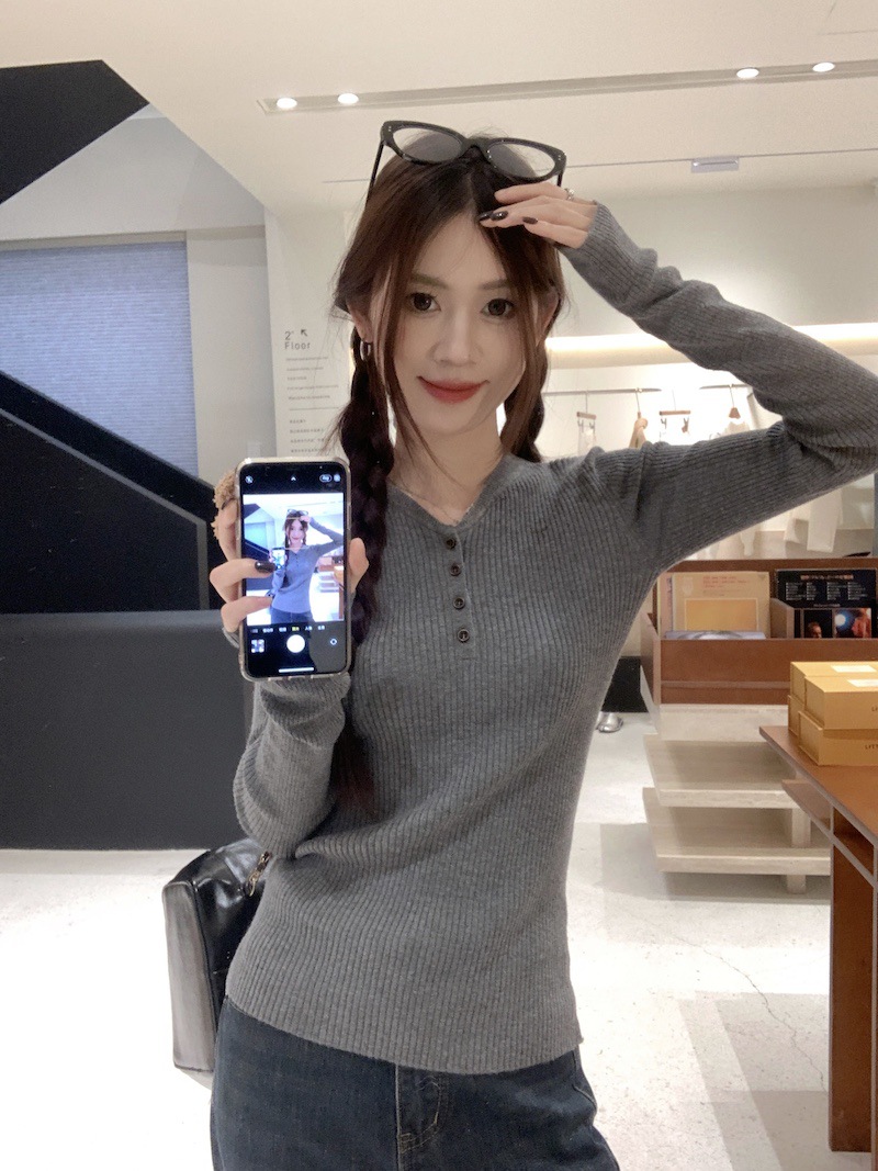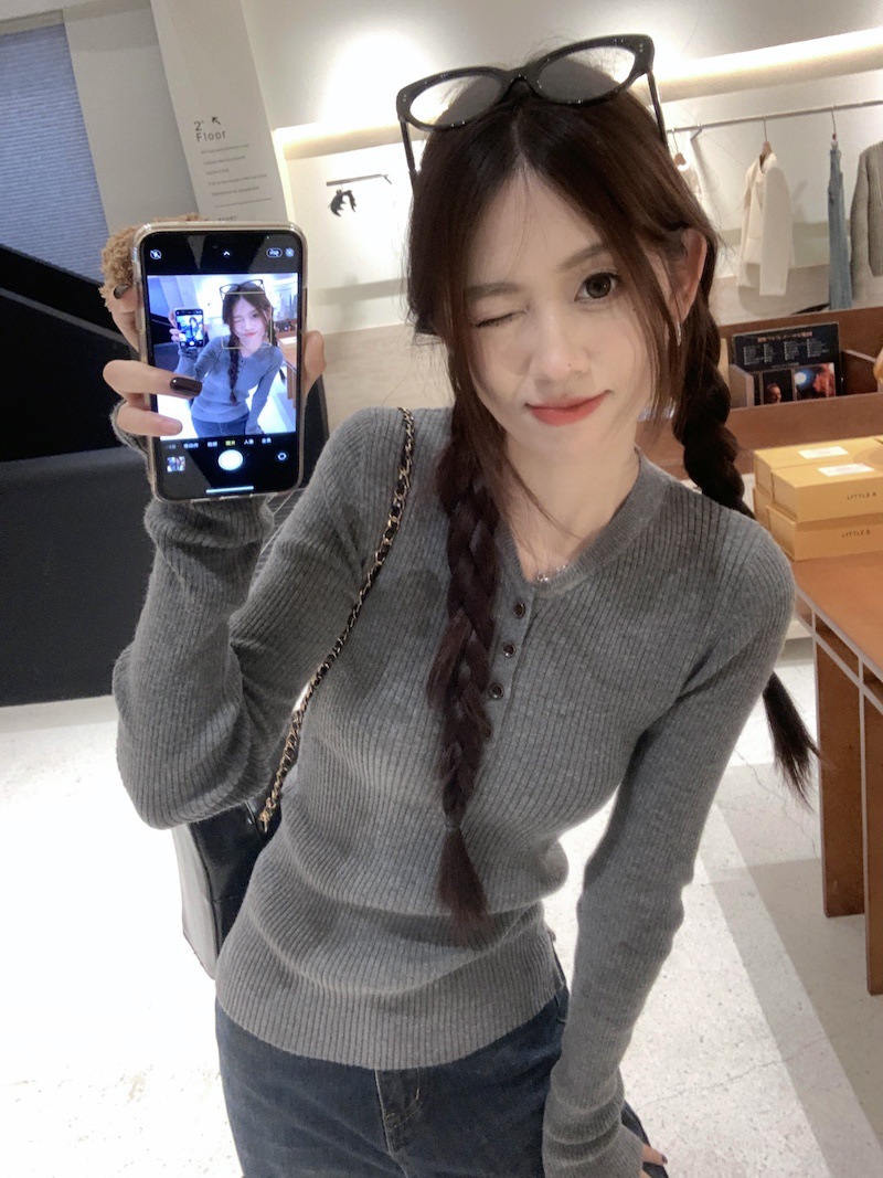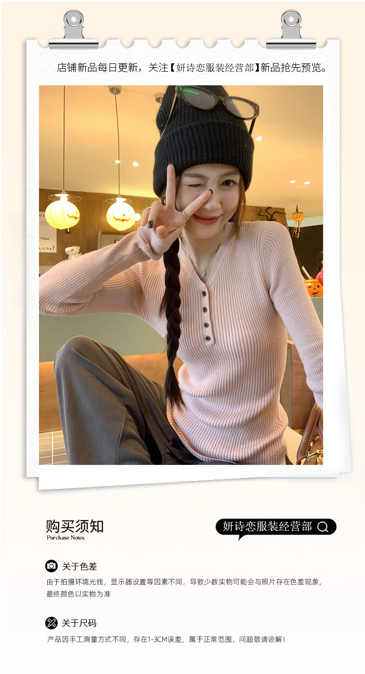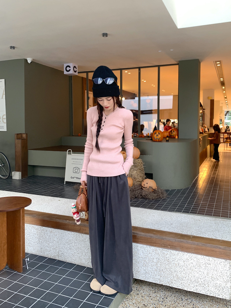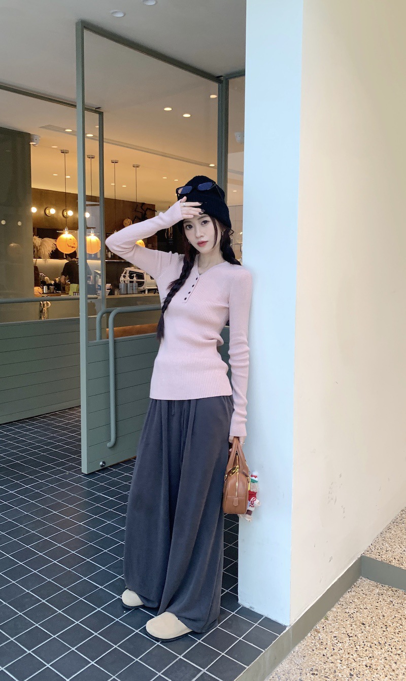 한국 스타일의 세련된 반 오픈 칼라베이스 셔츠 여성의 가을 및 겨울 새로운 슬림 핏 핑크 스웨터 고급 내부 니트 탑