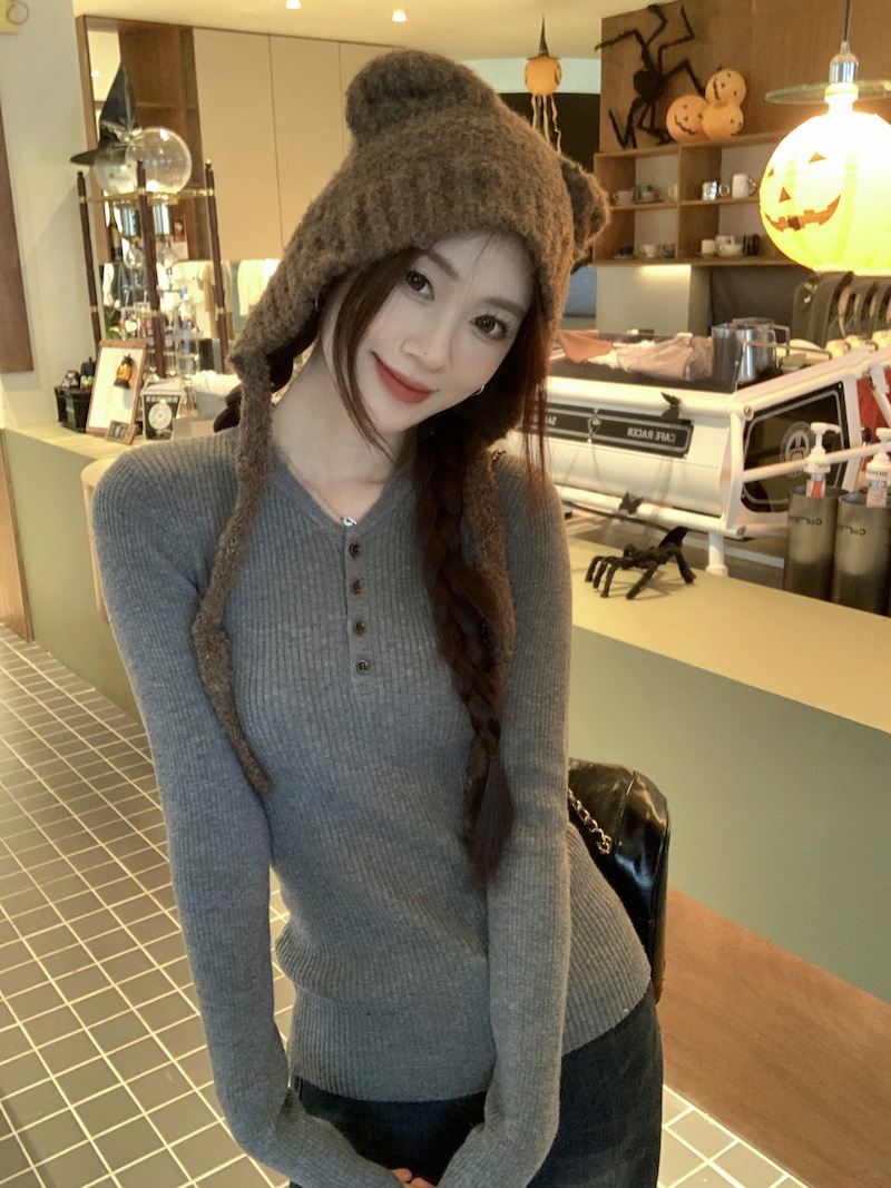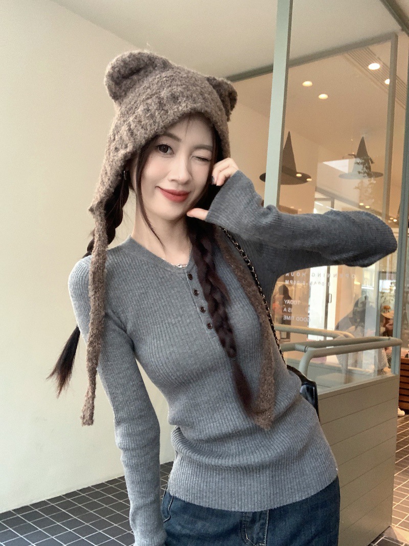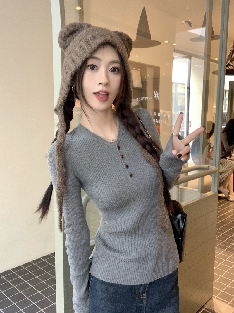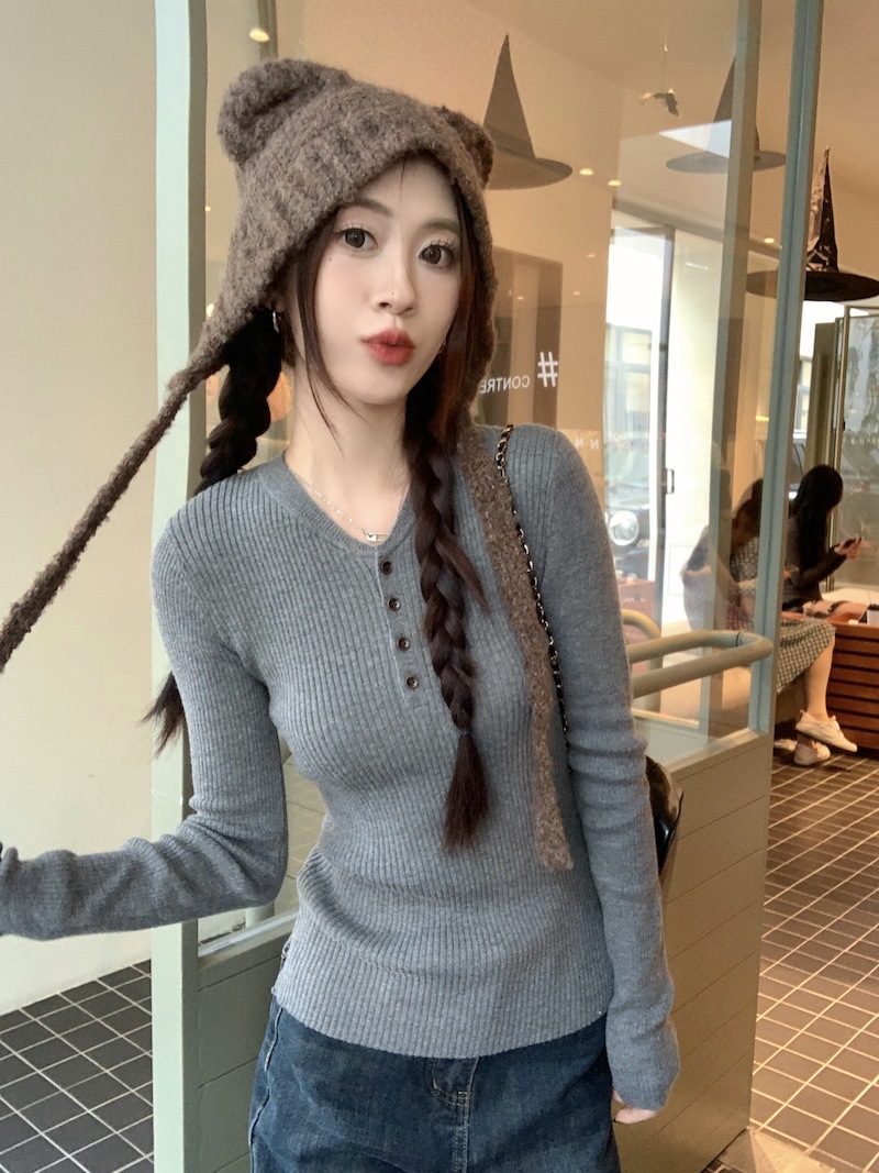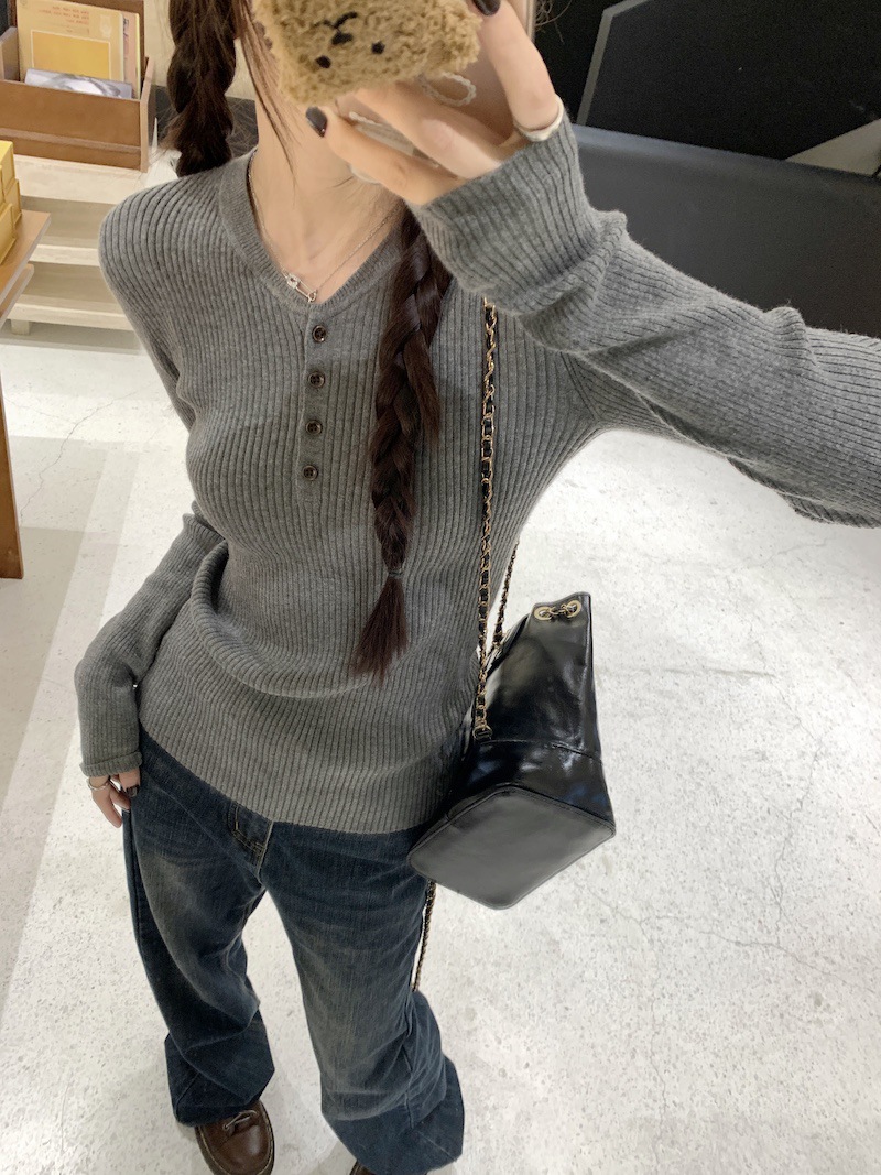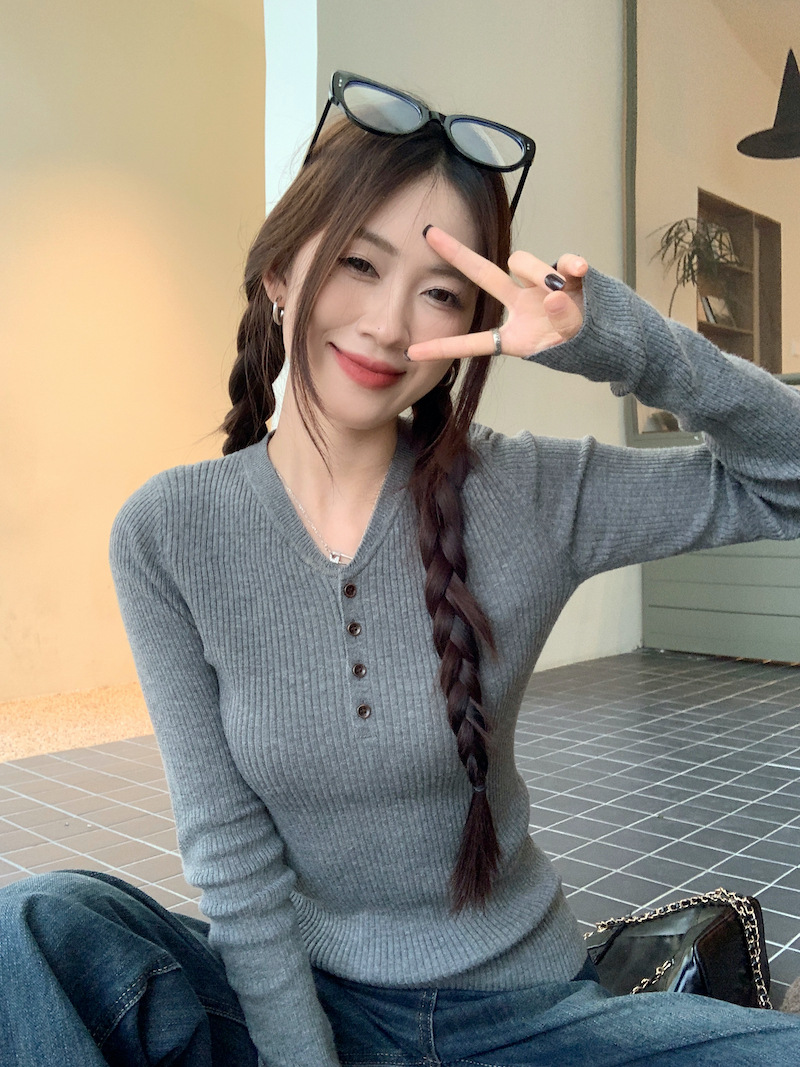 한국 스타일의 세련된 반 오픈 칼라베이스 셔츠 여성의 가을 및 겨울 새로운 슬림 핏 핑크 스웨터 고급 내부 니트 탑