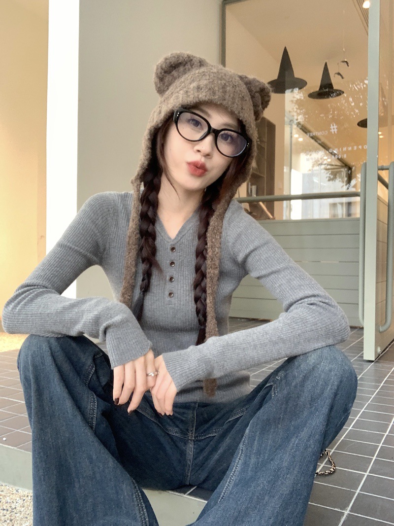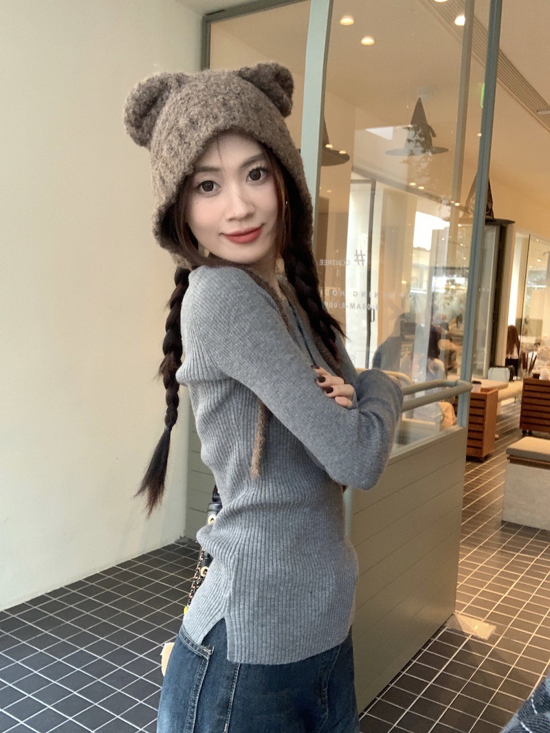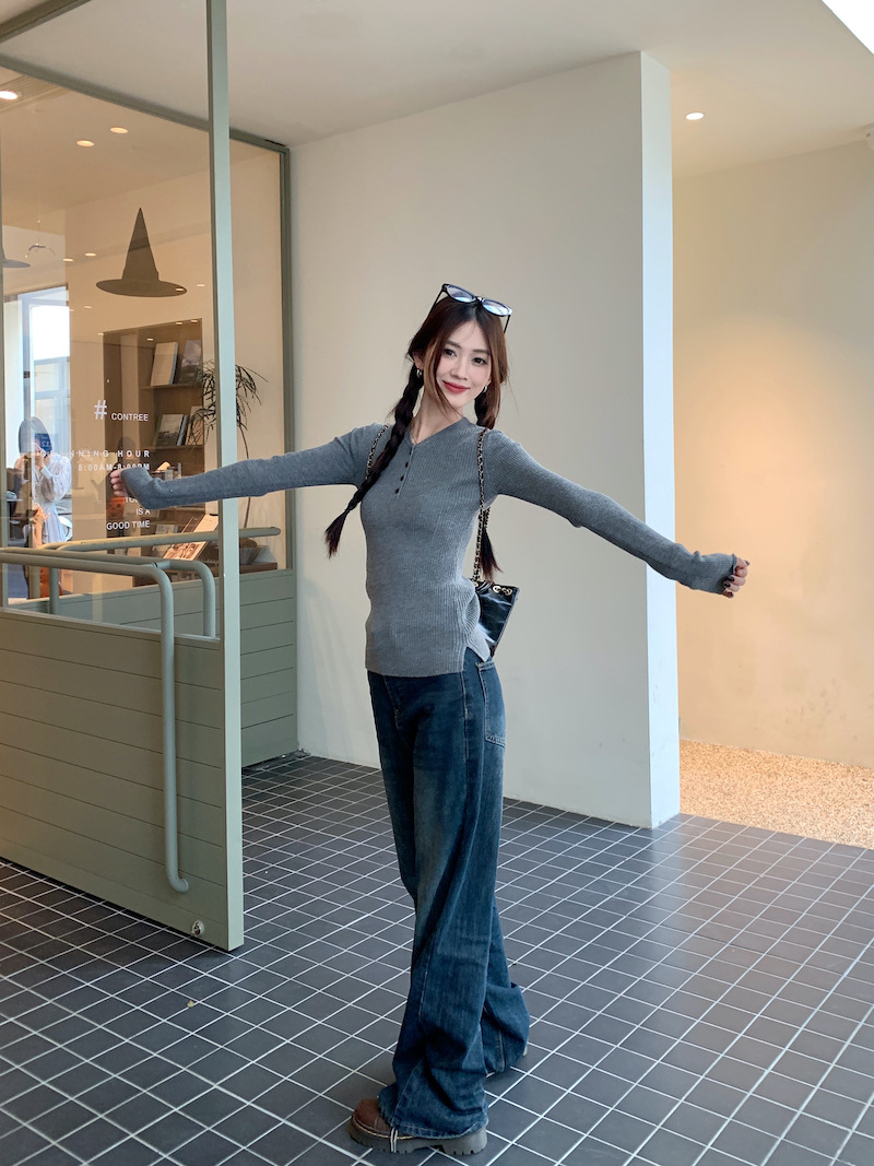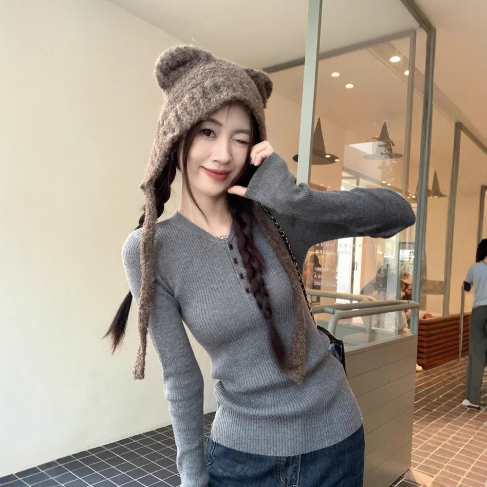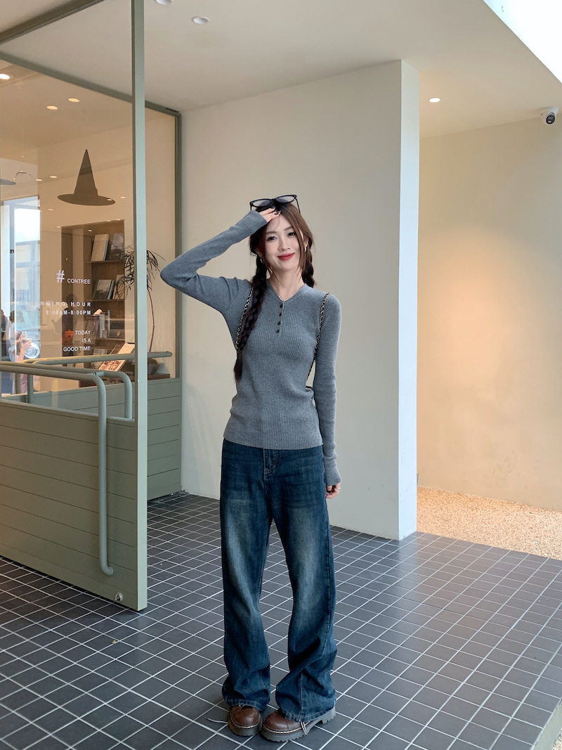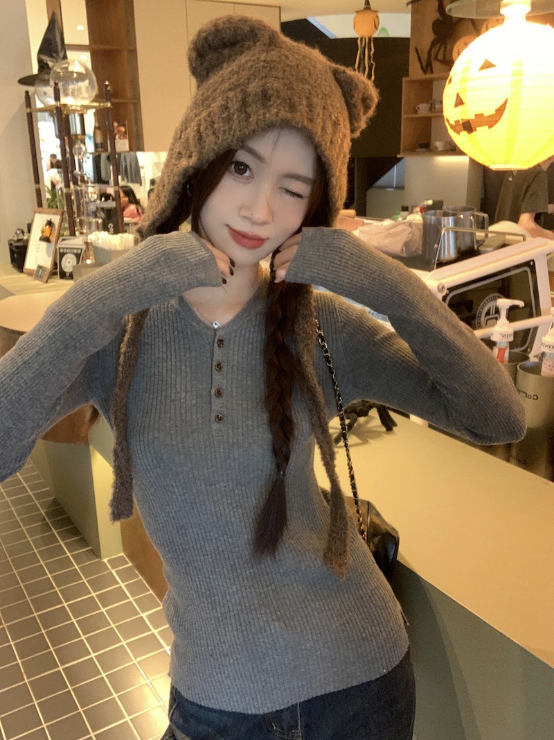 한국 스타일의 세련된 반 오픈 칼라베이스 셔츠 여성의 가을 및 겨울 새로운 슬림 핏 핑크 스웨터 고급 내부 니트 탑