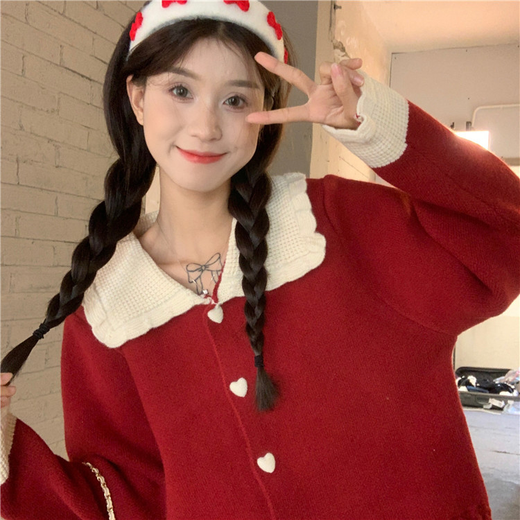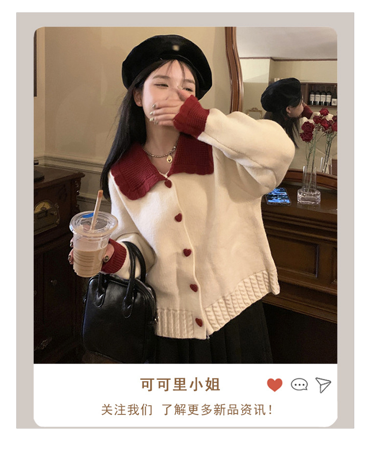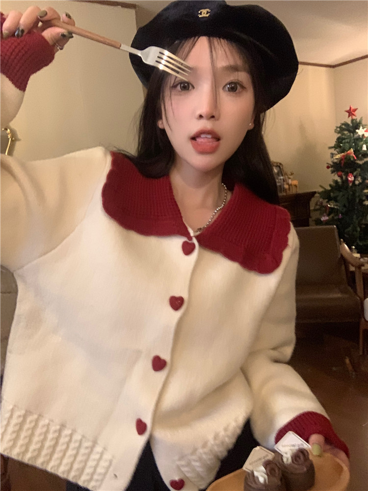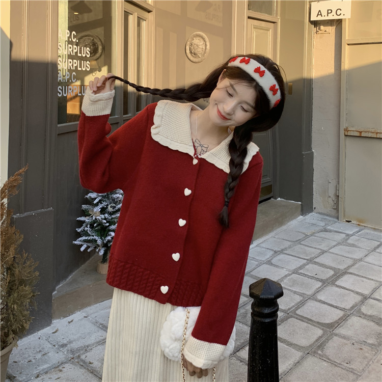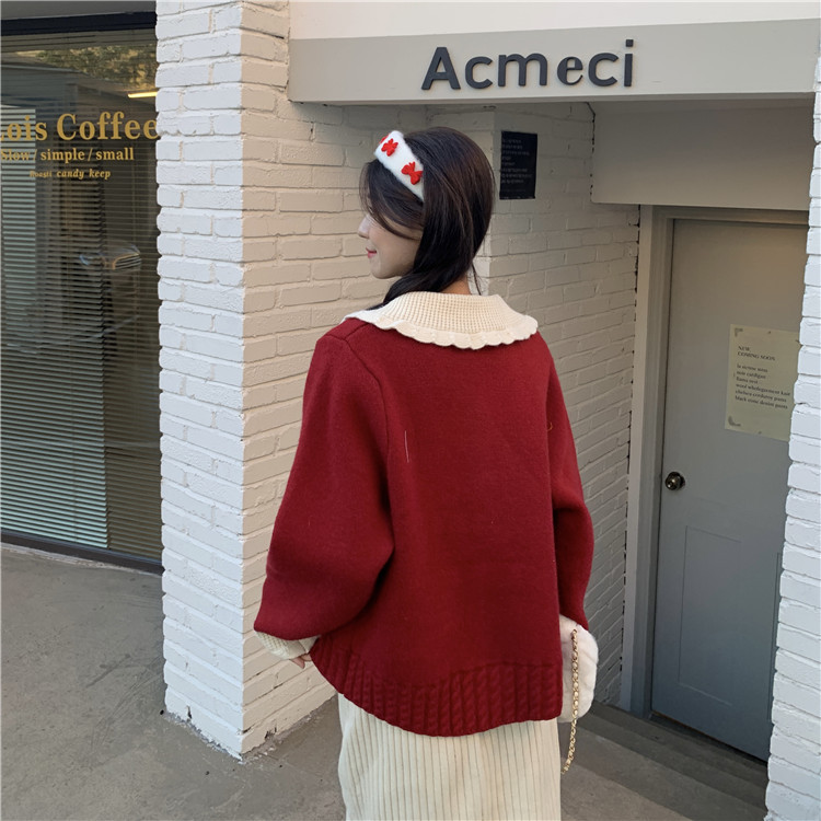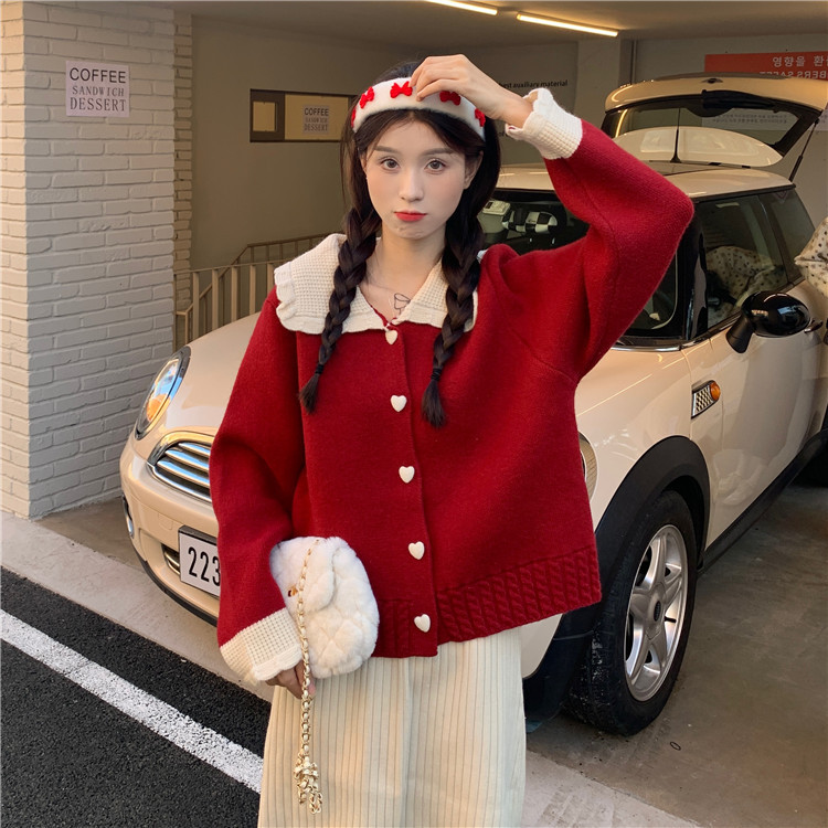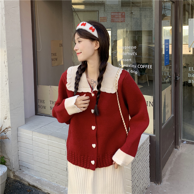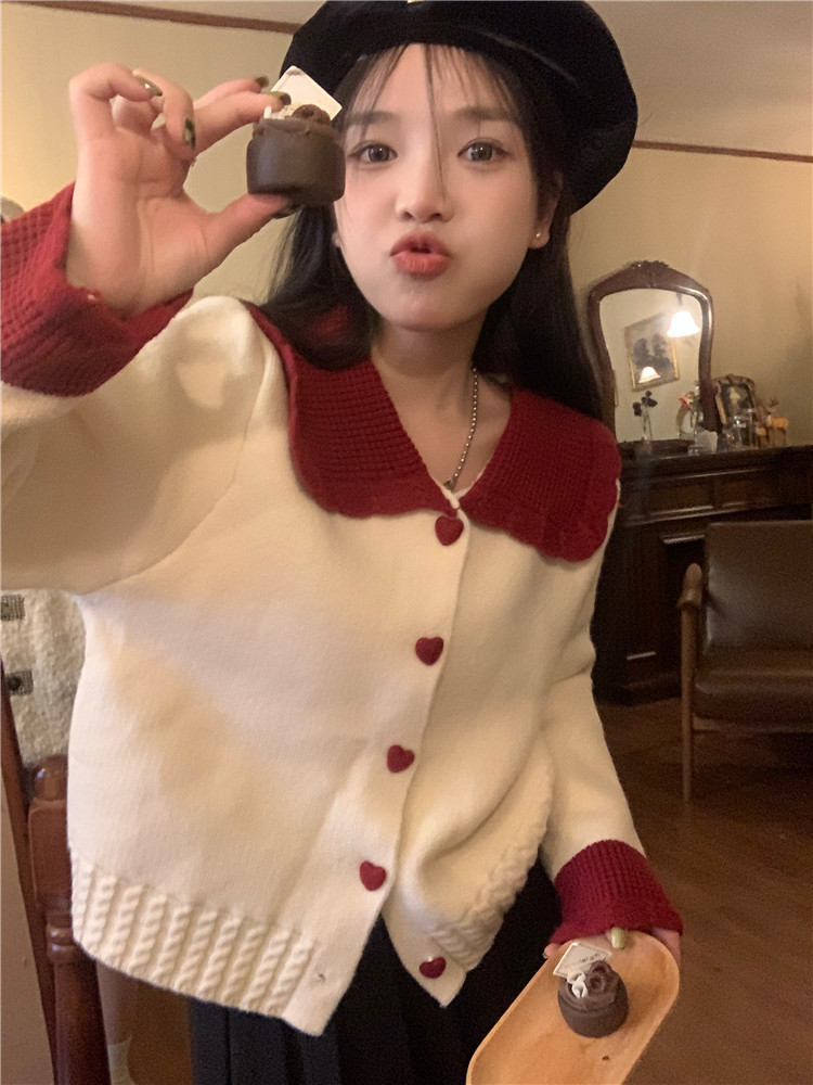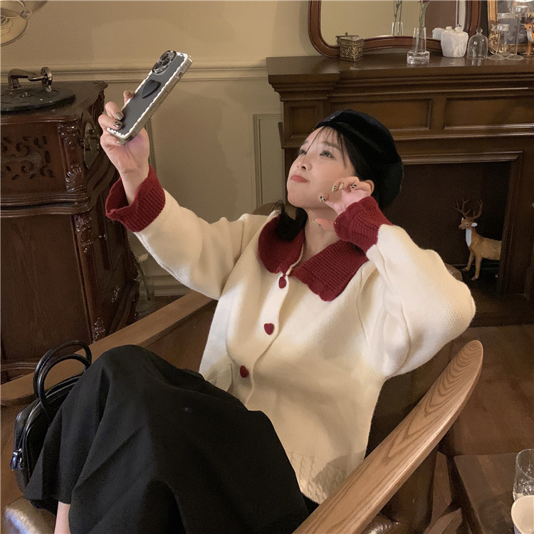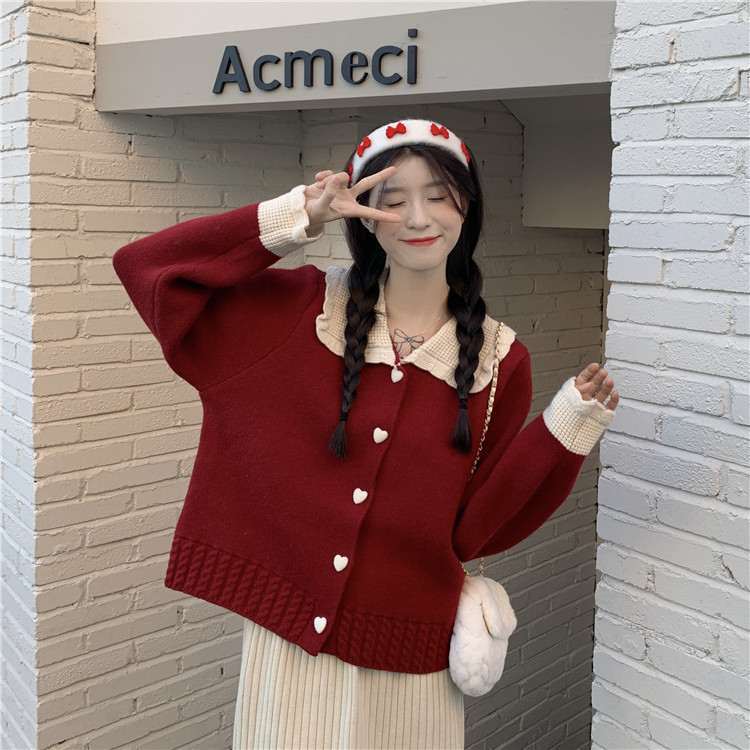 인형 칼라 레드 스웨터 가을과 겨울 2025 새로운 대비 컬러 틈새 디자인 센스 짧은 니트 카디건 탑 여성 의류스토어 가기