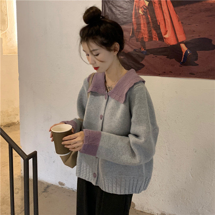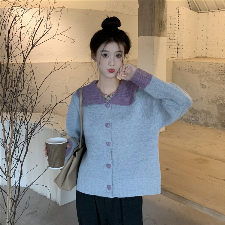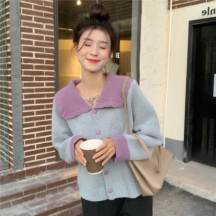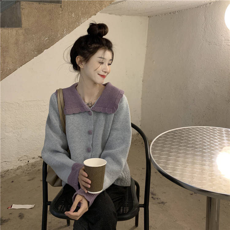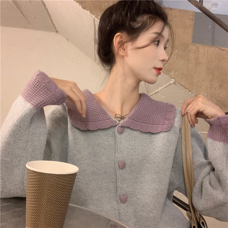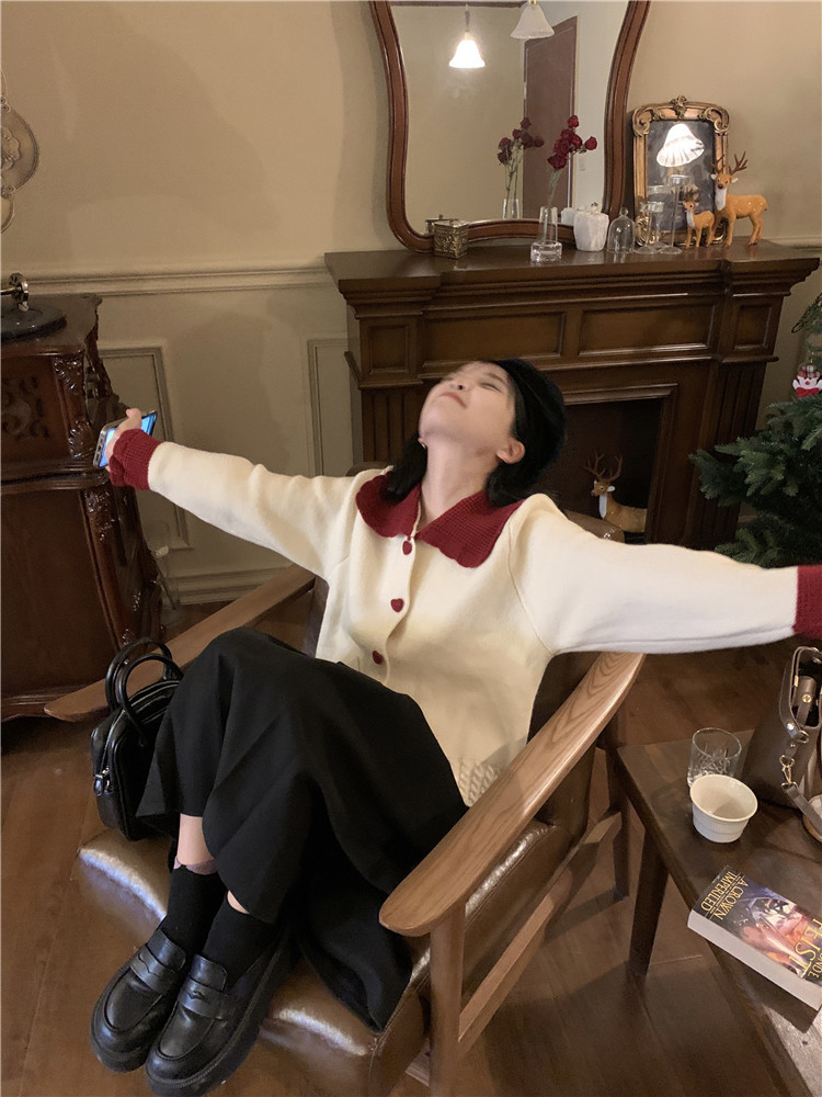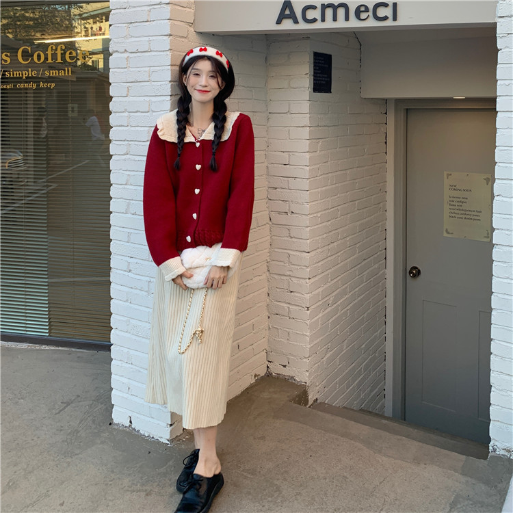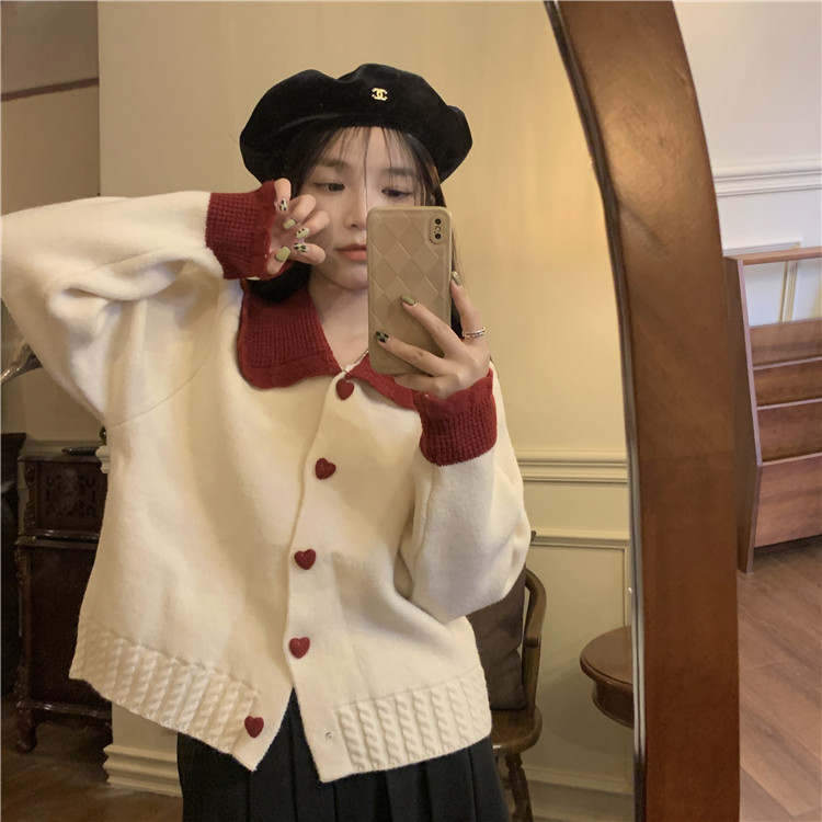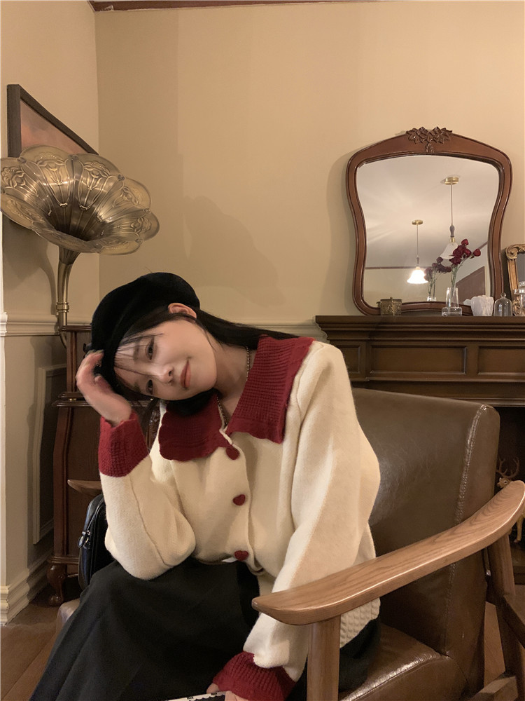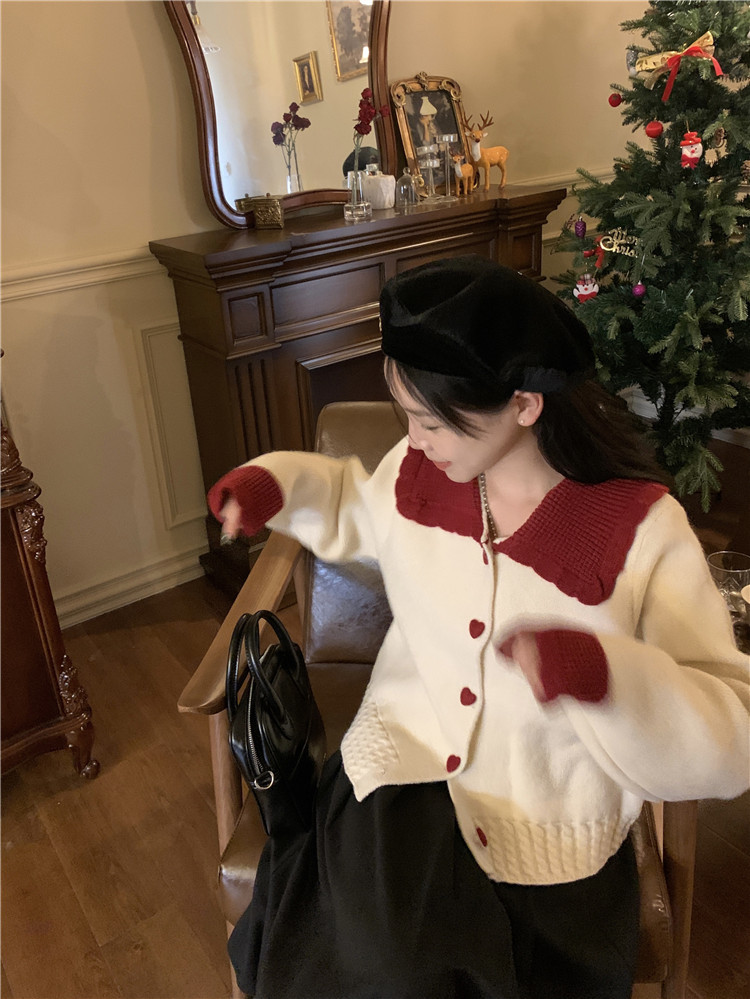 인형 칼라 레드 스웨터 가을과 겨울 2025 새로운 대비 컬러 틈새 디자인 센스 짧은 니트 카디건 탑 여성 의류스토어 가기