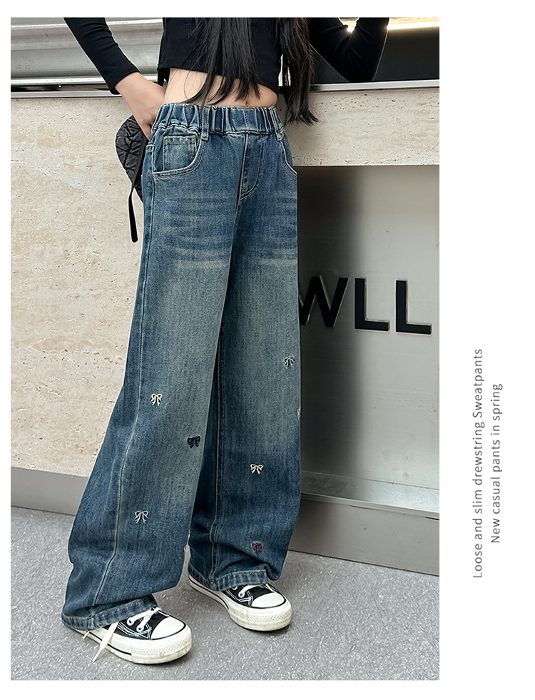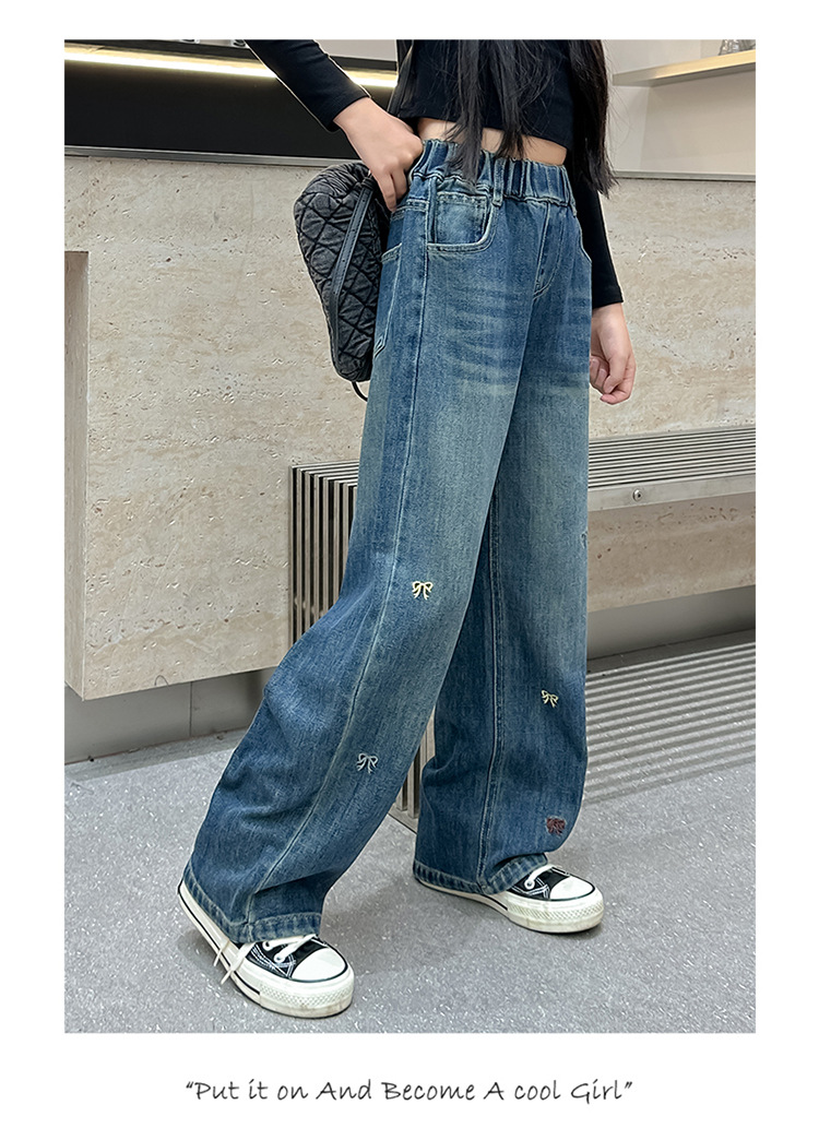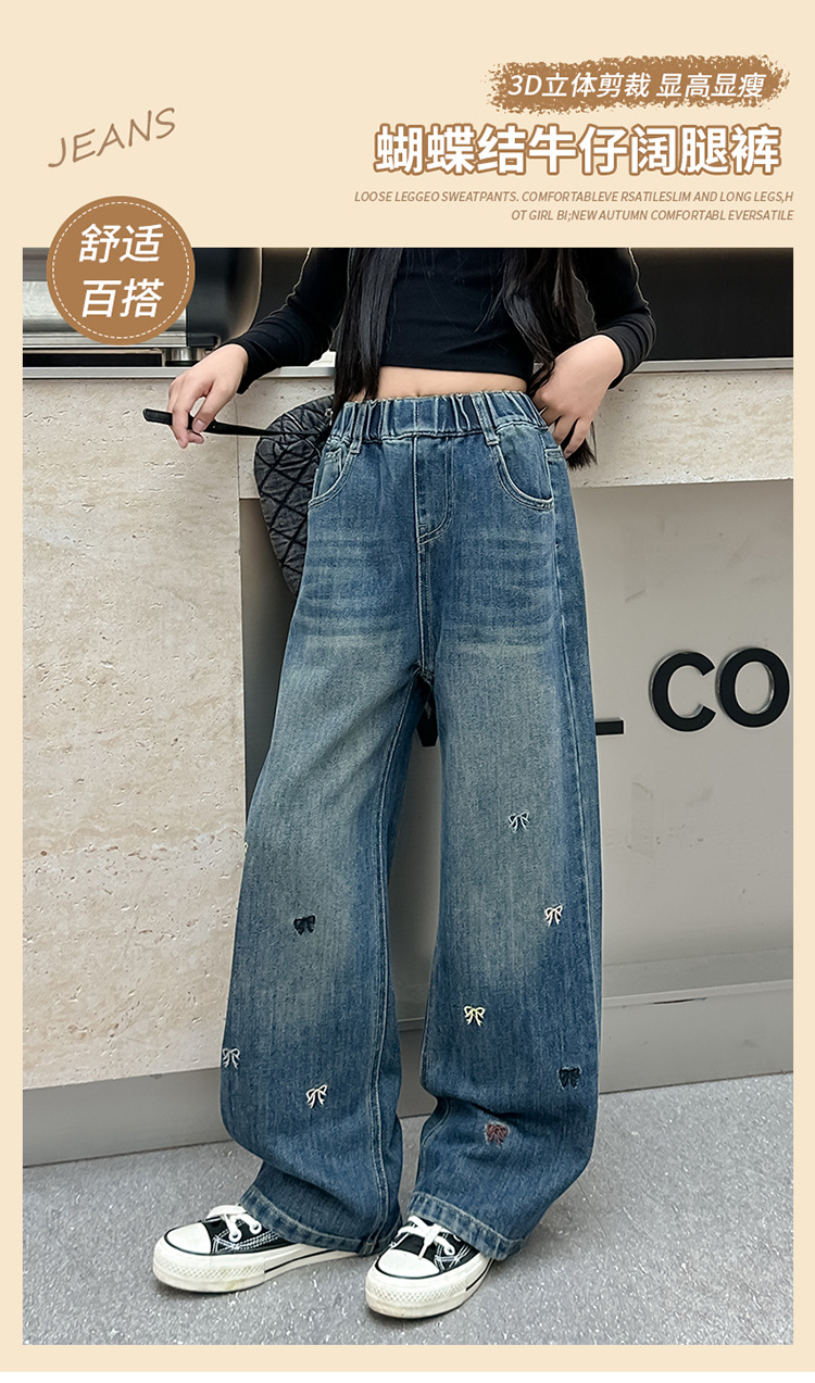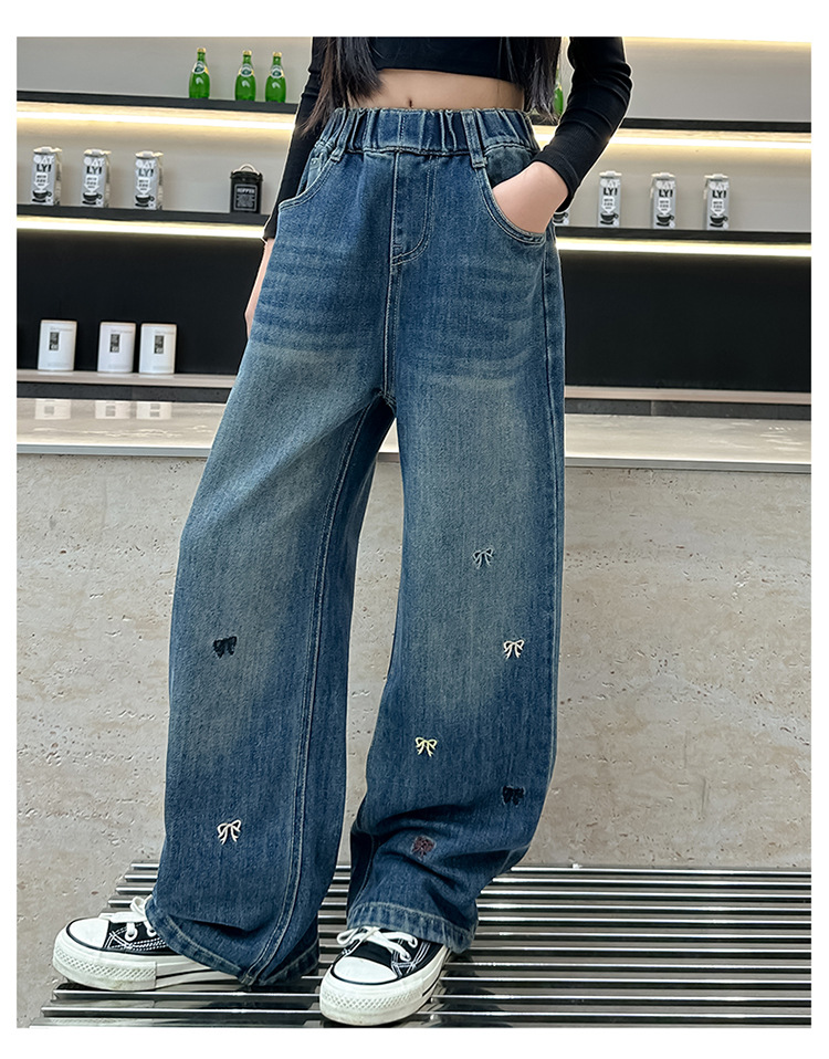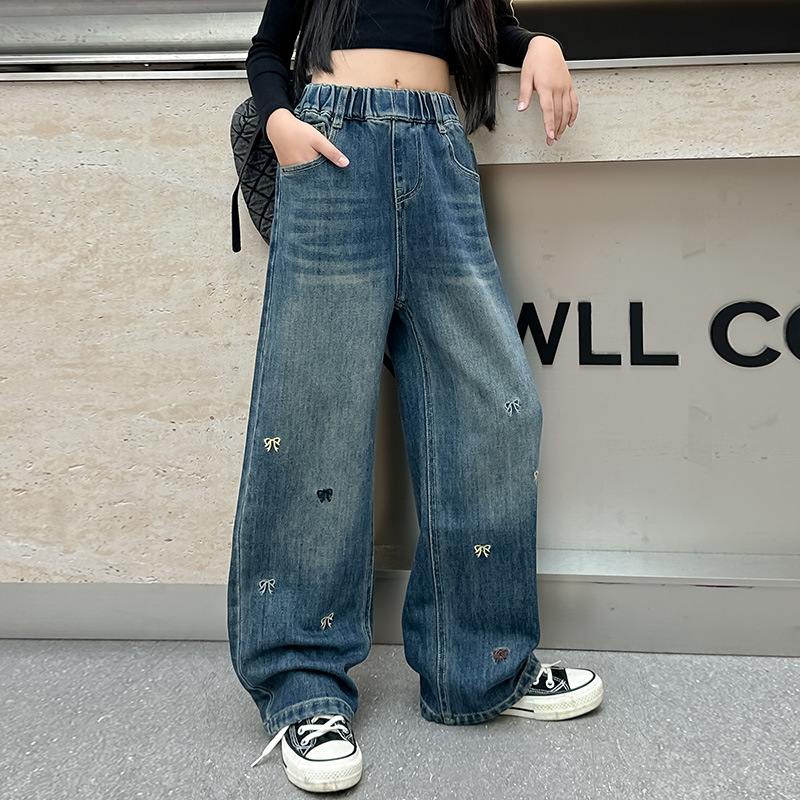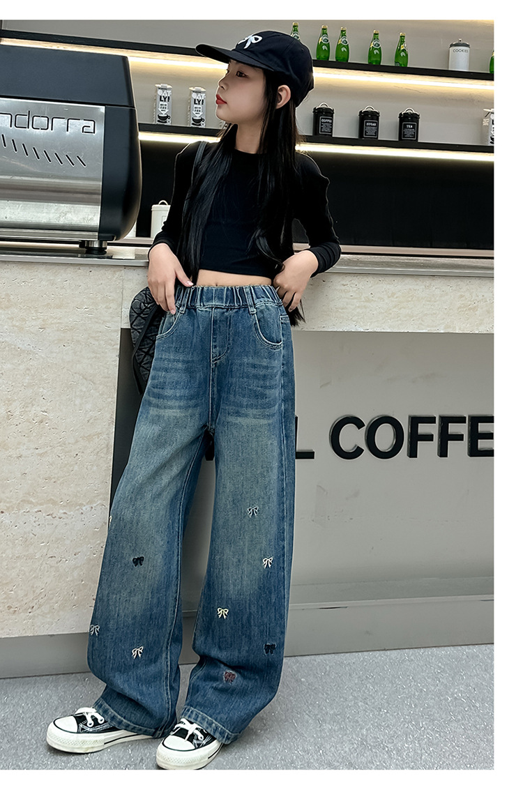 소녀의 가을 데님 넓은 다리 바지 2025 새로운 어린이 느슨한 중학교 소녀의 스트레이트 바지 봄과 가을스토어 가기