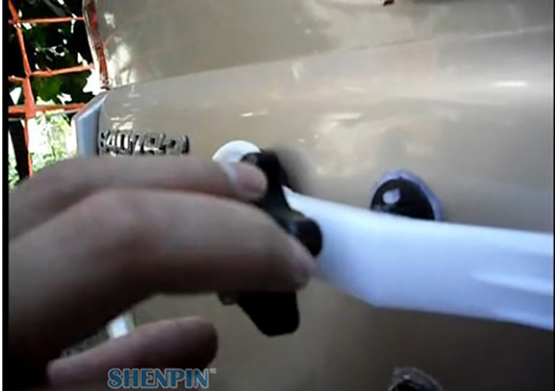 8、如果被修复的表面凸起了一点,请按照下面的步骤操作:用大拇指来回摩擦凸起点直到凸起点跟其他表面一样平;如果用大拇指不能让凸起点恢复平整,就要用敲击棒(握笔的姿势)轻轻地凸起点,直至凸起点恢复平整。有时候,可能需要重复几次才可以。(注意:使用敲击棒时,不可用力太大)