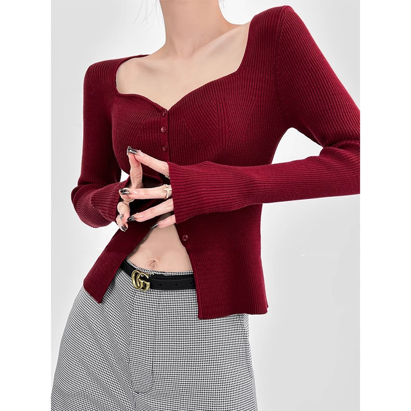 빈티지 버건디 슬림 핏 스웨터 여성용 겨울 스퀘어 칼라 웨이브 칼라 버클 슬릿 베이스 탑