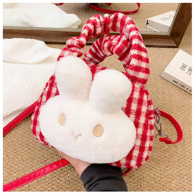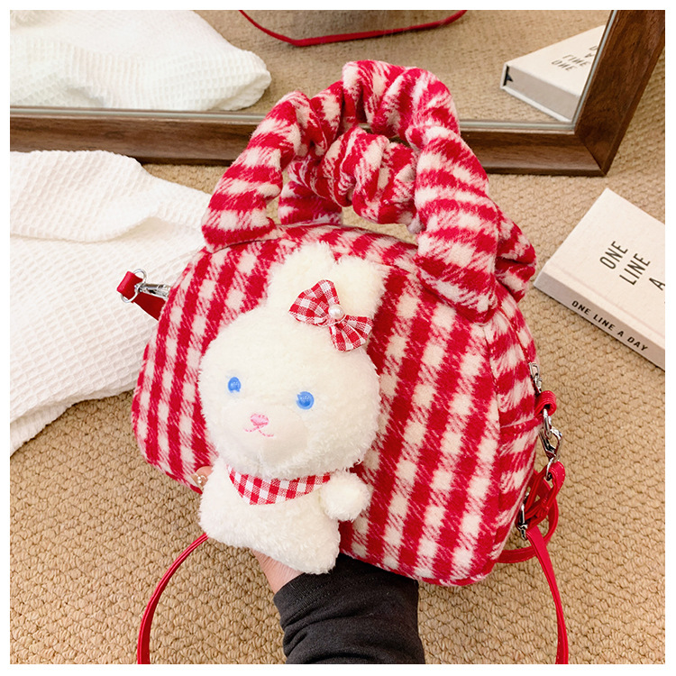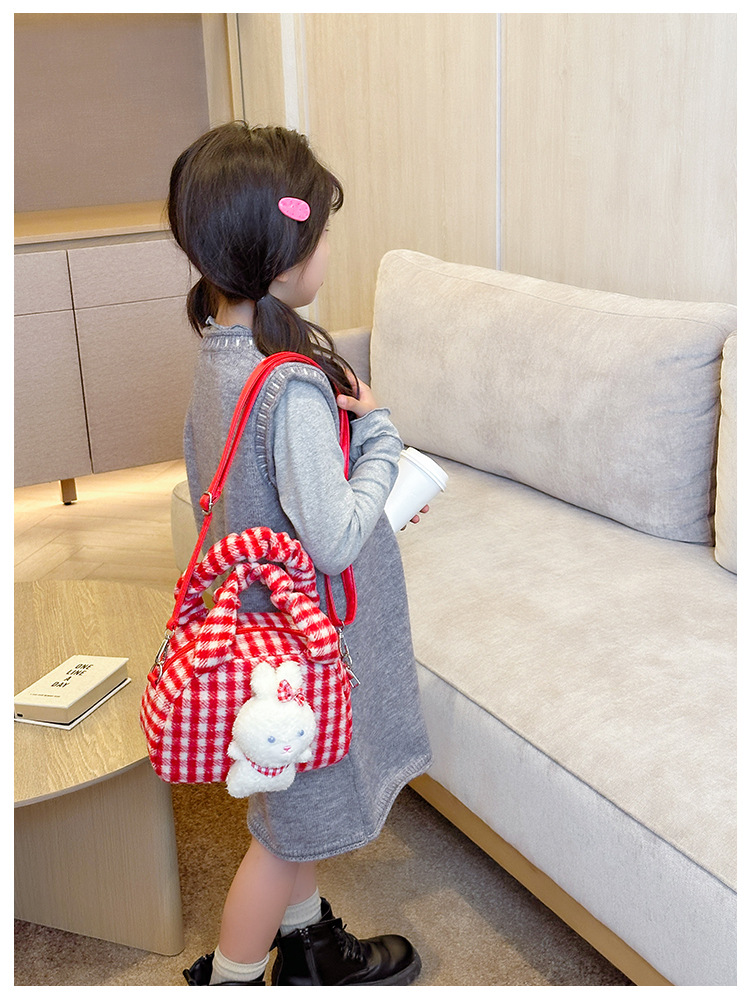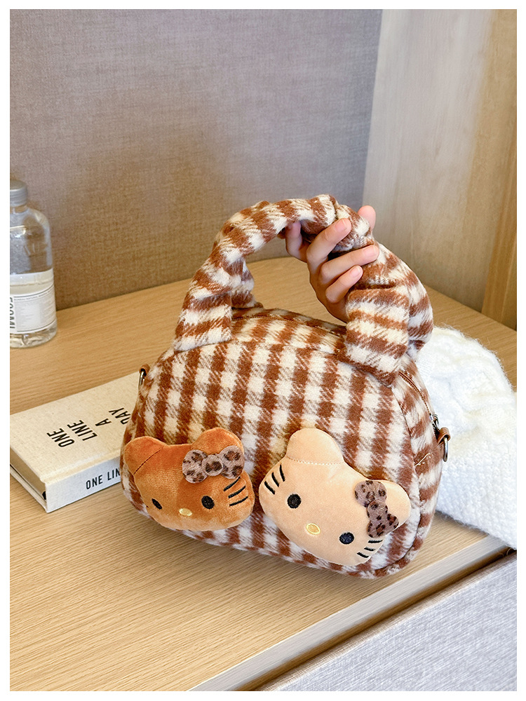 귀여운 공주 핸드백 패션 만화 모직 격자 무늬 핸드백 인형 액세서리 소녀 아기 크로스 바디 가방