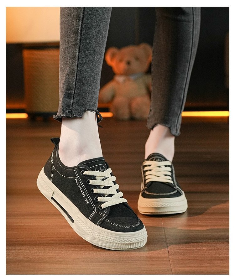 새로운 한국식 캔버스 신발 여성 봄 통기성 플랫 바텀 스포츠 캐주얼 여성 신발 학생의 경량 로우 탑 블랙 천 신발스토어 가기