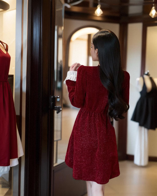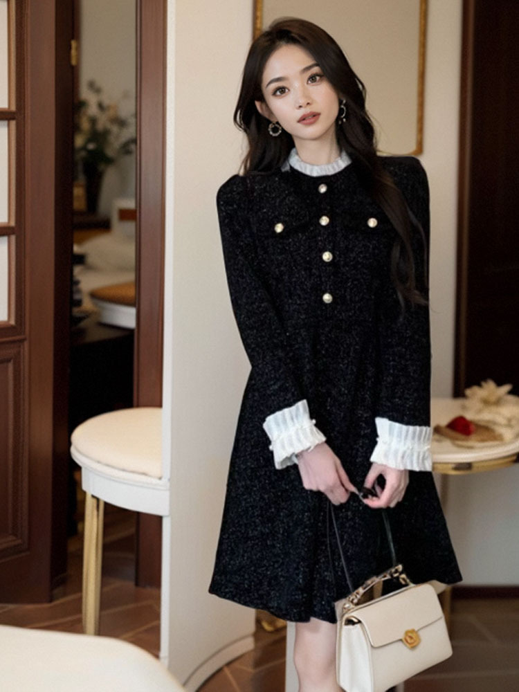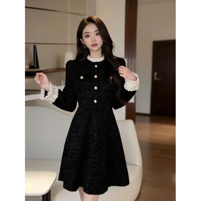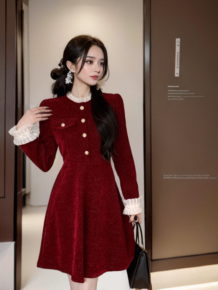 프랑스 스타일의 우아한 벨벳 긴팔 원피스 여성의 2024 가을과 겨울 새로운 작은 하이 엔드 허리 슬리밍 스커트스토어 가기