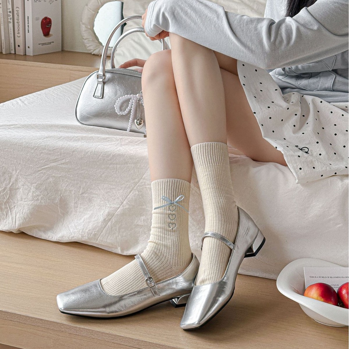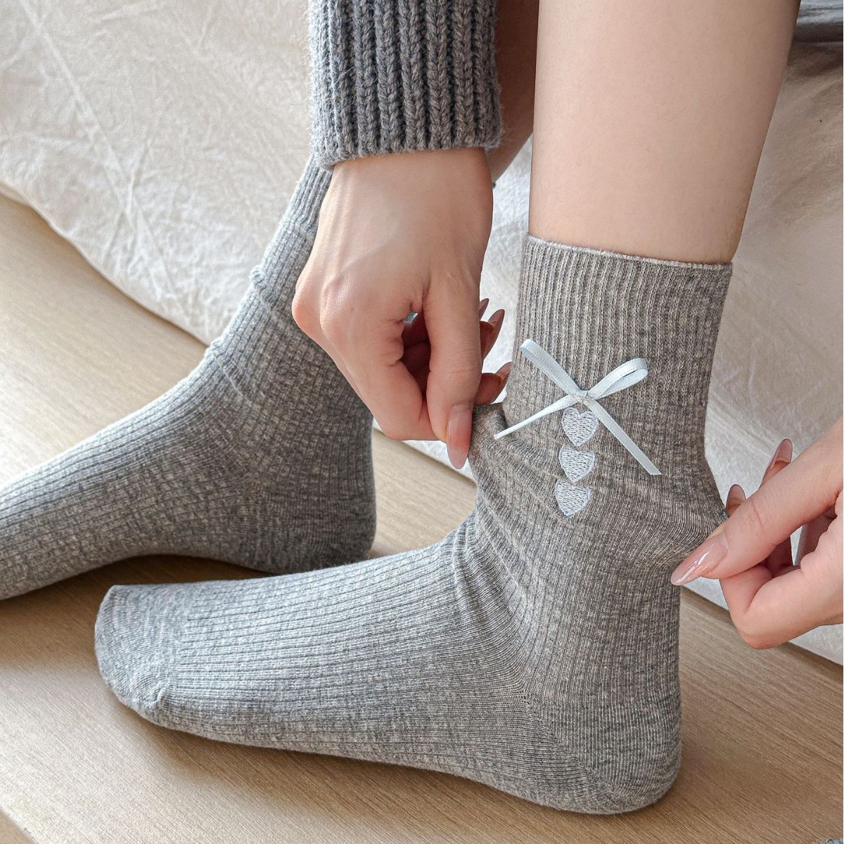 봄 2025 새로운 신장 면 리본 사랑 회색 중간 길이 스타킹 여성을위한 모든 경기 스타킹스토어 가기