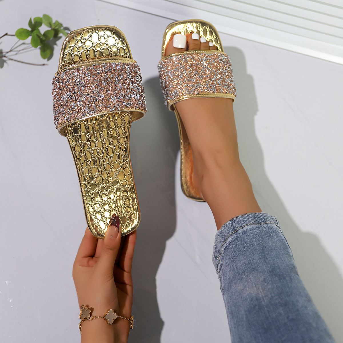 국경 간 대외 무역 여름 플러스 사이즈 슬리퍼 플랫 라인스톤 샌들 슬리퍼 매일 패션 여성 샌들스토어 가기