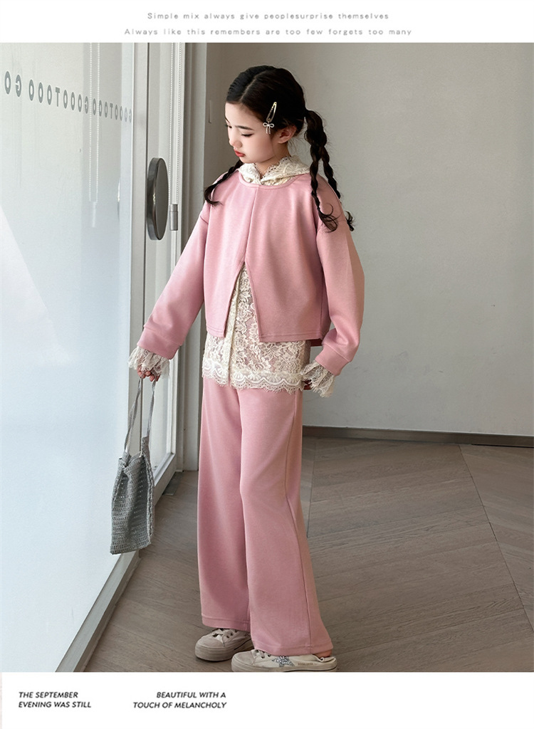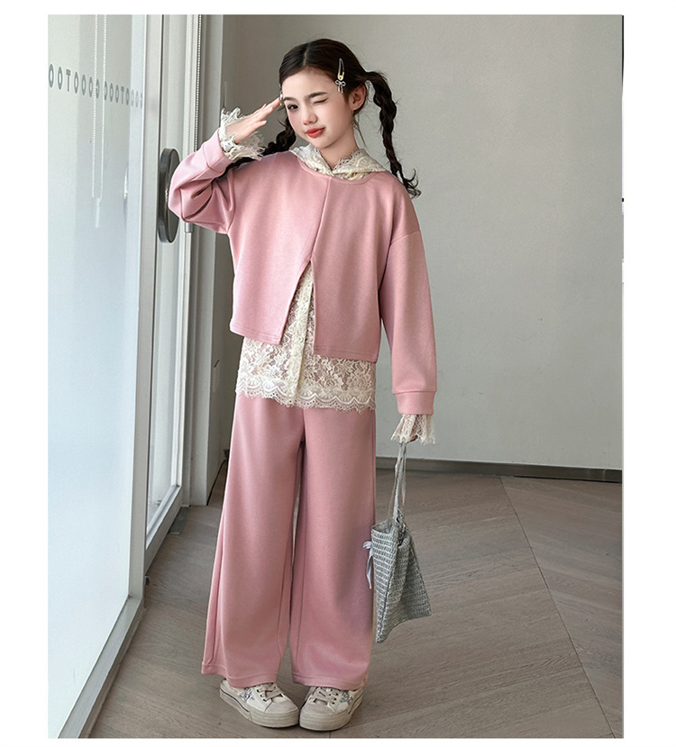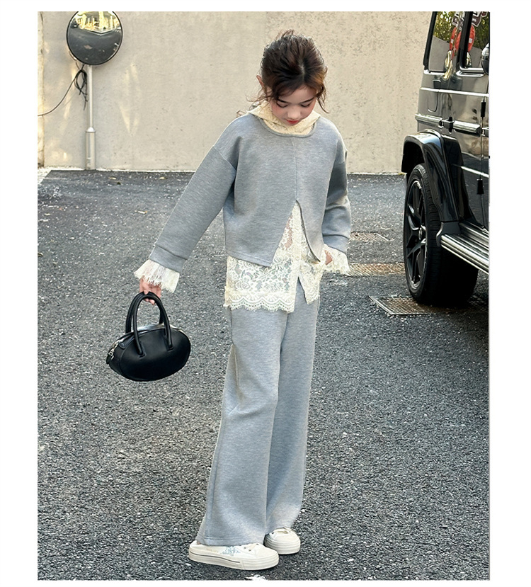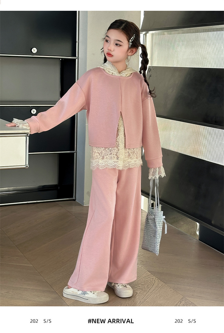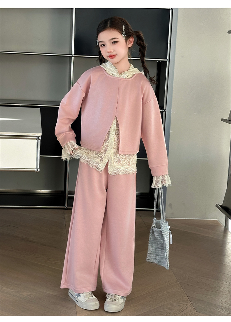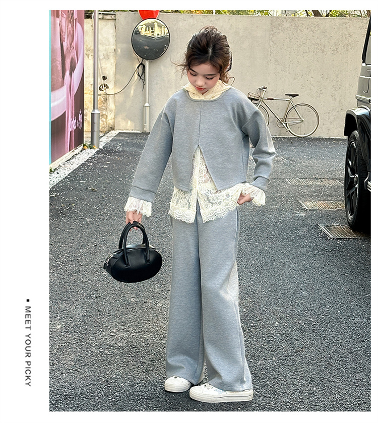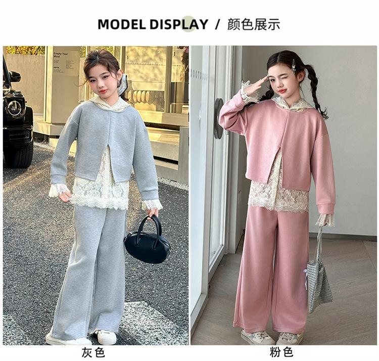 소녀의 봄과 가을 세트 2025 새로운 스타일 유행 대형 아동복 레이스 스웨트 와이드 레그 바지 3 피스 세트스토어 가기