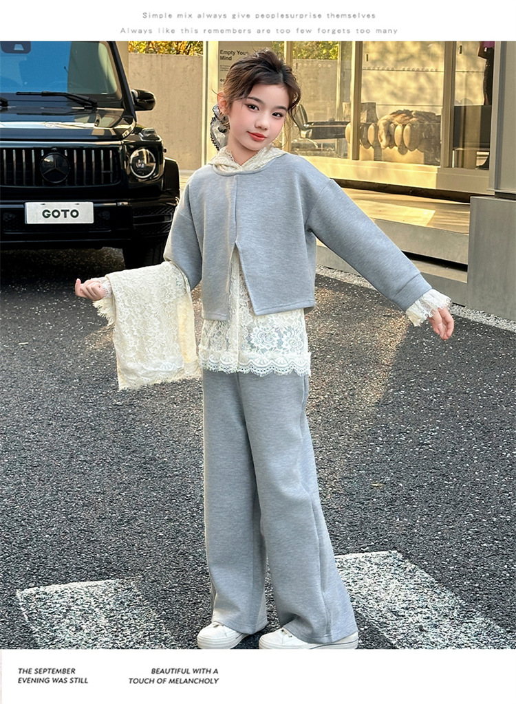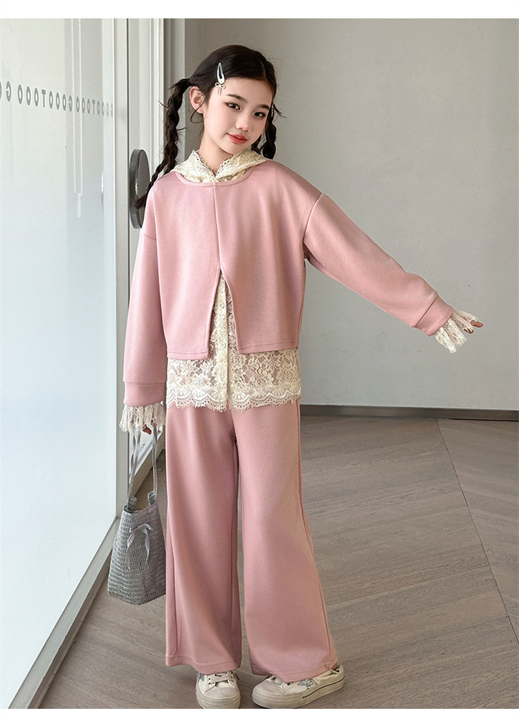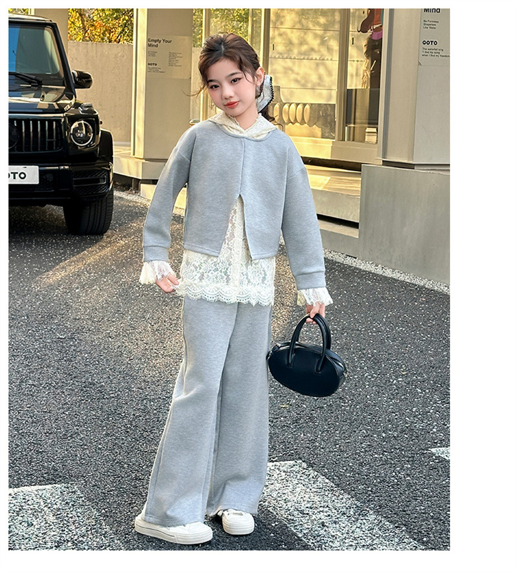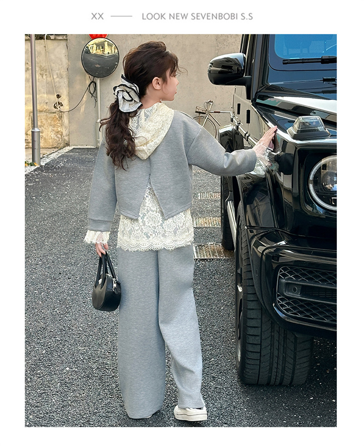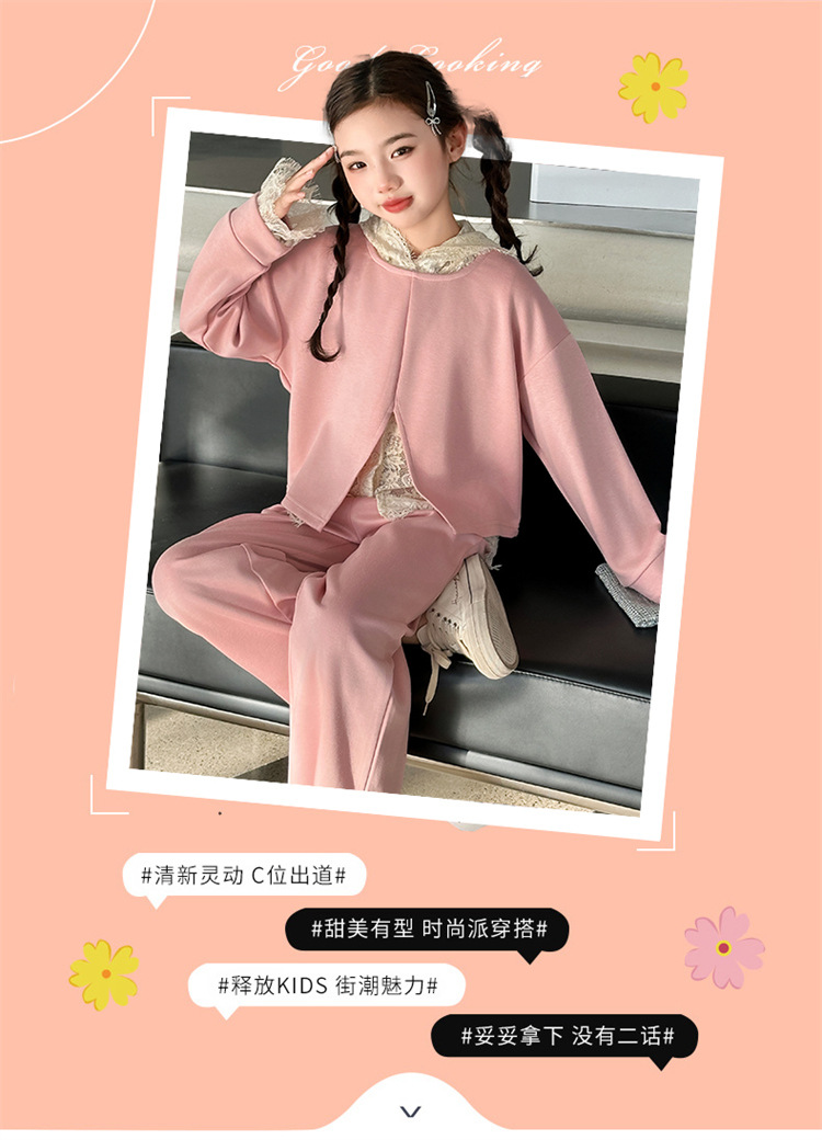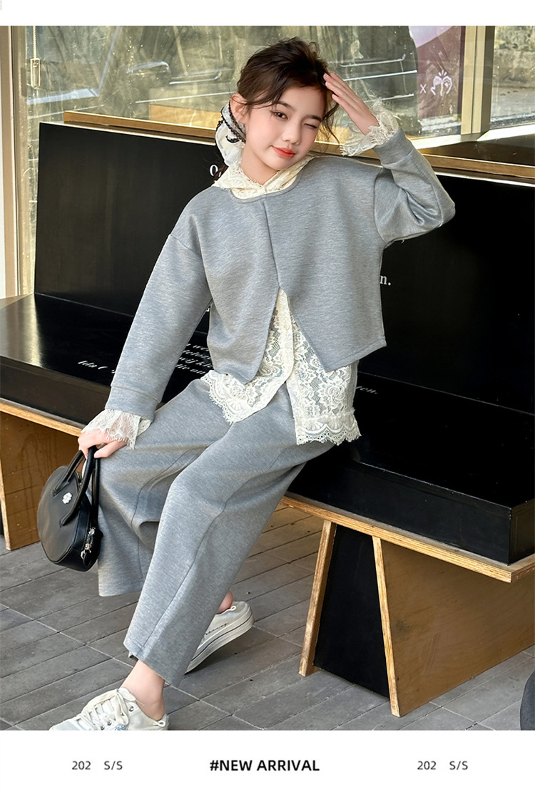 소녀의 봄과 가을 세트 2025 새로운 스타일 유행 대형 아동복 레이스 스웨트 와이드 레그 바지 3 피스 세트스토어 가기