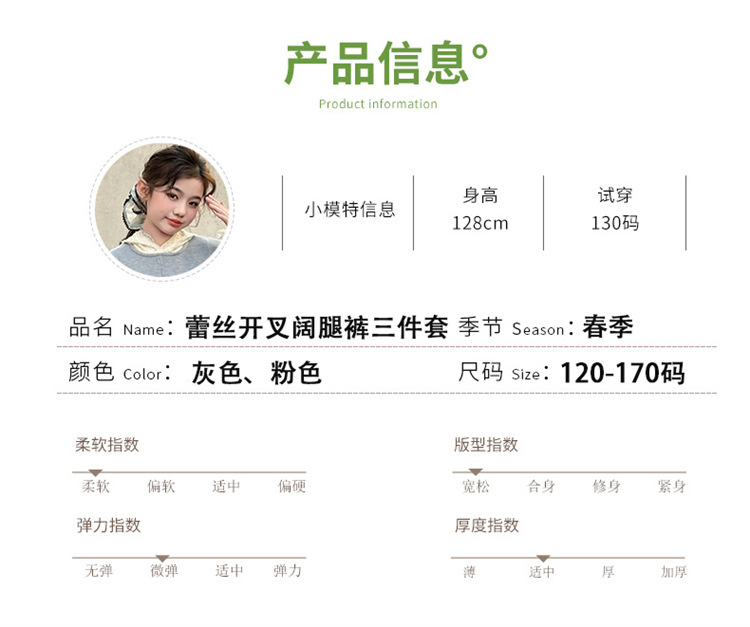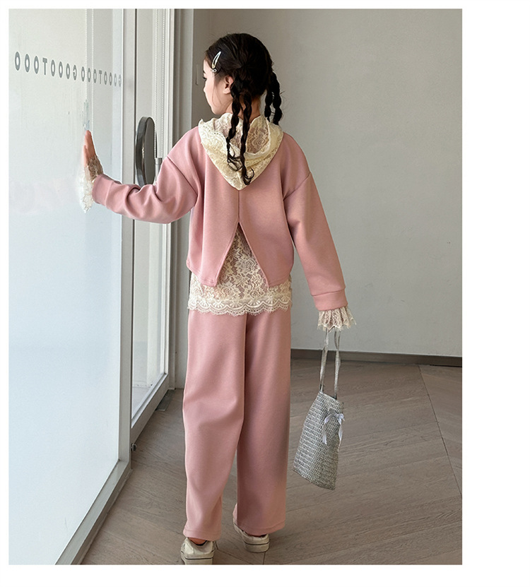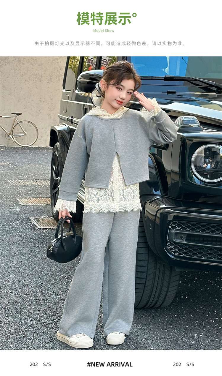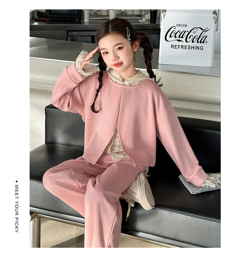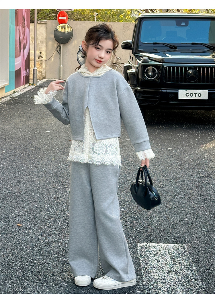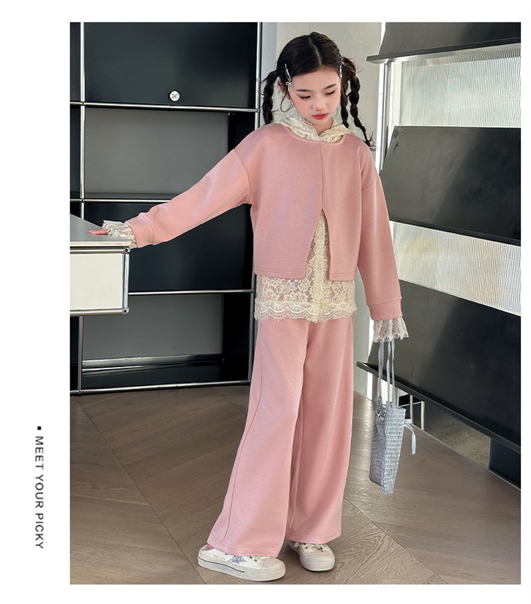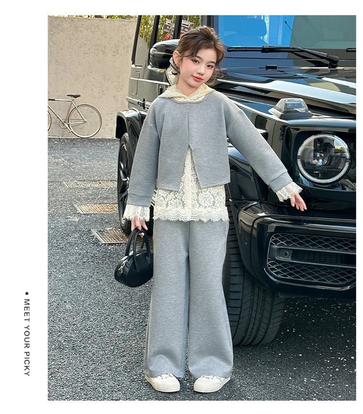 소녀의 봄과 가을 세트 2025 새로운 스타일 유행 대형 아동복 레이스 스웨트 와이드 레그 바지 3 피스 세트스토어 가기