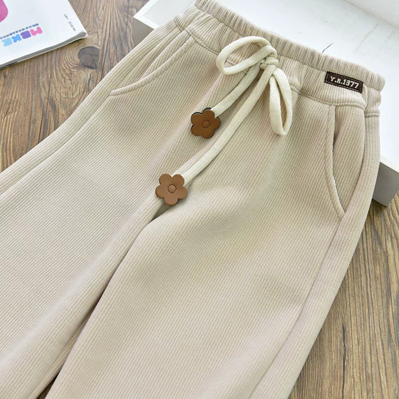 코듀로이 기모 소년 소녀를위한 두꺼운 넓은 다리 바지 중 및 대형 어린이 스트레이트 바지 가을 및 겨울 서양식 캐주얼 바지