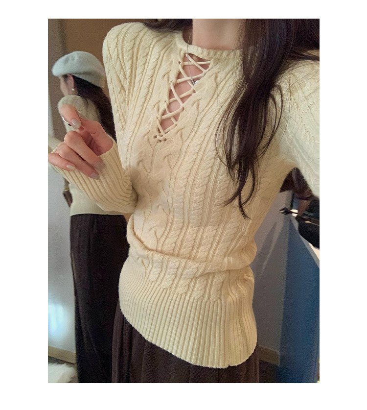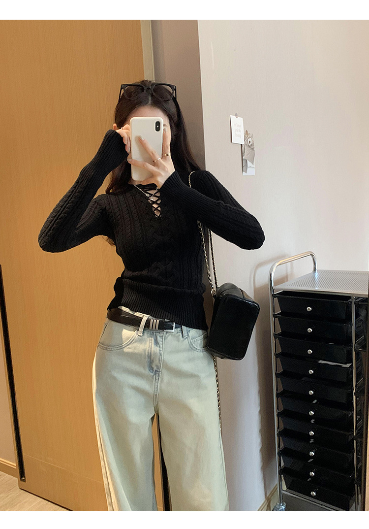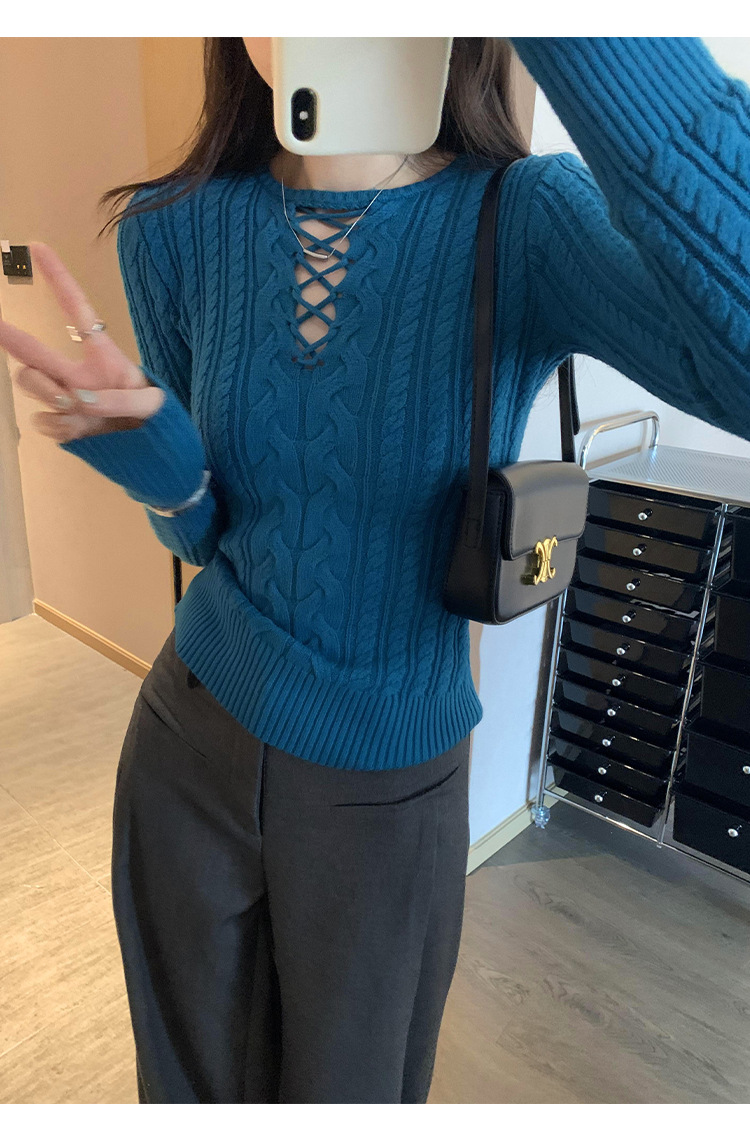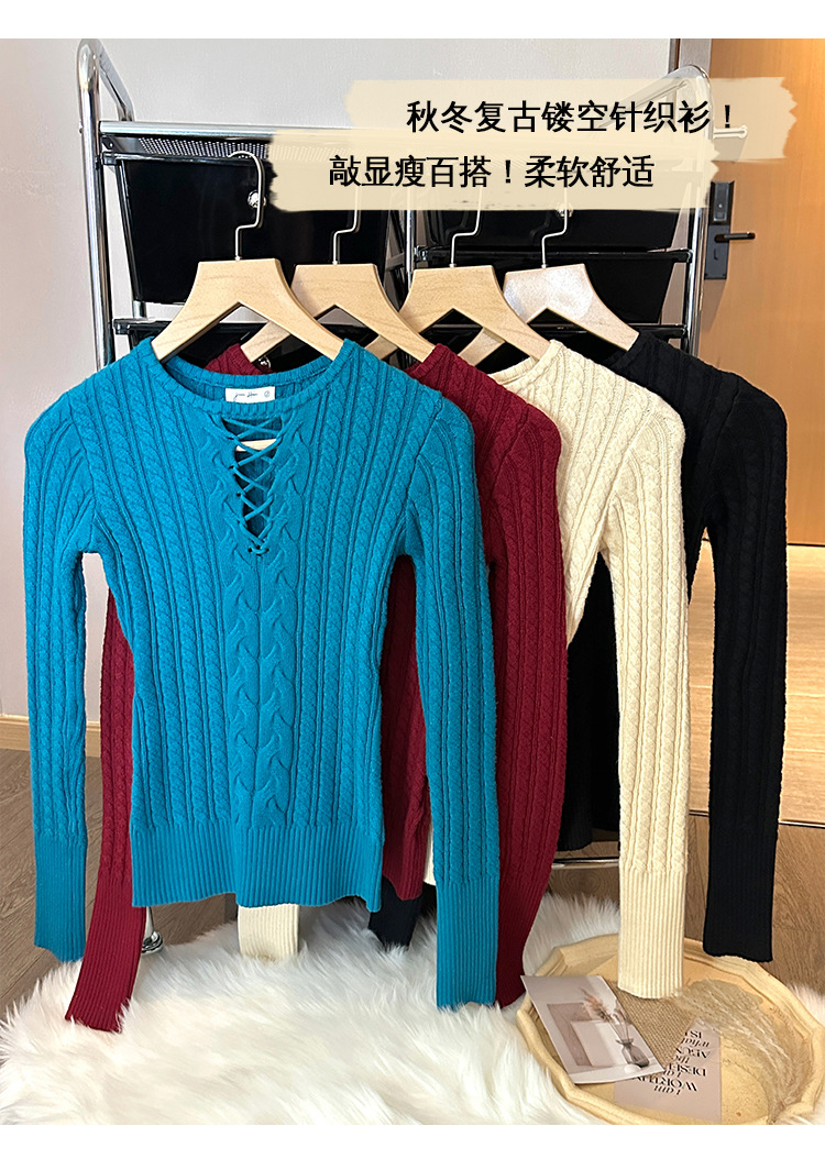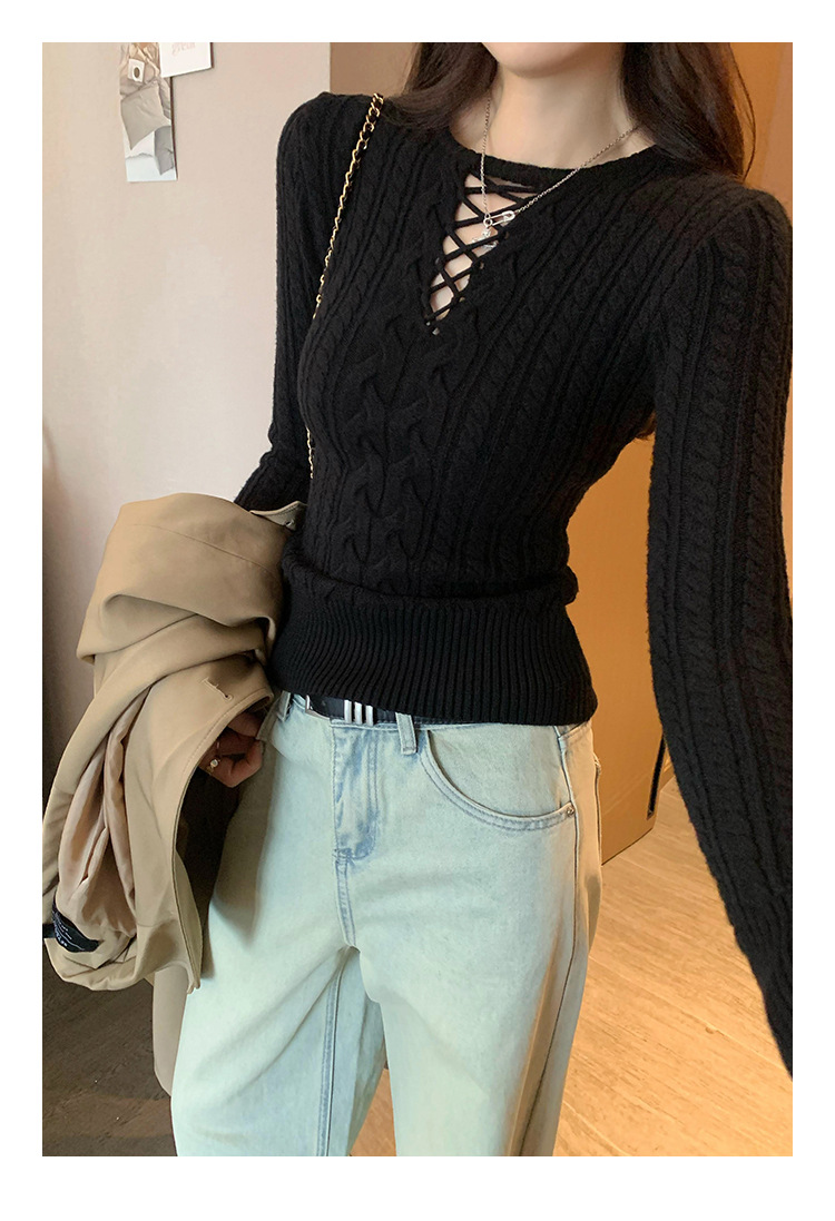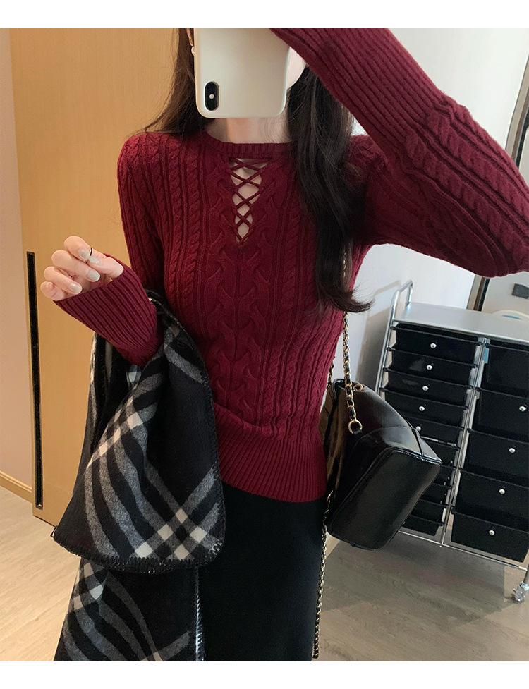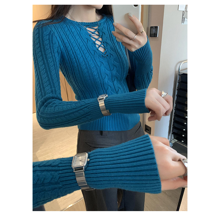 한국식 하이 엔드 할로우 아웃 내베이스 셔츠 니트 스웨터 여성용 2024 년 새 겨울 슬림 핏 트위스트 탑