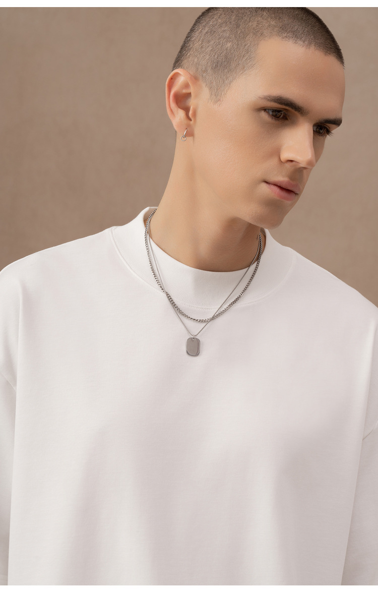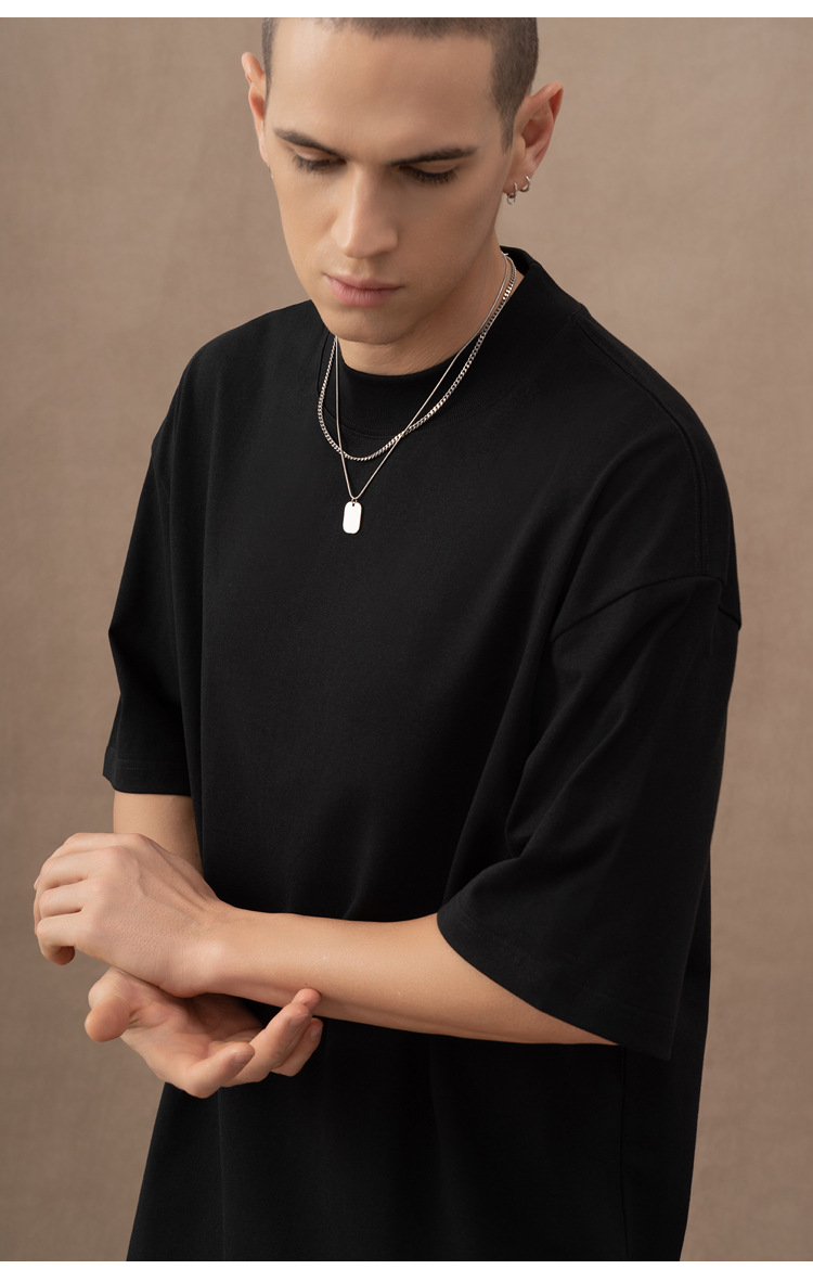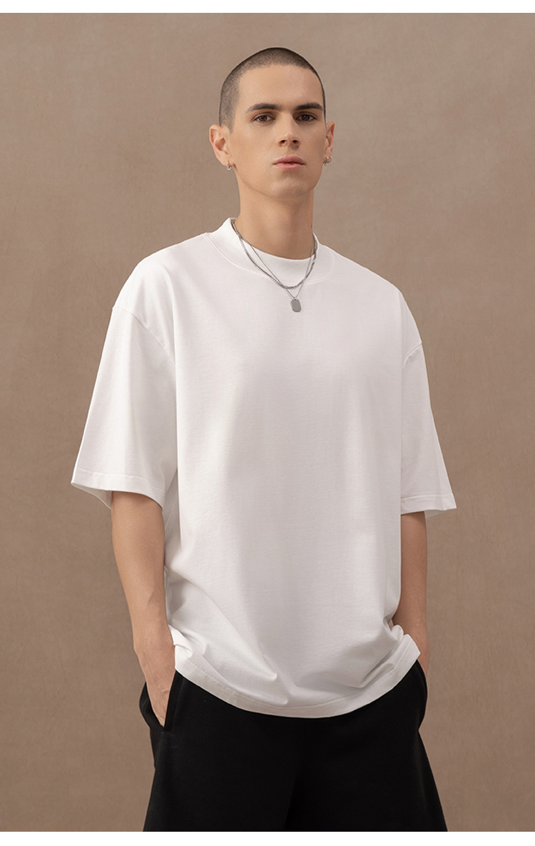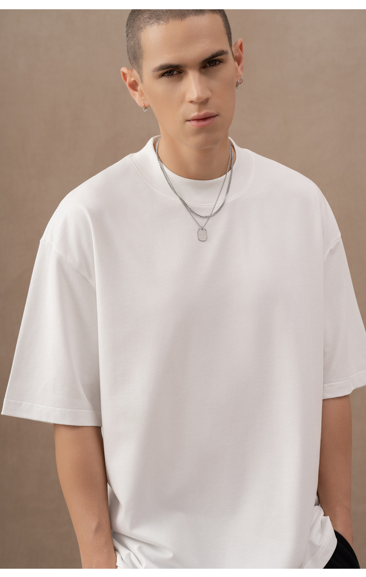 310g 반 높은 목 프로필 티셔츠 짧은 소매 남성용 무거운 느슨한 어깨 미니멀리스트 퓨어 컬러 코튼 인테리어 특대