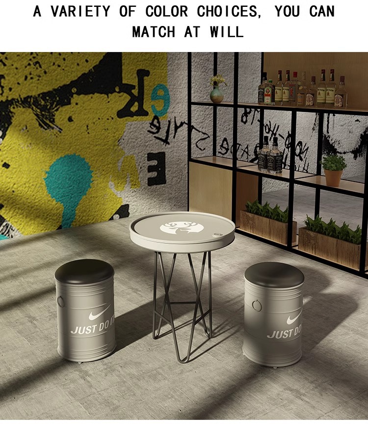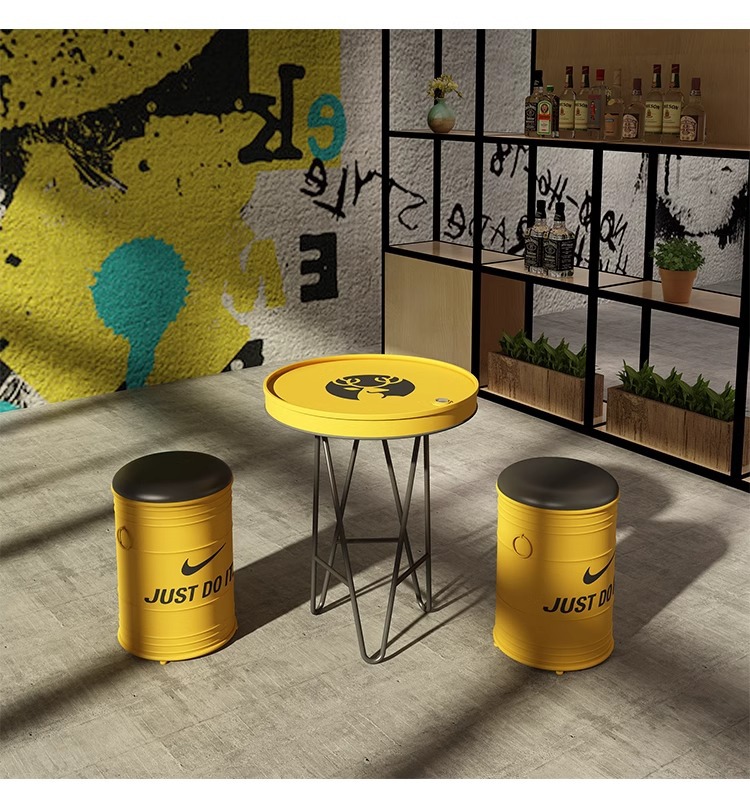 빈티지 바 케이터링 우유 차 가게 레저 소파 커피 테이블 창조적 인 산업 공기 오일 배럴 철 카드 시트 테이블과 의자 조합