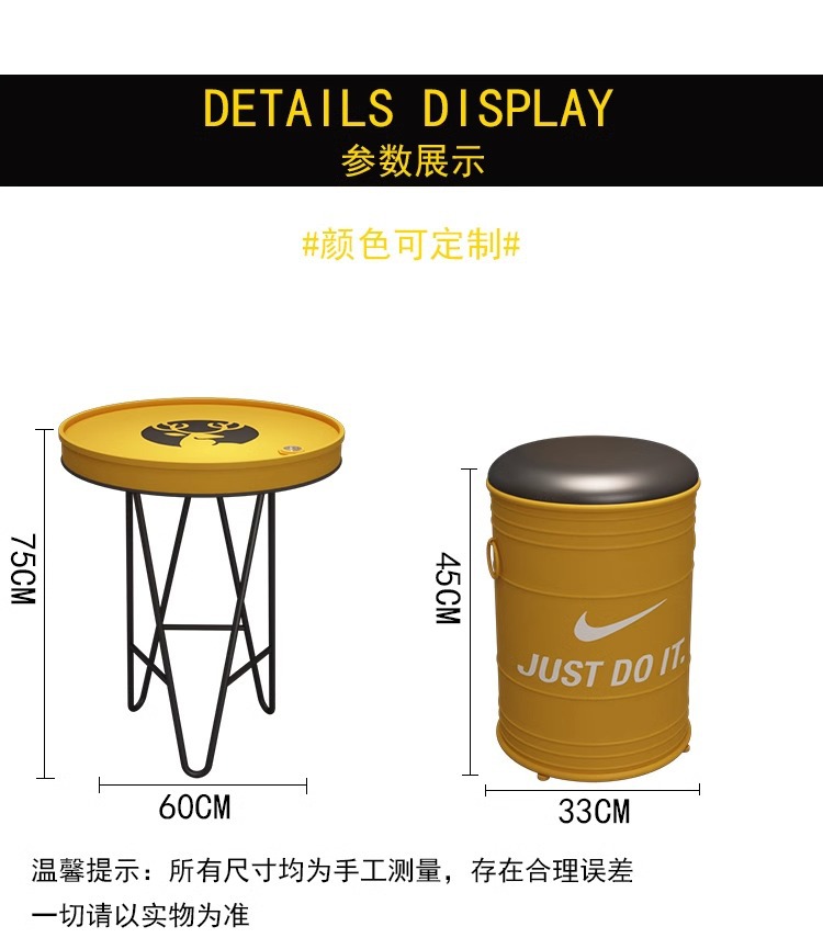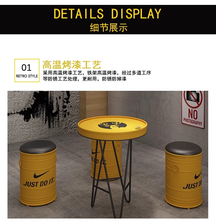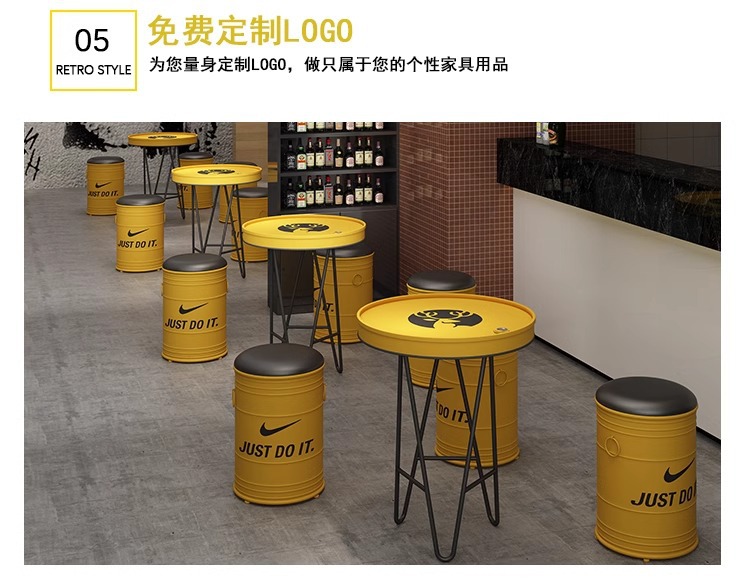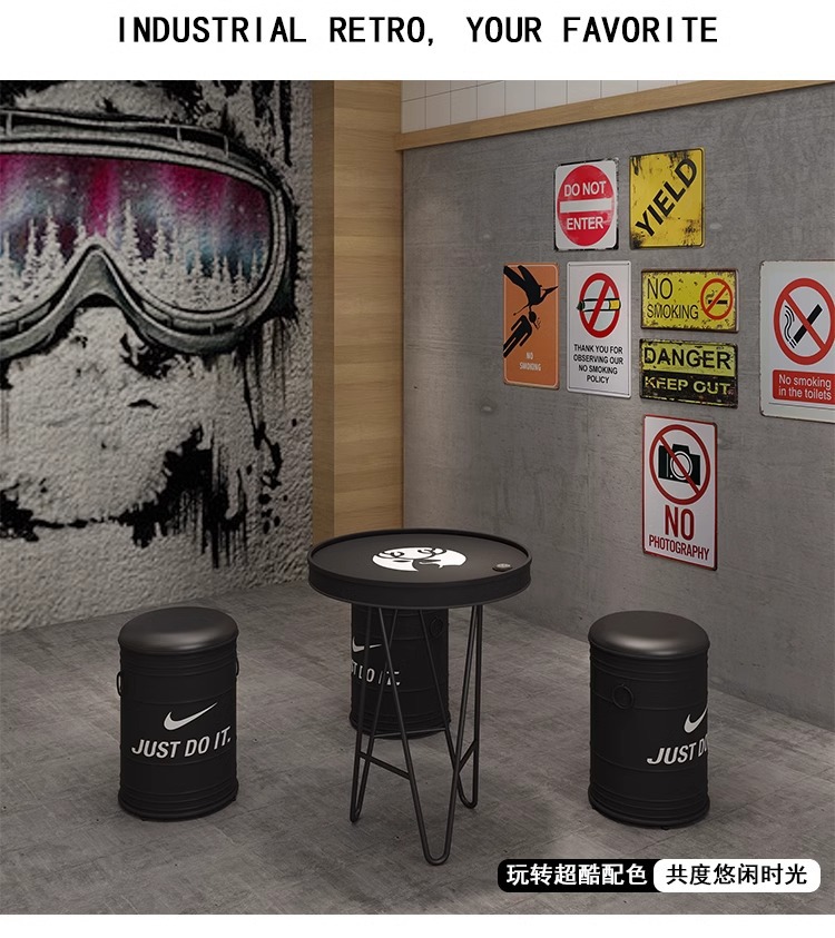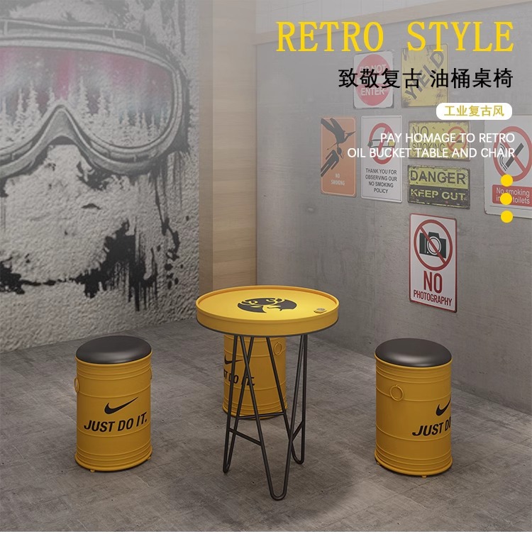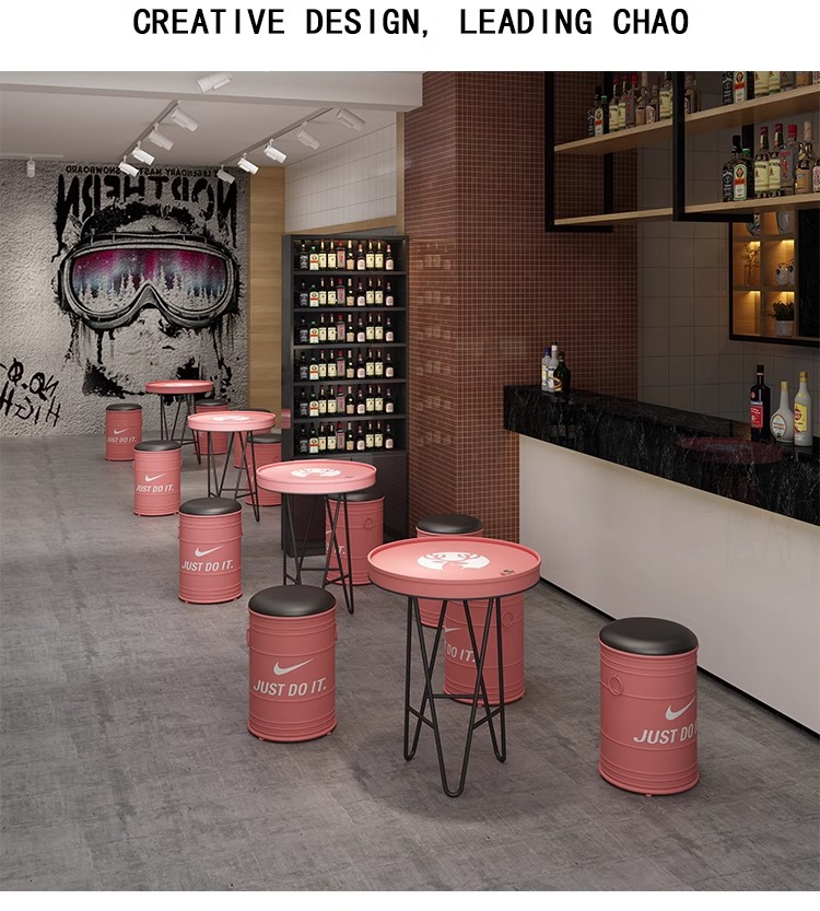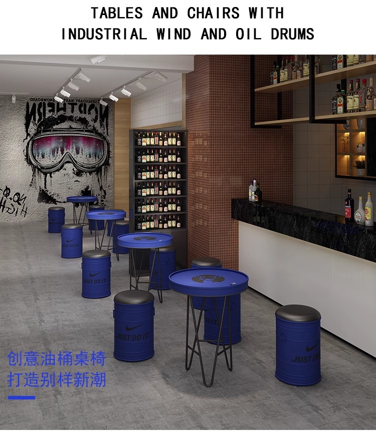 빈티지 바 케이터링 우유 차 가게 레저 소파 커피 테이블 창조적 인 산업 공기 오일 배럴 철 카드 시트 테이블과 의자 조합스토어 가기