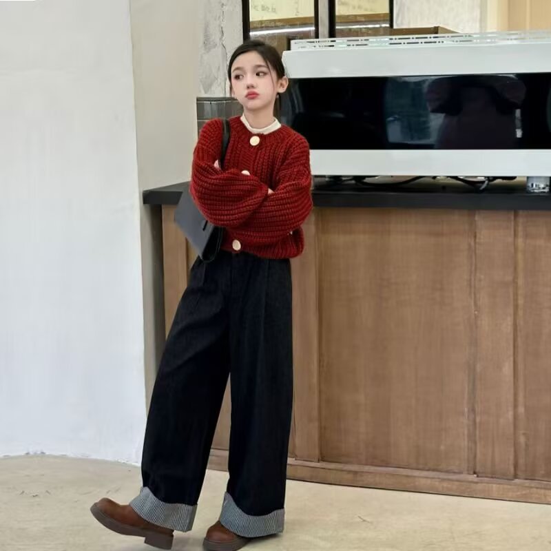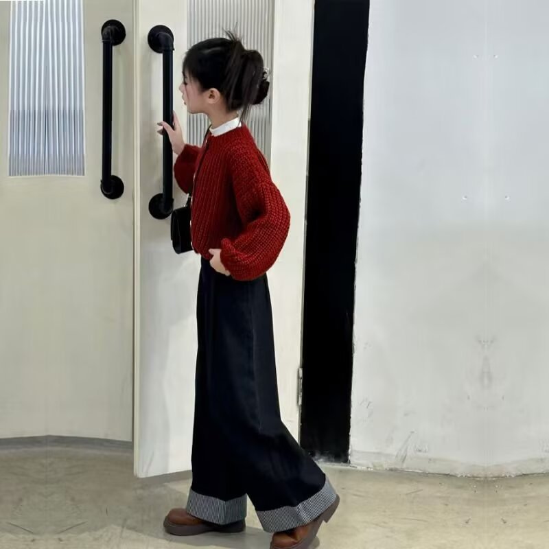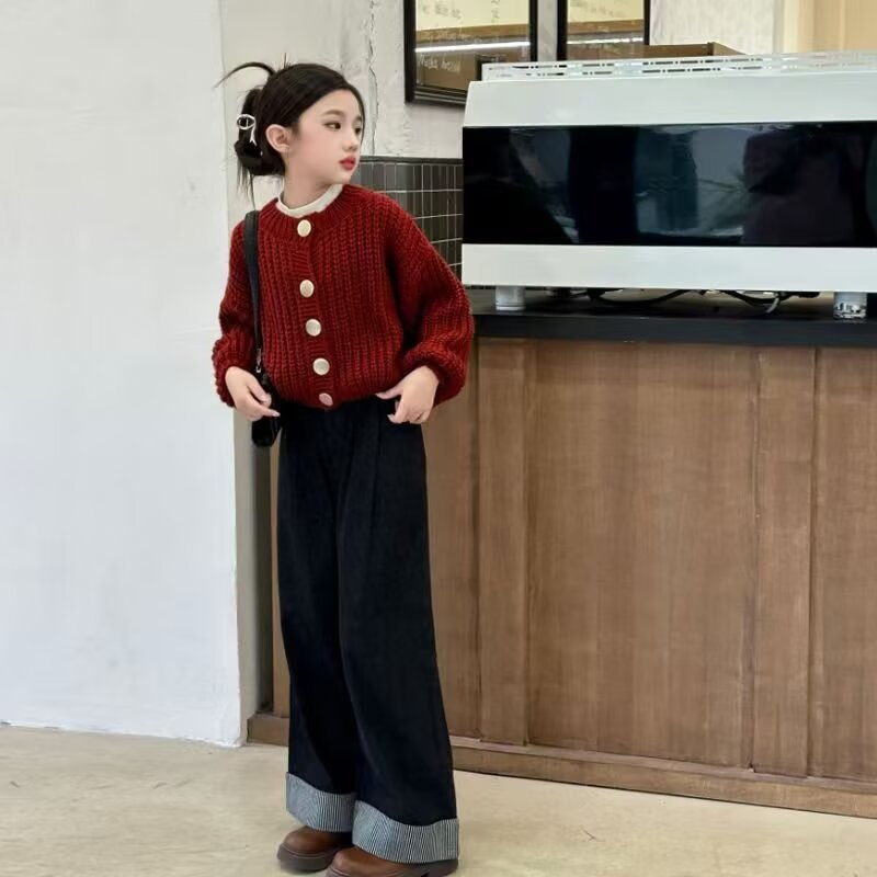 소녀 스웨터 코트 2024 년 가을 겨울 새로운 소녀 서양식 빨간 니트 어린이 두꺼운 카디건 탑스토어 가기