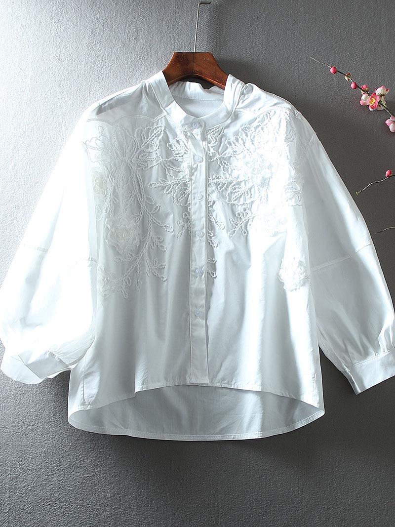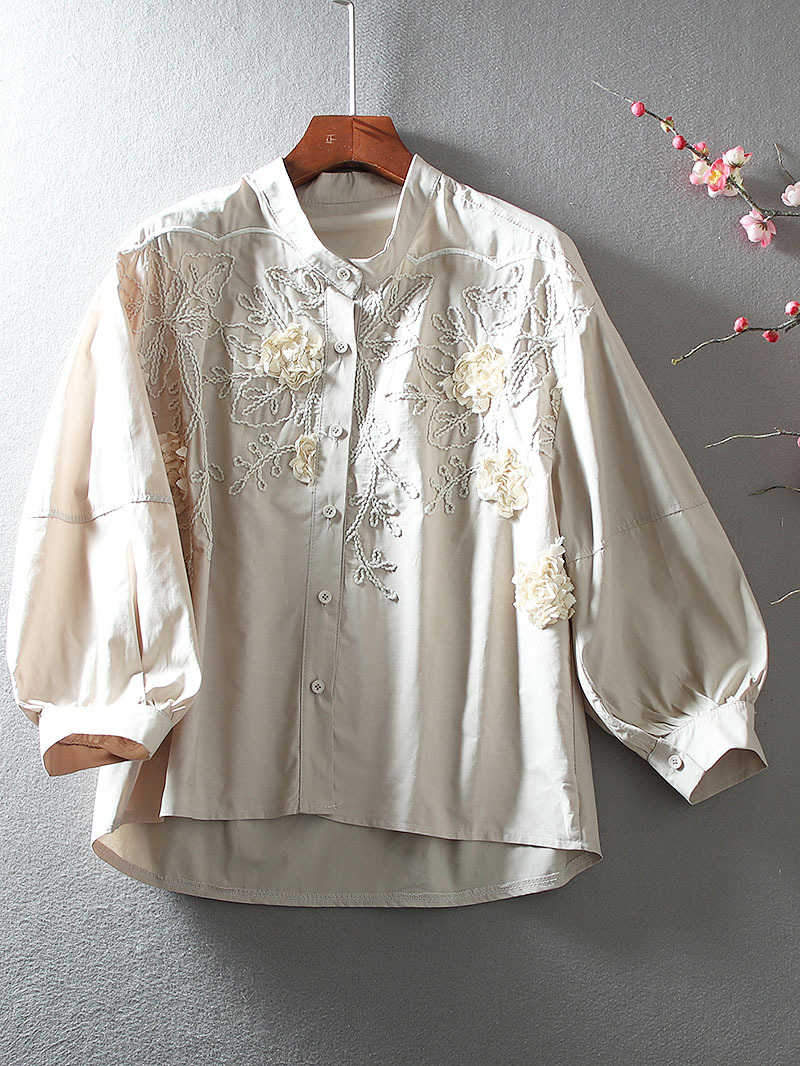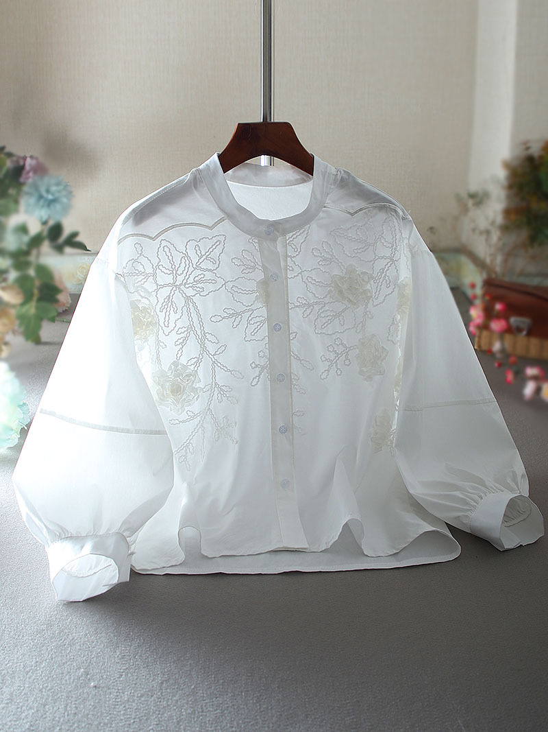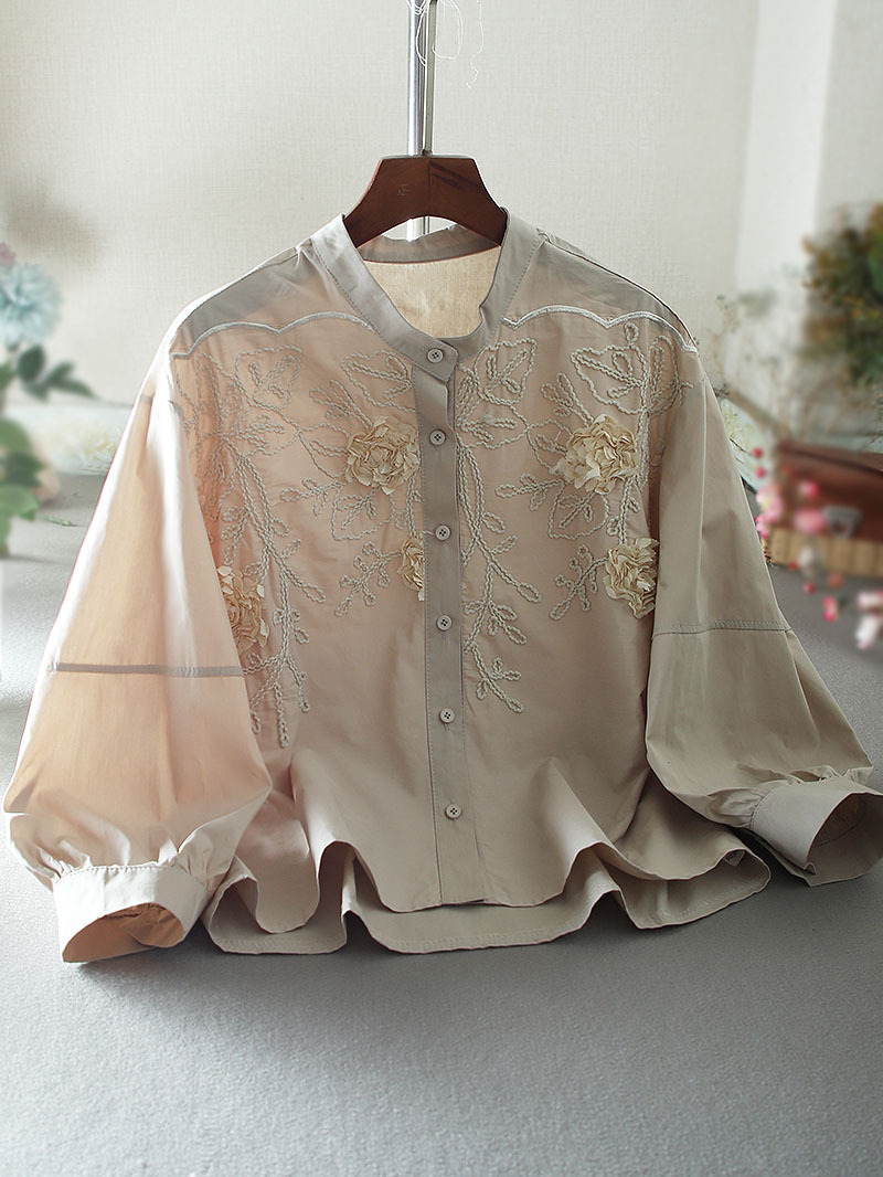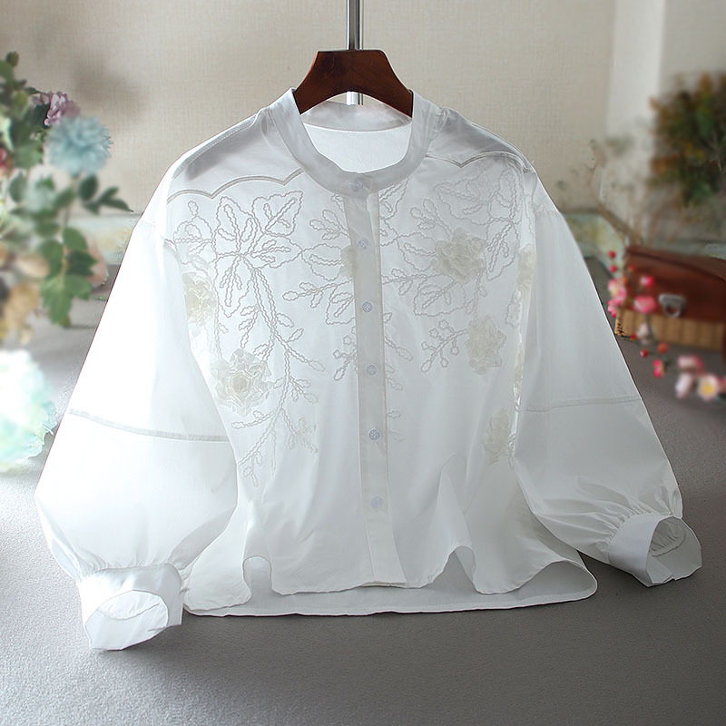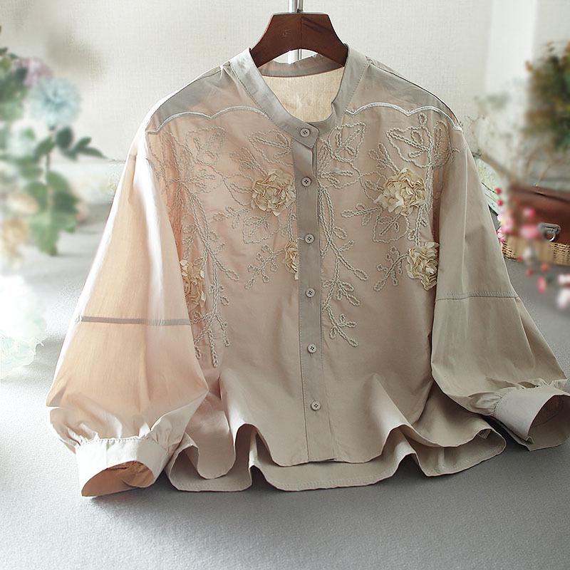 수직 칼라 레트로 중공업 짧은 랜턴 소매 느슨한 문학 스타일 셔츠 캐주얼 셔츠 봄 여성 탑