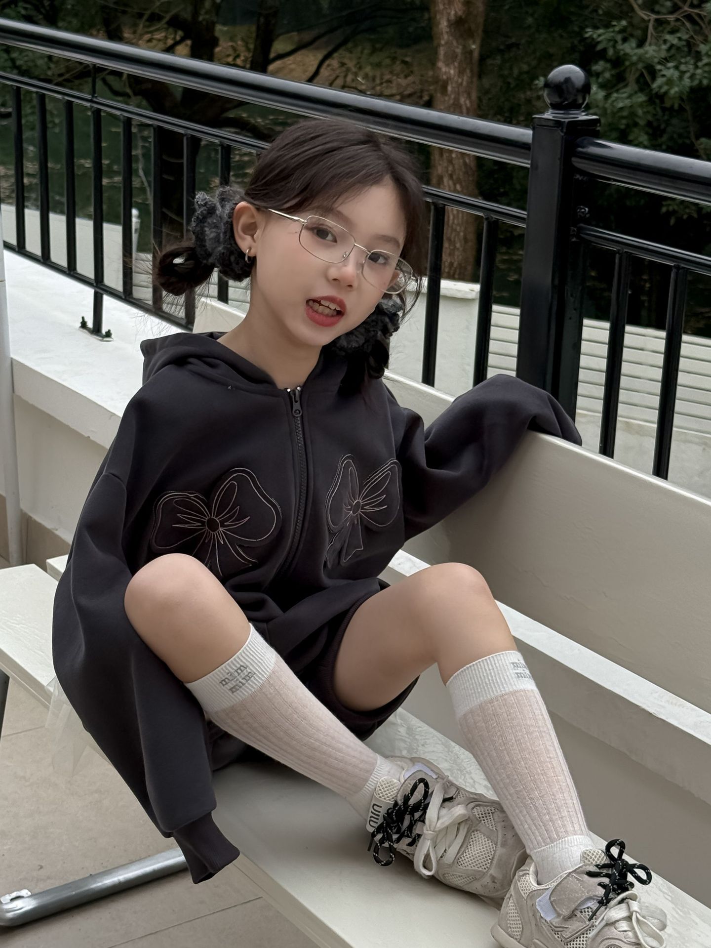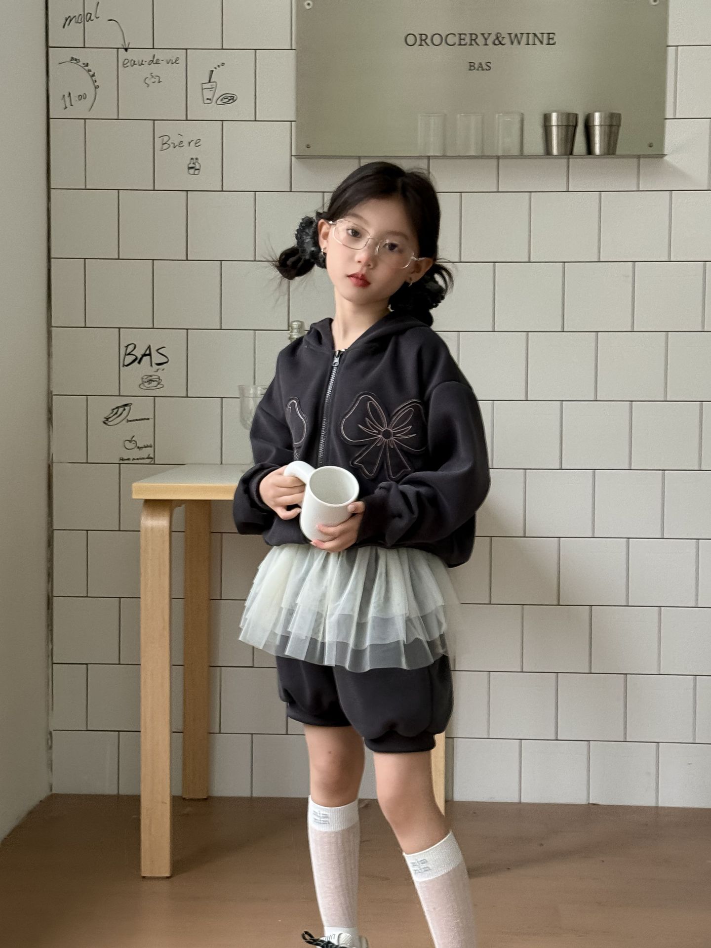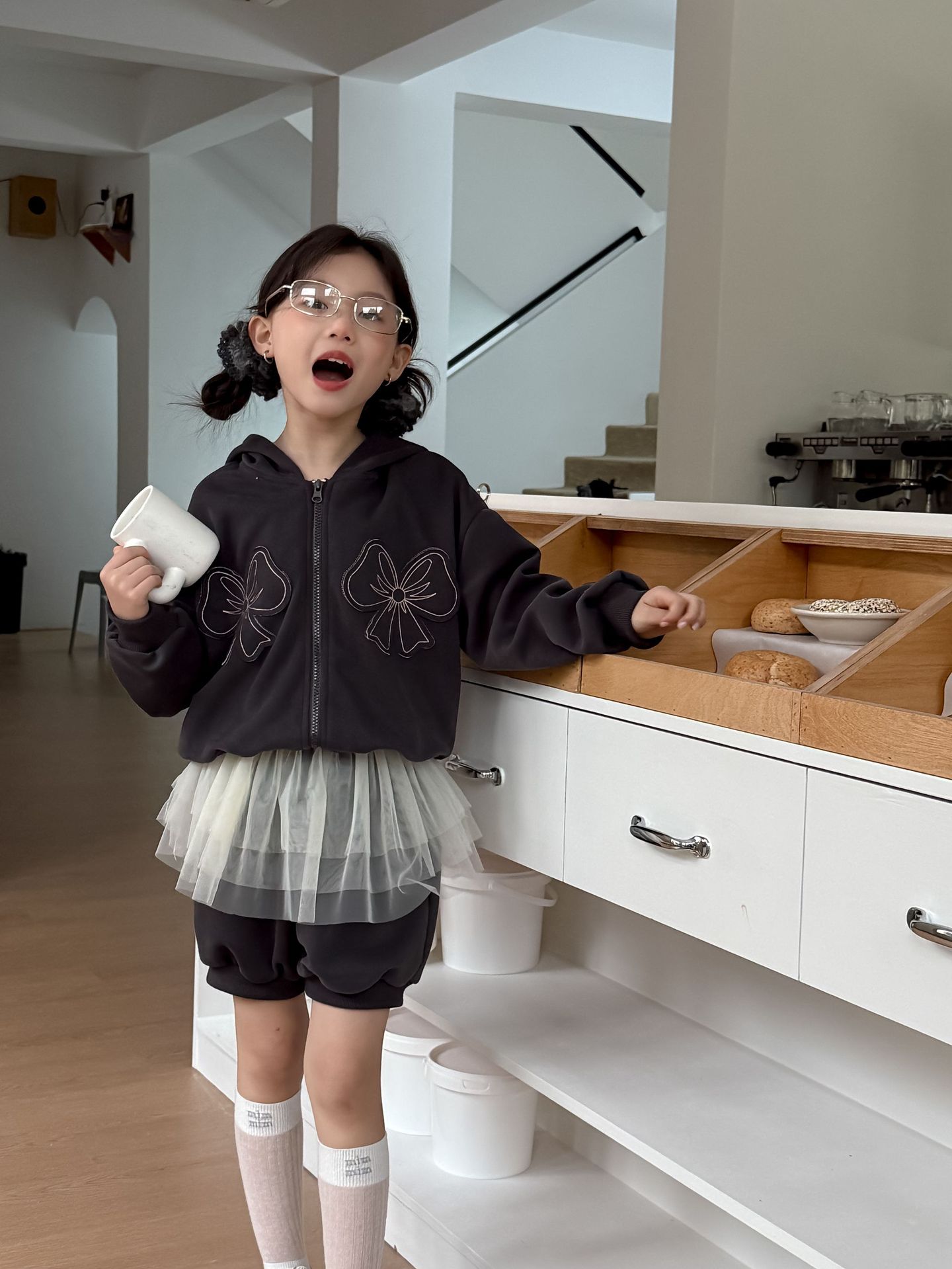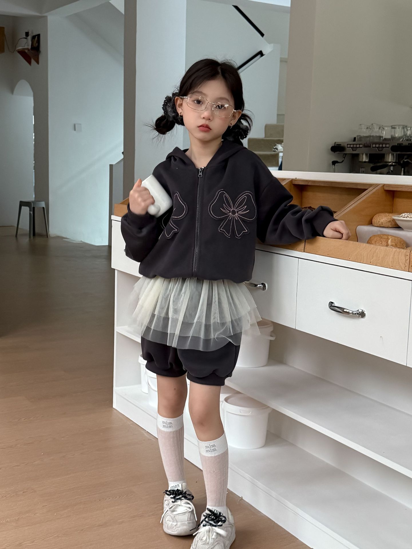 어린이 세트 2025 봄 귀여운 소녀의 활 자수 후드 카디건 재킷 반바지 원사 앞치마 3 피스 세트