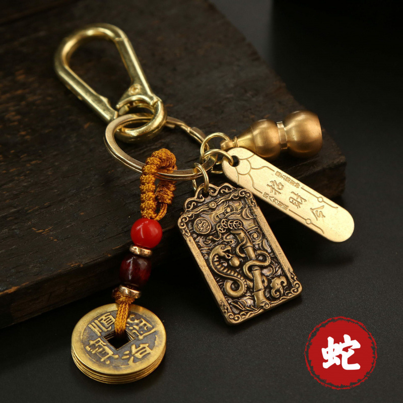 • 십이지 뱀 + 오제 동전 + 구리 조롱박 + 행운의 주문 + 카라비너 - 황동 스타일