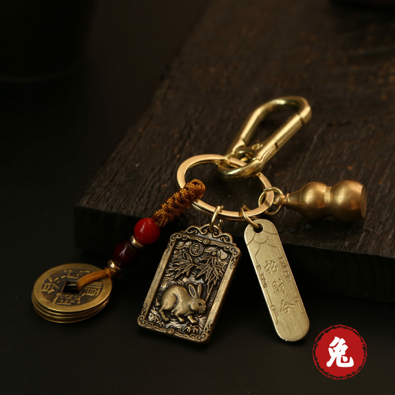 • 조디악 토끼 + 오제 동전 + 구리 조롱박 + 행운의 주문 + 카라비너 - 황동 스타일