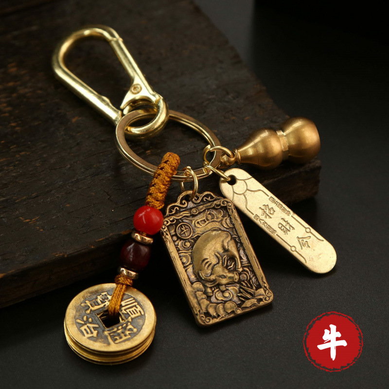 • 조디악 황소 + 오제 동전 + 구리 조롱박 + 행운의 주문 + 카라비너 - 황동 스타일