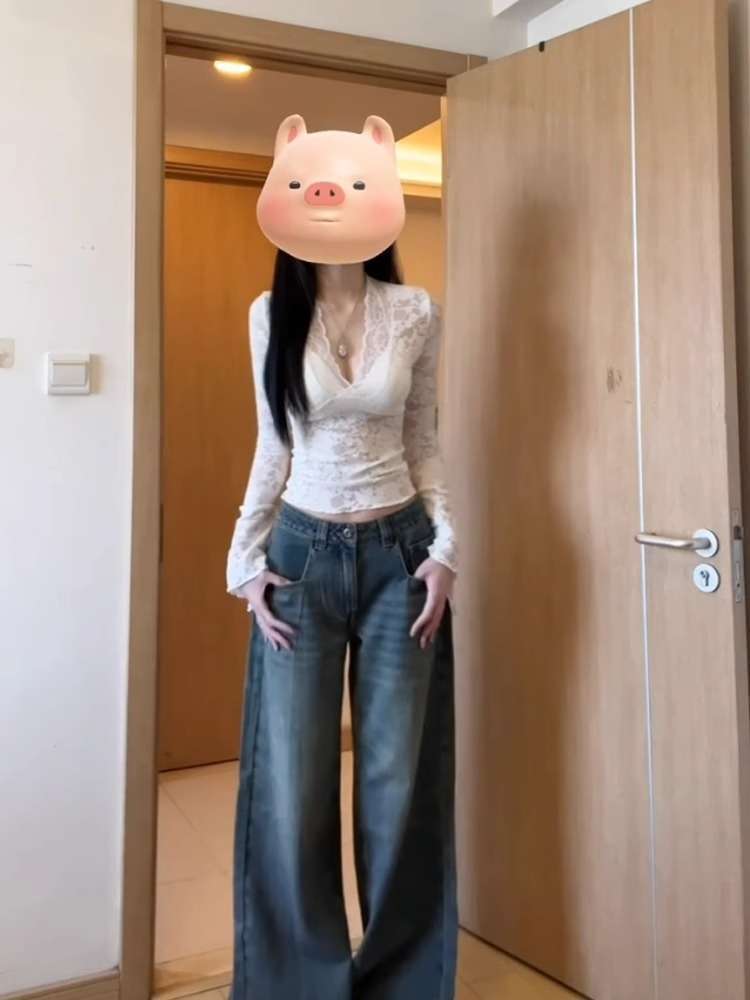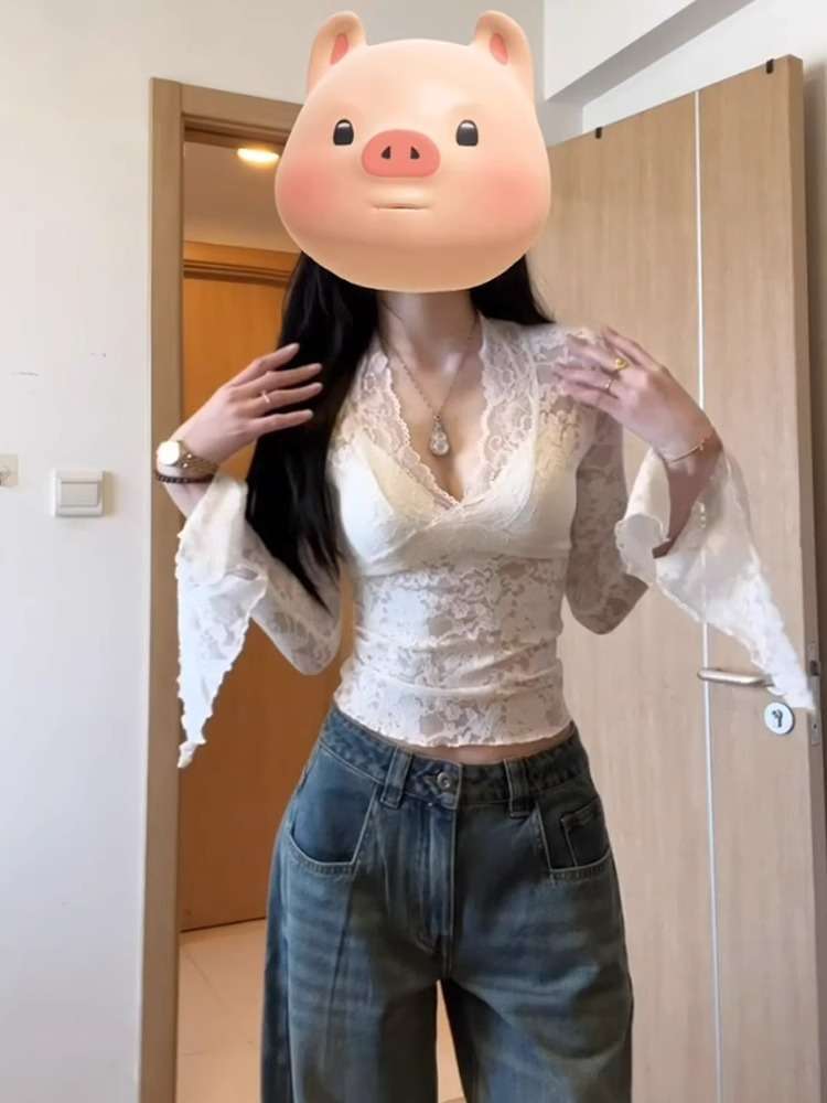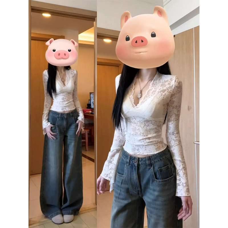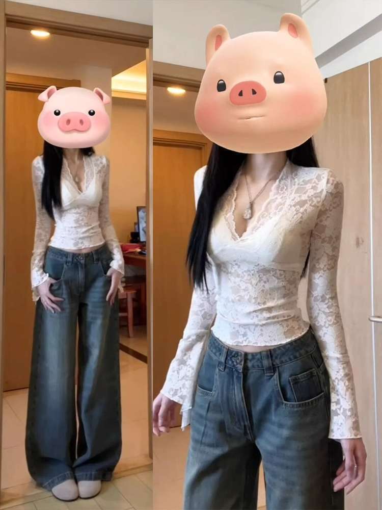 가을 2024 새로운 순수한 섹시한 레이스 로우 컷 칼라 화이트 베이스 셔츠 여성의 세련된 스파이스 소녀 긴 소매 탑스토어 가기