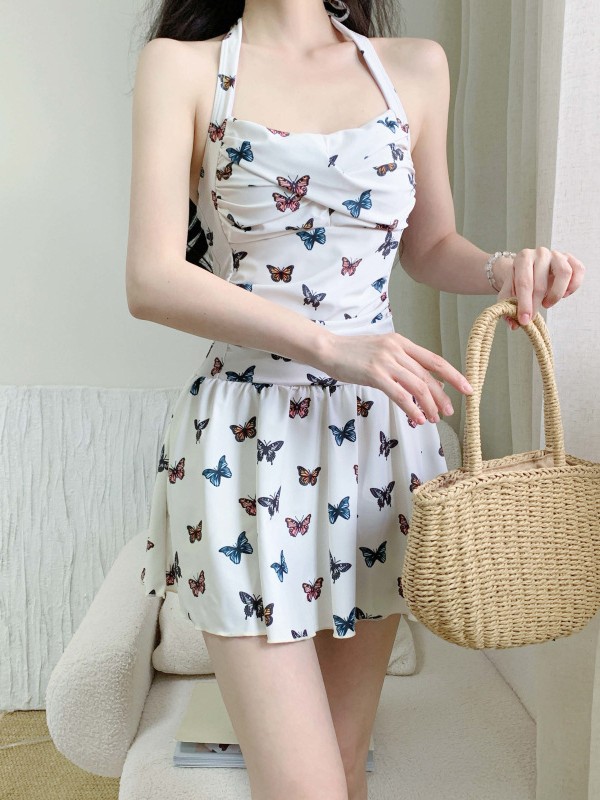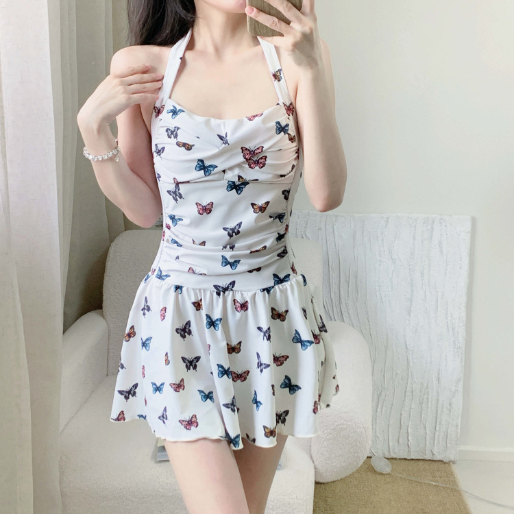 새로운 스타일 순수한 욕망 나비 인쇄 보수적 인 학생 통통한 플러스 사이즈 원피스 스커트 수영복 여성 교수형 목 온천스토어 가기
