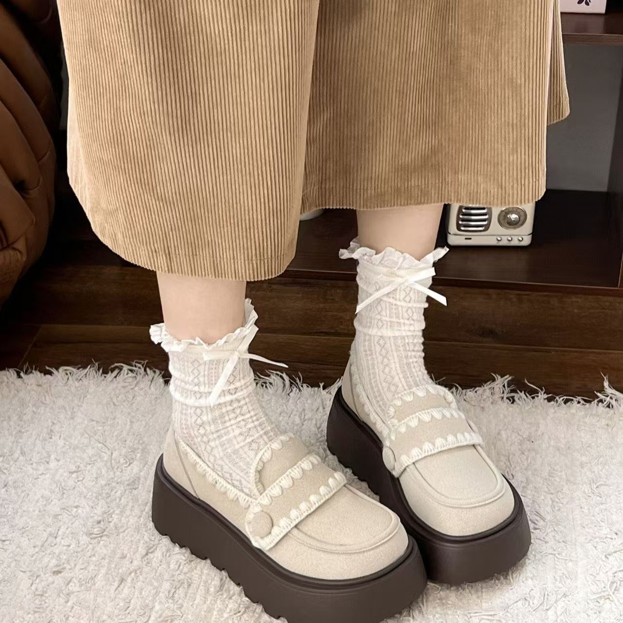 기모 슬립 온 Lefu 가죽 신발 여성의 2024 가을/겨울 새로운 도착 쁘띠 레트로 영국 두꺼운 마오 마오 신발