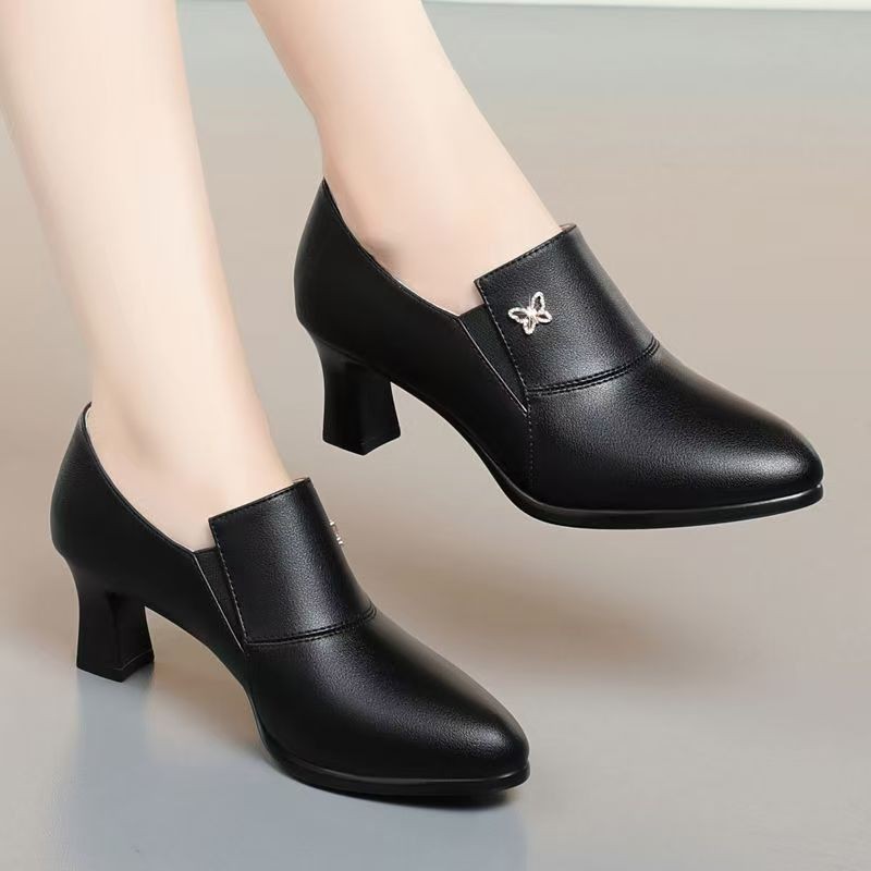 대외 무역 도매 영국 스타일 낮은 입 작은 가죽 신발 뾰족한 패션 통근 신발 여성 2025 새로운 하이힐 재고스토어 가기