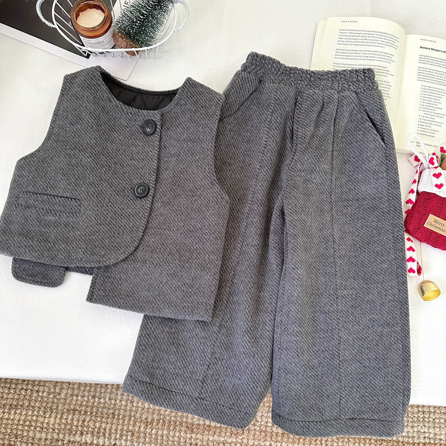 소녀 바지 세트 두꺼운 겨울 2024 새로운 서양 스타일 코튼 울 조끼 및 바지 투피스 세트 트렌디