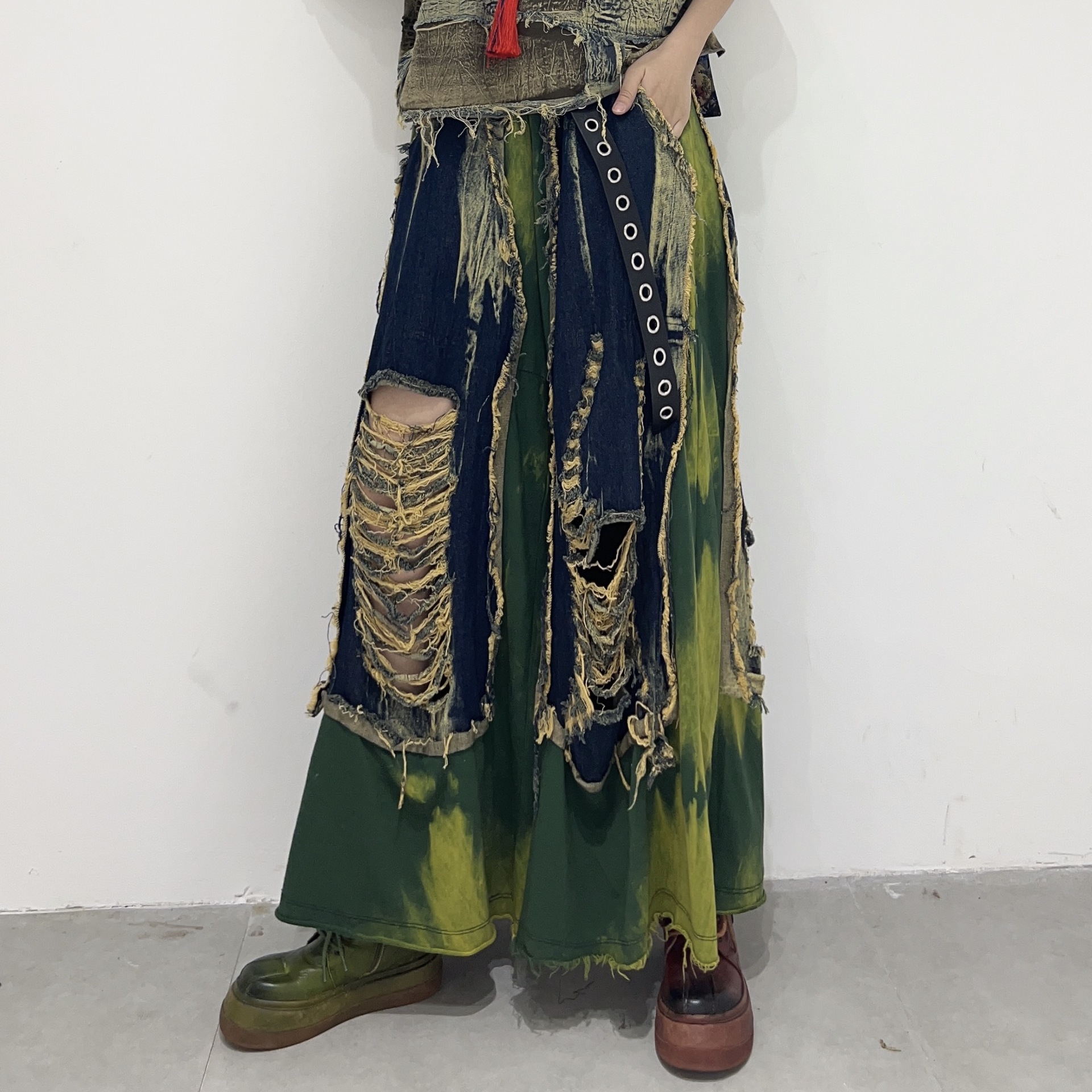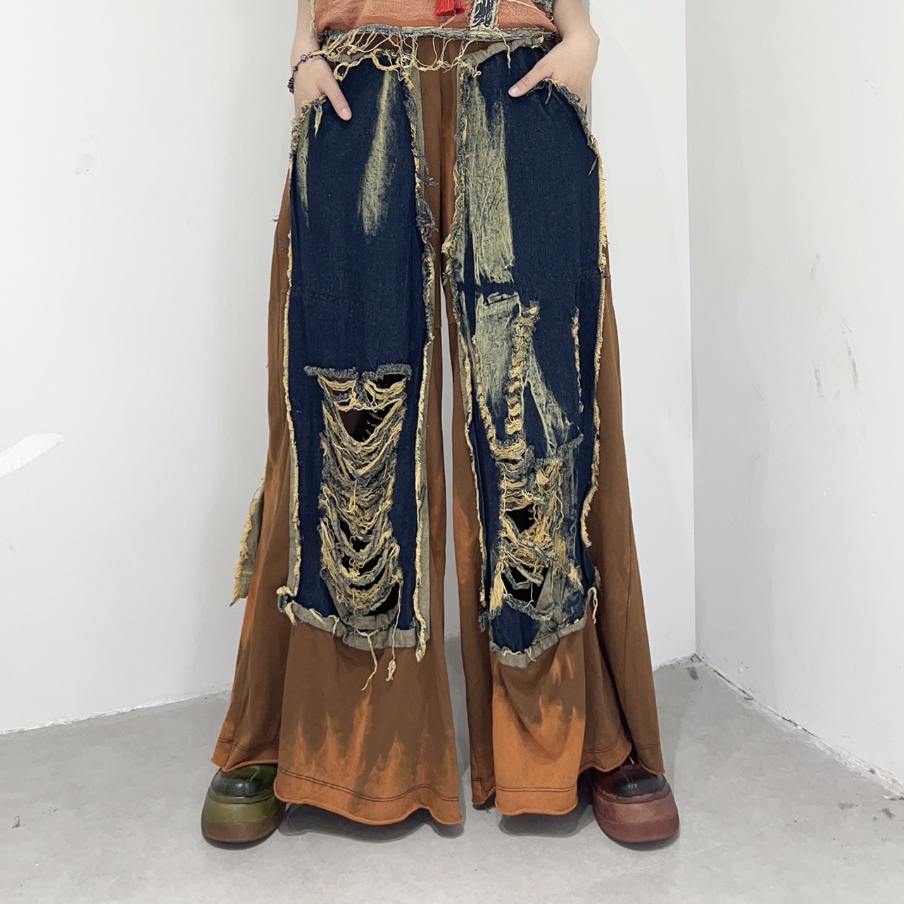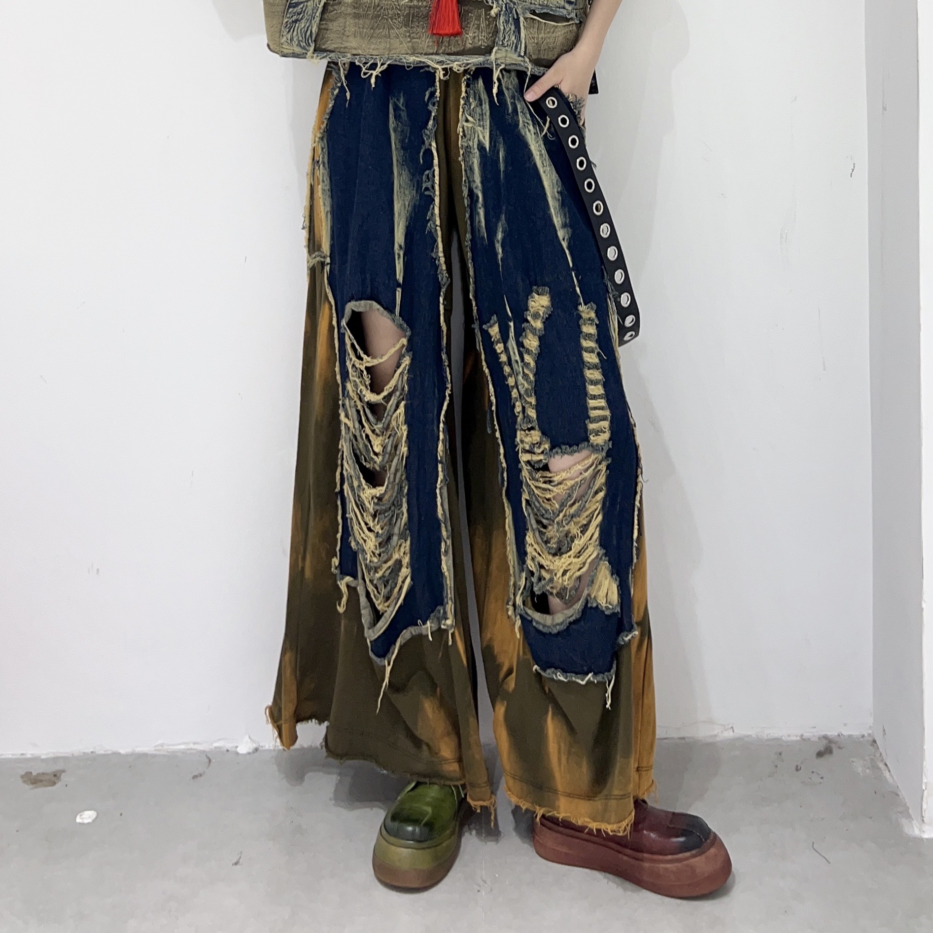 2025 봄과 가을의 독특한 트렌디 쿨 타이 염색 청바지 여성용 패션 세련된 허리와 넓은 다리가있는 세련된 바지스토어 가기