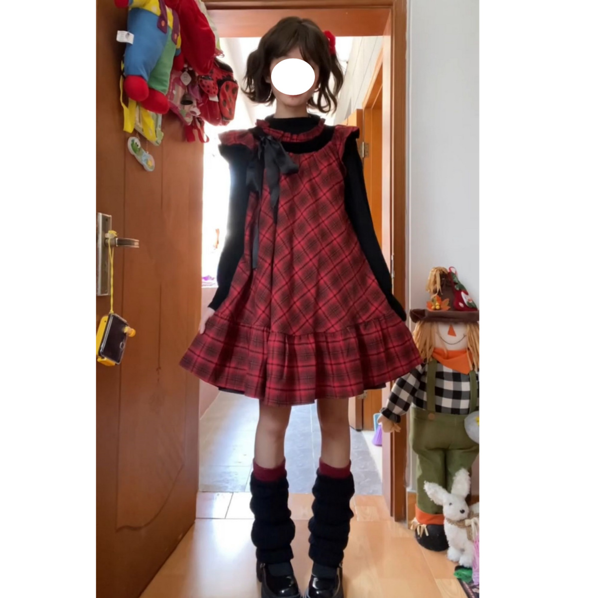한국 스타일의 작은 크리스마스 빨간 격자 무늬 작은 비행 소매 조끼 여성 인형베이스 재킷 2 피스 세트 세트스토어 가기