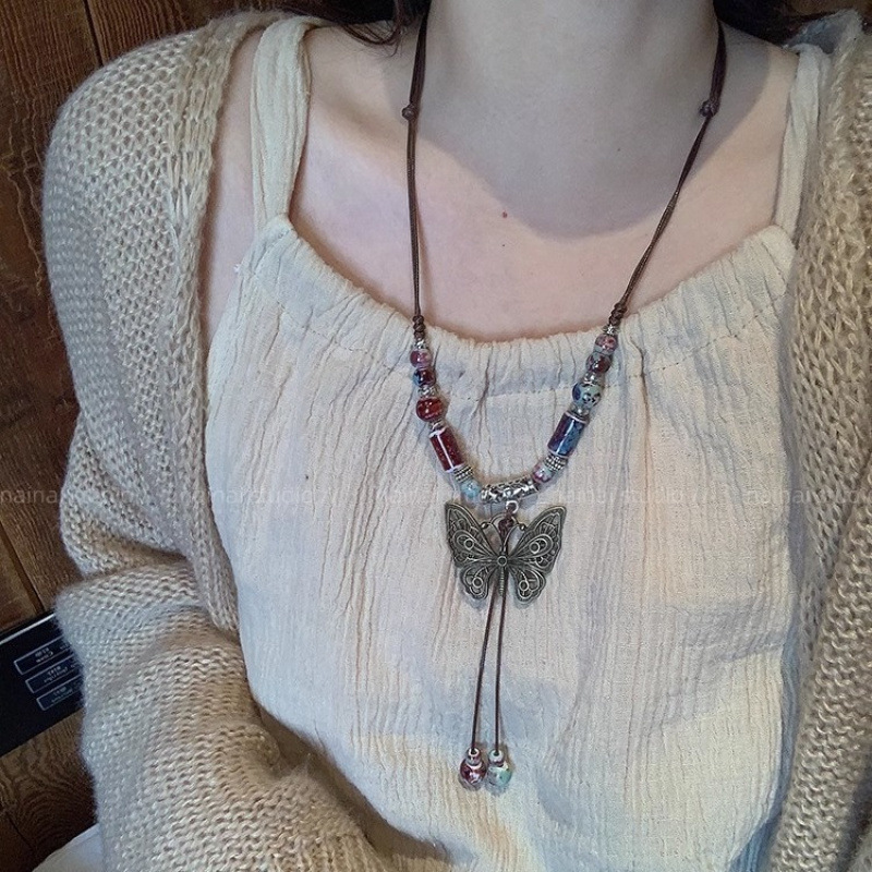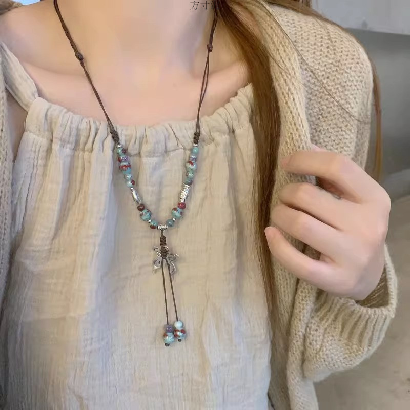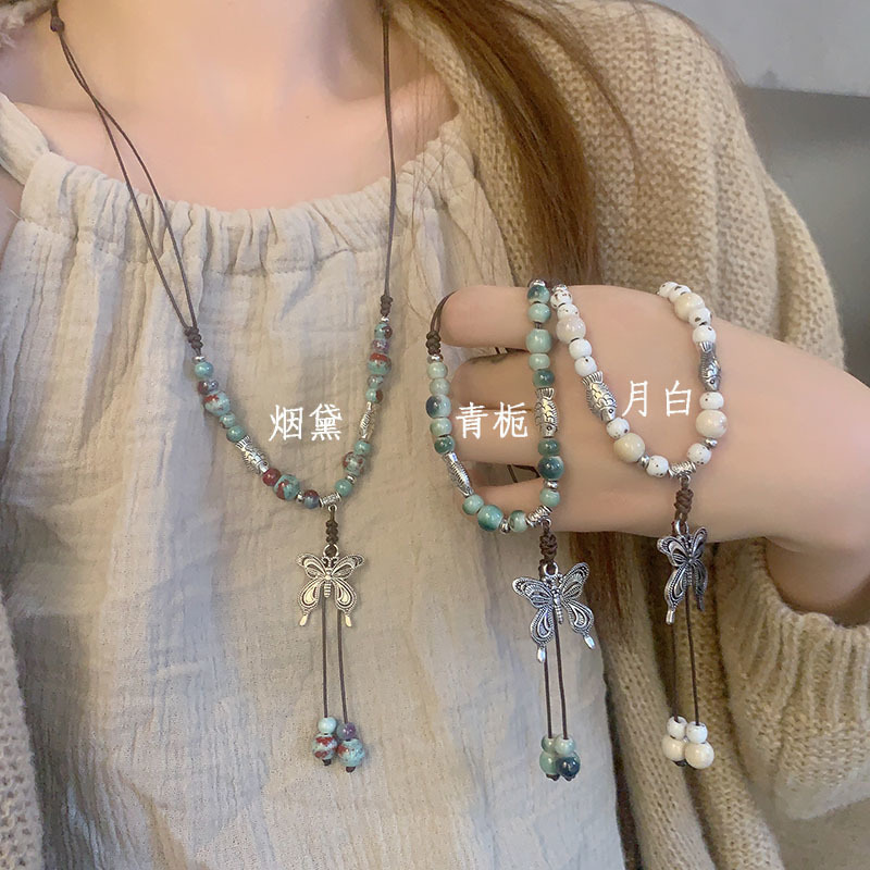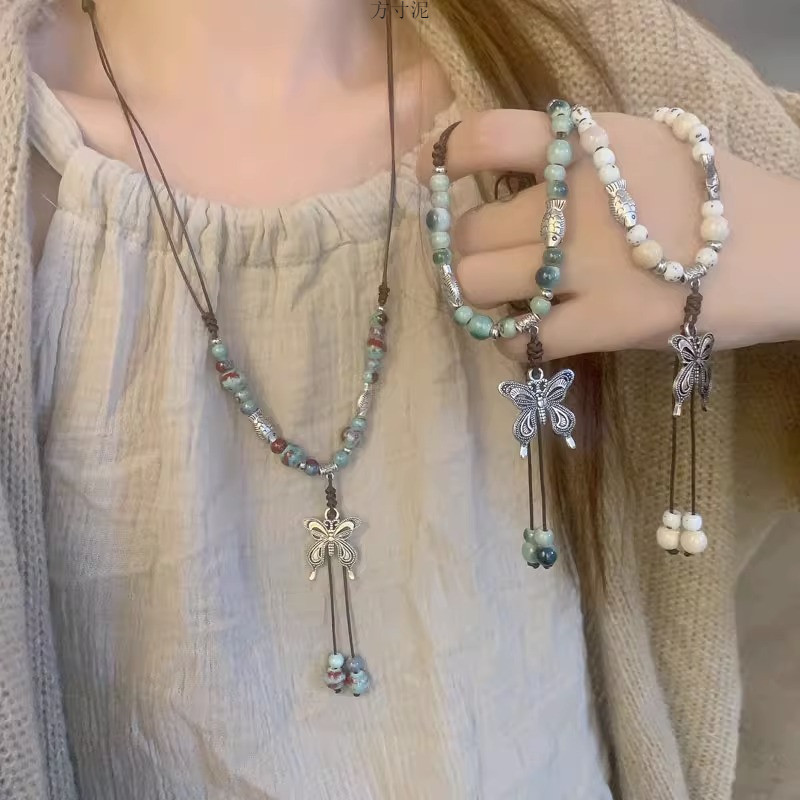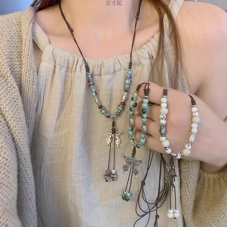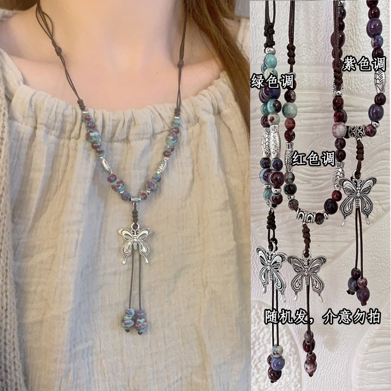 다채로운 구슬 세라믹 나비 짠 로프 목걸이 새로운 중국 민족 골동품 액세서리 빛 럭셔리 쇄골 체인 크로스 테두리스토어 가기