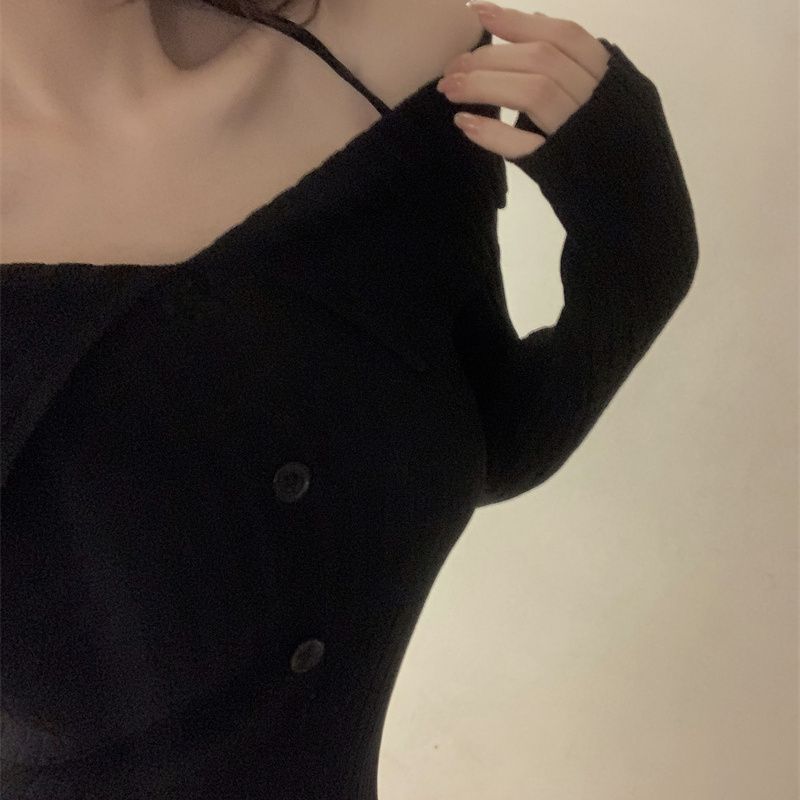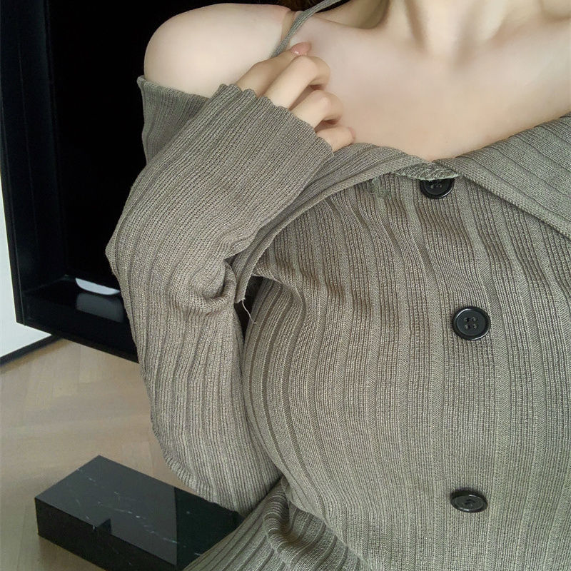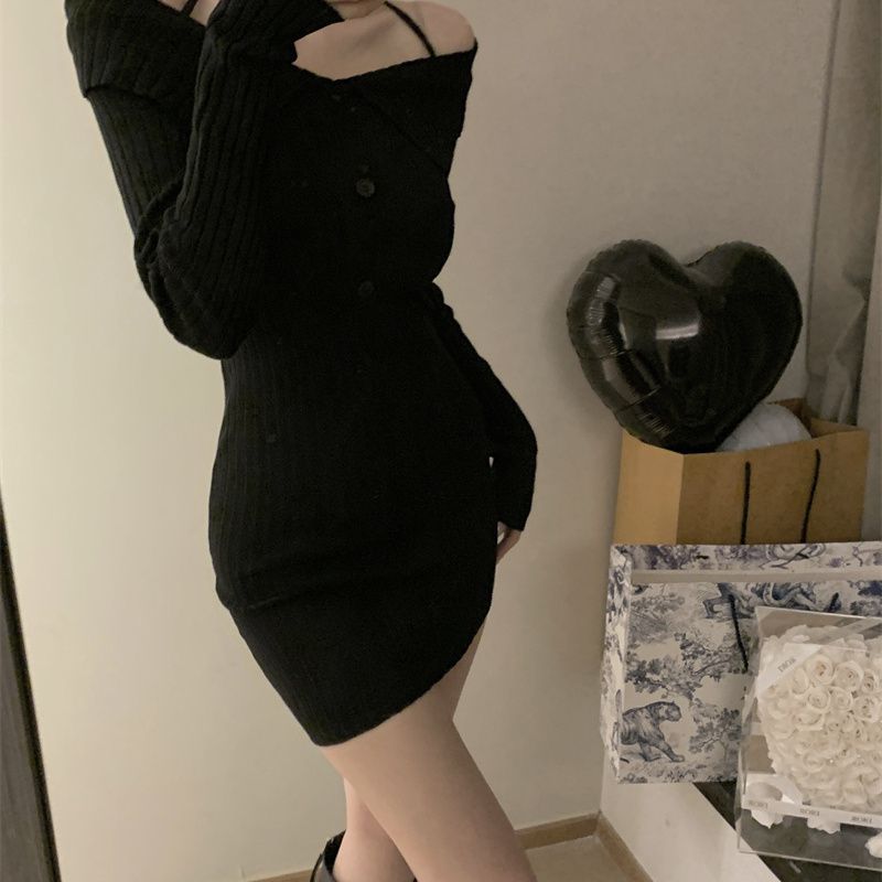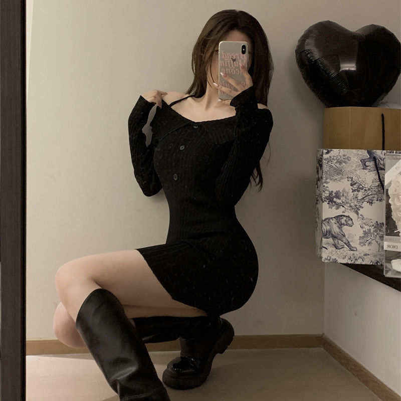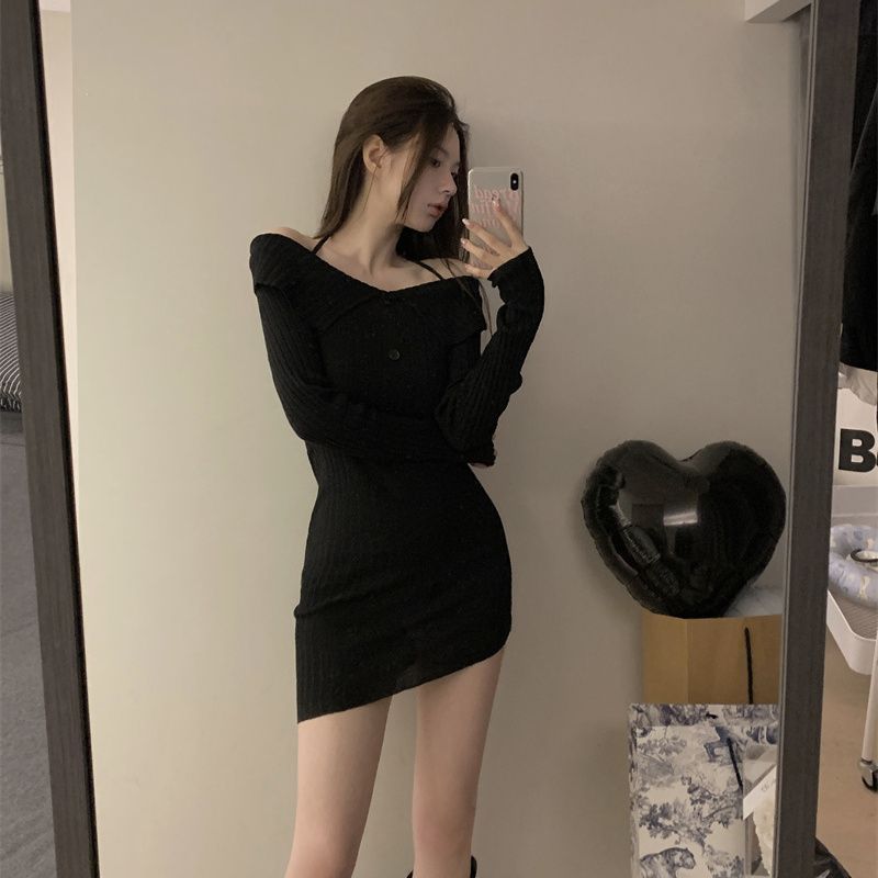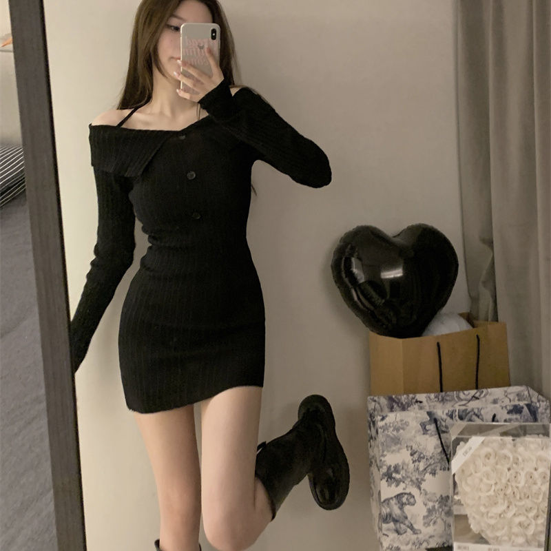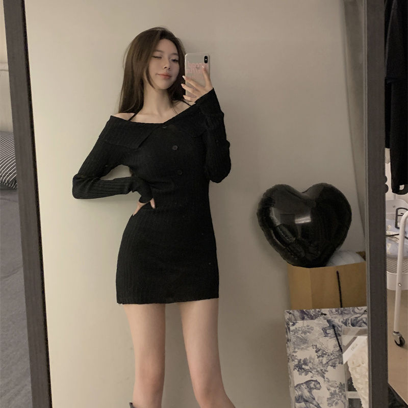 한 어깨 니트 원피스 가을 새로운 섹시한 패셔너블 스파이스 소녀 스트랩 슬림핏 슬리밍 옷깃 긴 소매 스커트스토어 가기