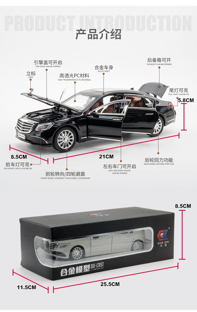 1:24 합금 빅 벤 E300L 자동차 모델 백 포스 사운드 및 라이트 뮤직 6 도어 장난감 자동차 모델 장식품 컬렉션