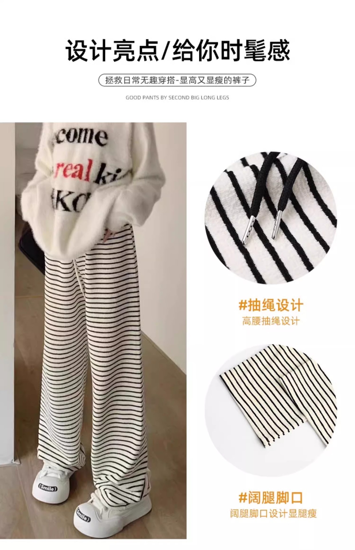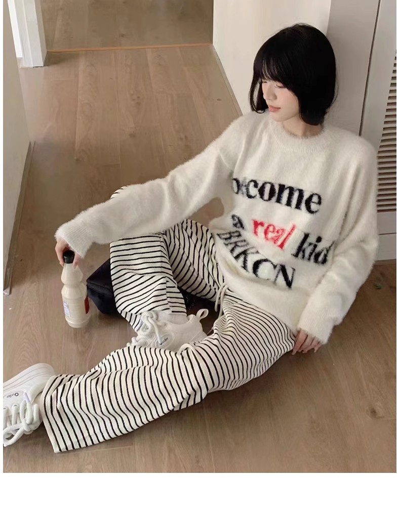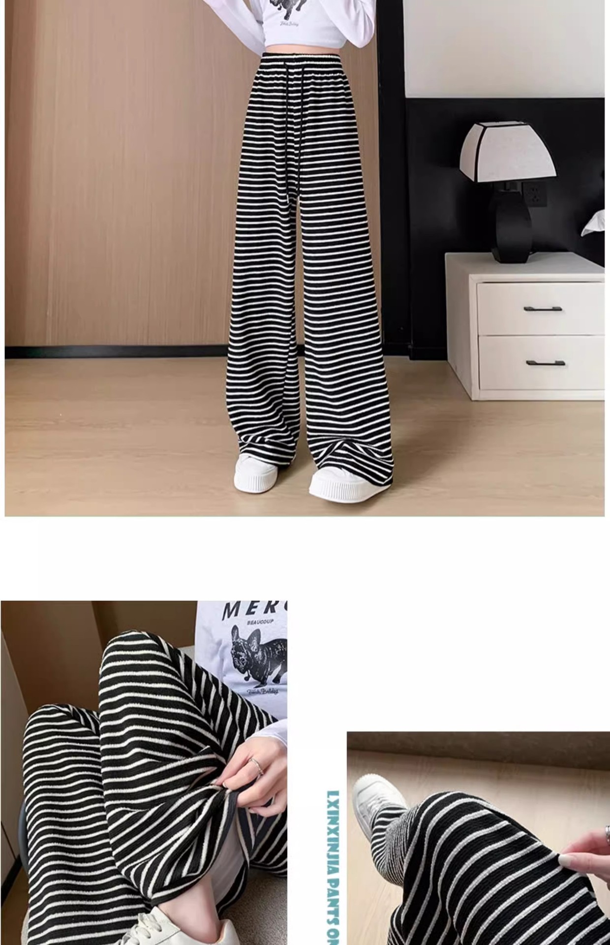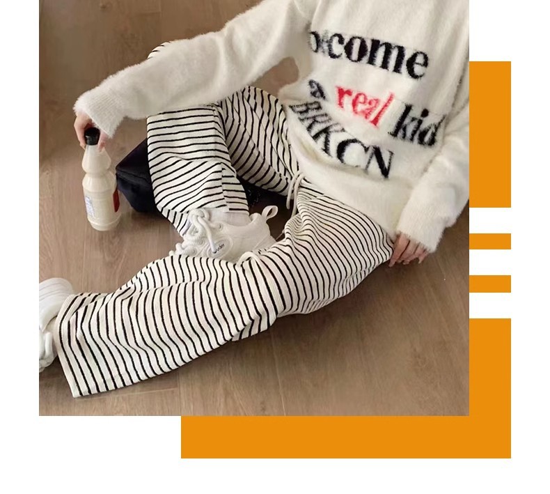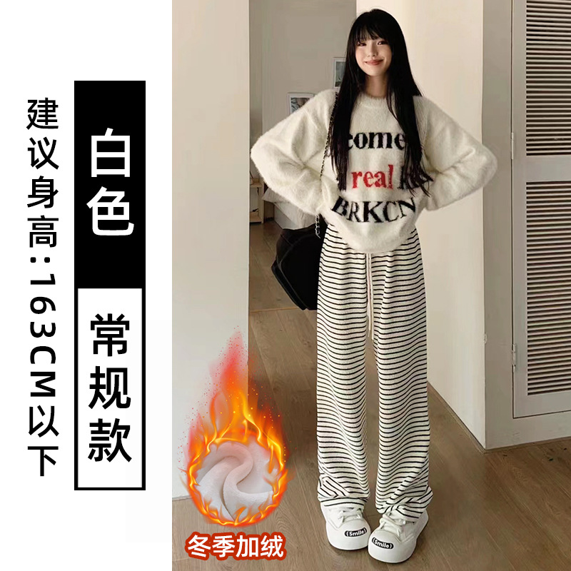 흑백 줄무늬 타월 팬츠 여성용 봄 가을 겨울 2024 신상 하이웨이스트 스트레이트 캐주얼 기모 와이드 팬츠 캐주얼하고 다용도스토어 가기