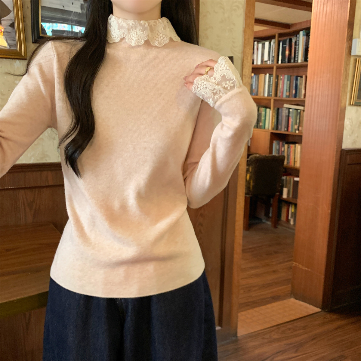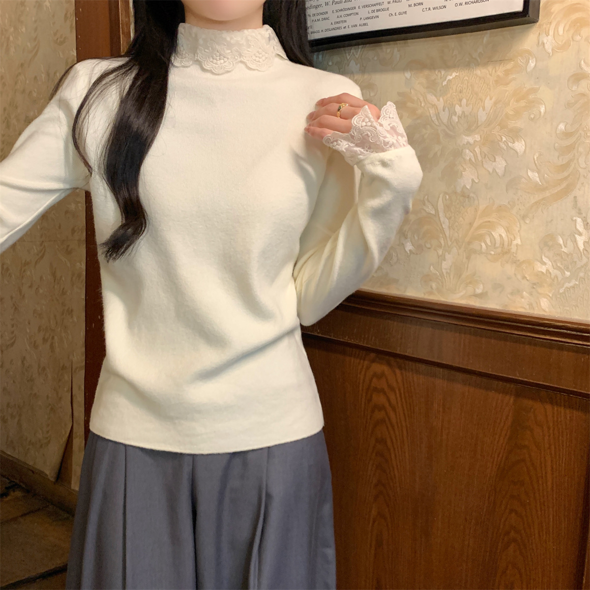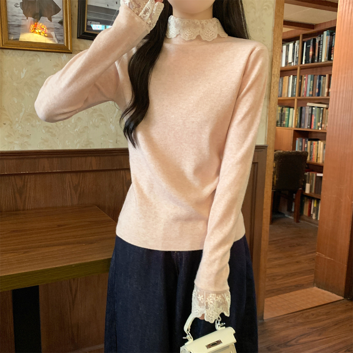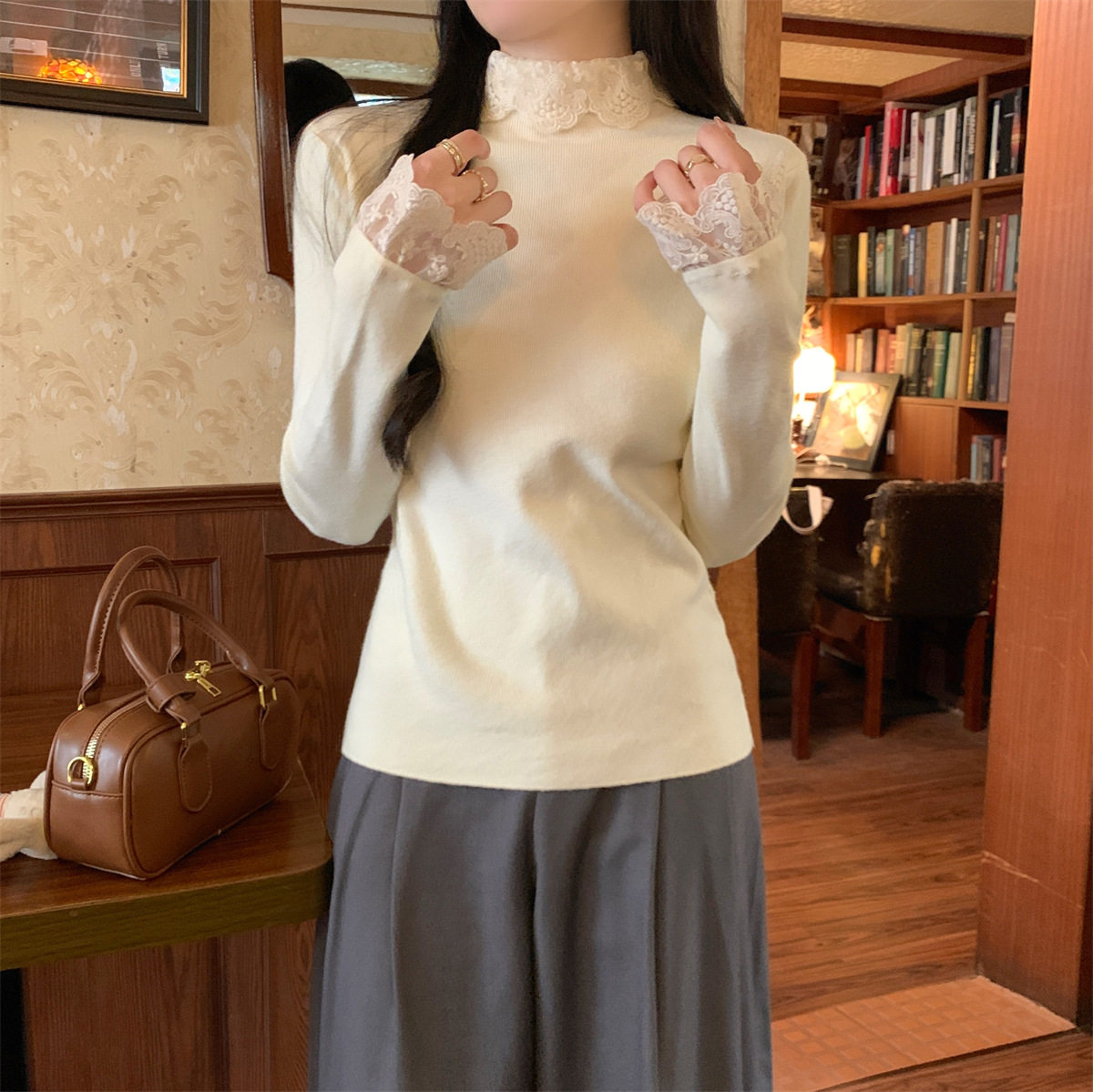 한국식 하이넥 레이스 엣지 디자인 젠틀베이스 니트 스웨터 가을과 겨울 여성 슬림핏 올매치 긴팔 스웨터