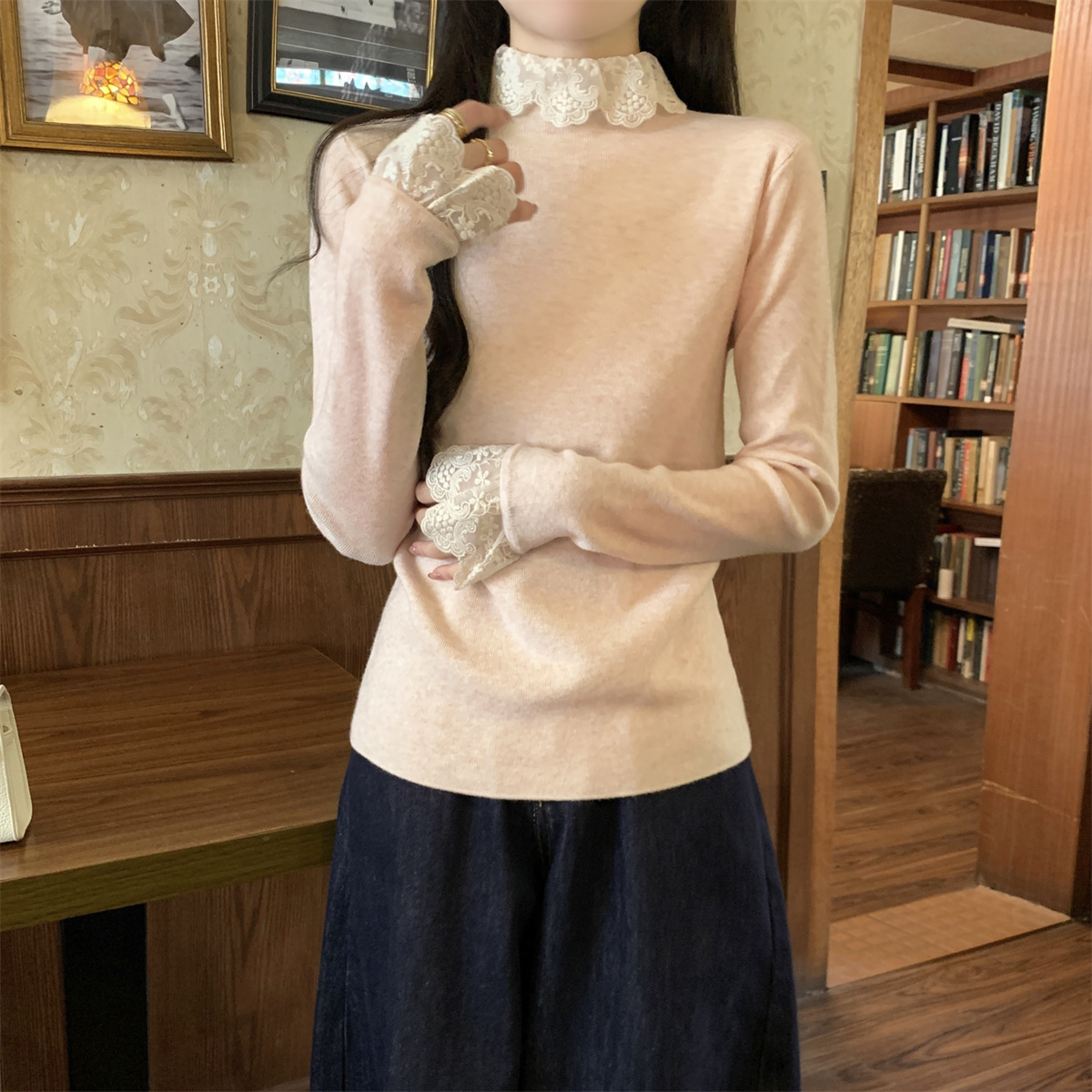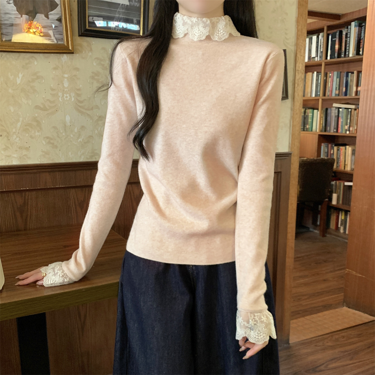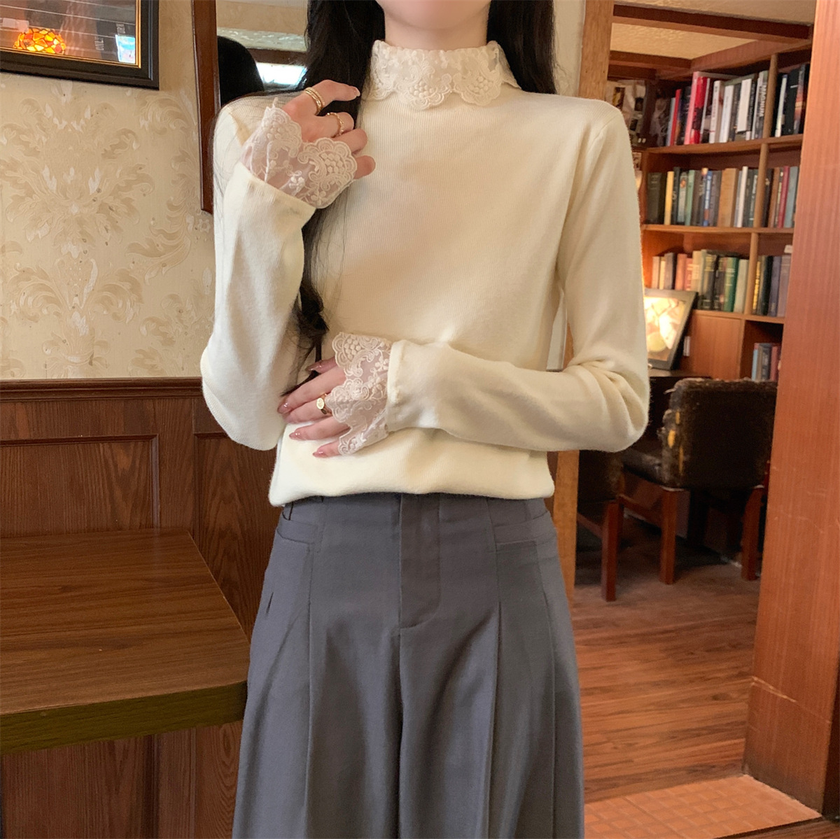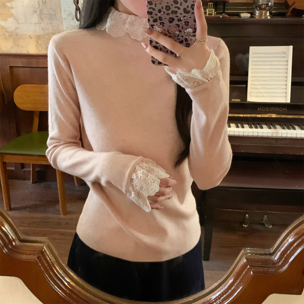 한국식 하이넥 레이스 엣지 디자인 젠틀베이스 니트 스웨터 가을과 겨울 여성 슬림핏 올매치 긴팔 스웨터
