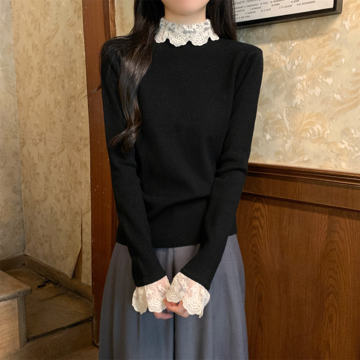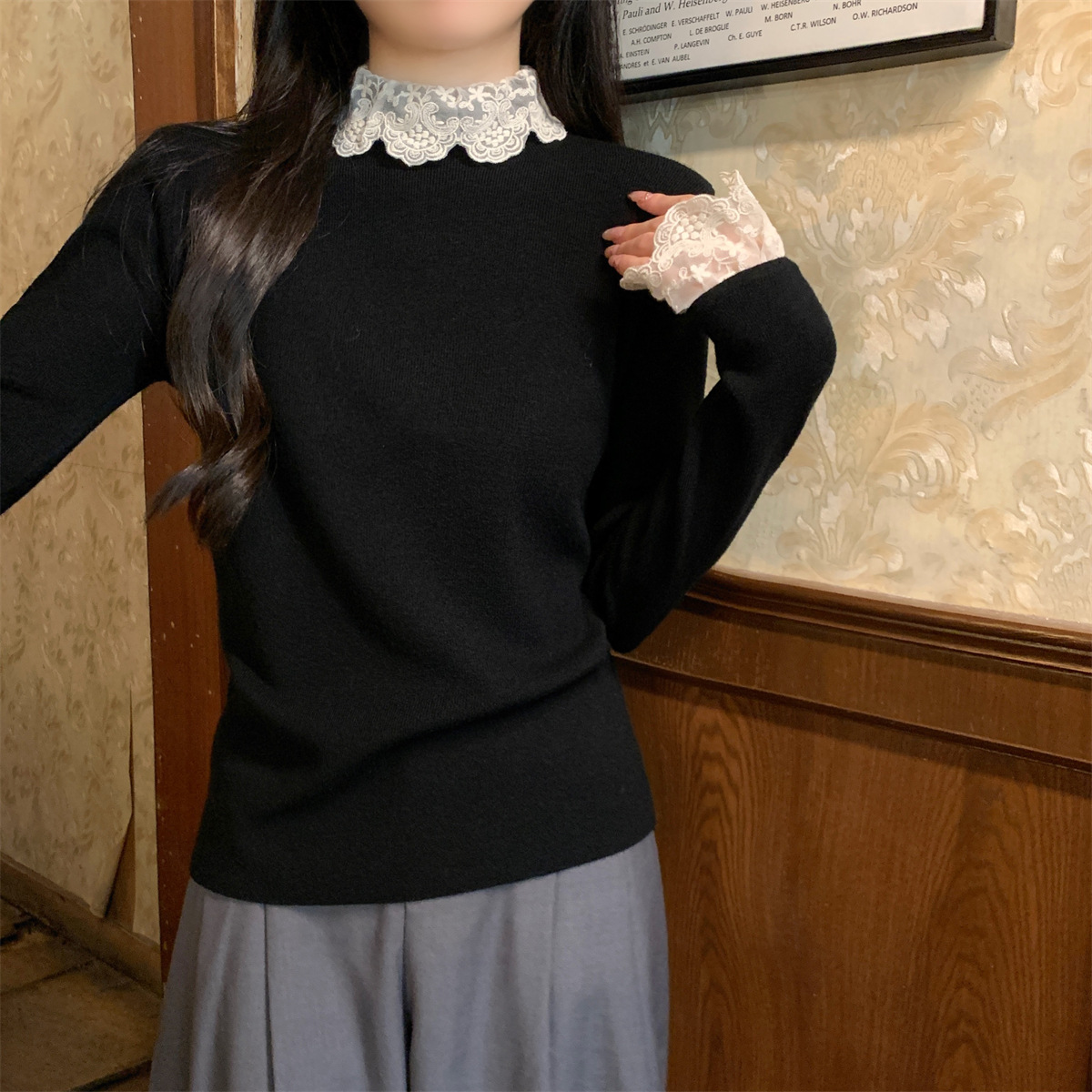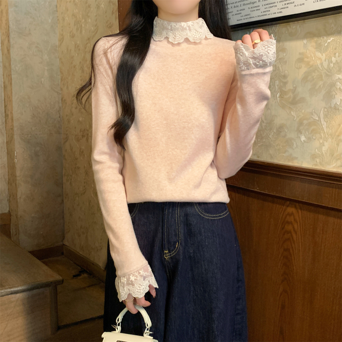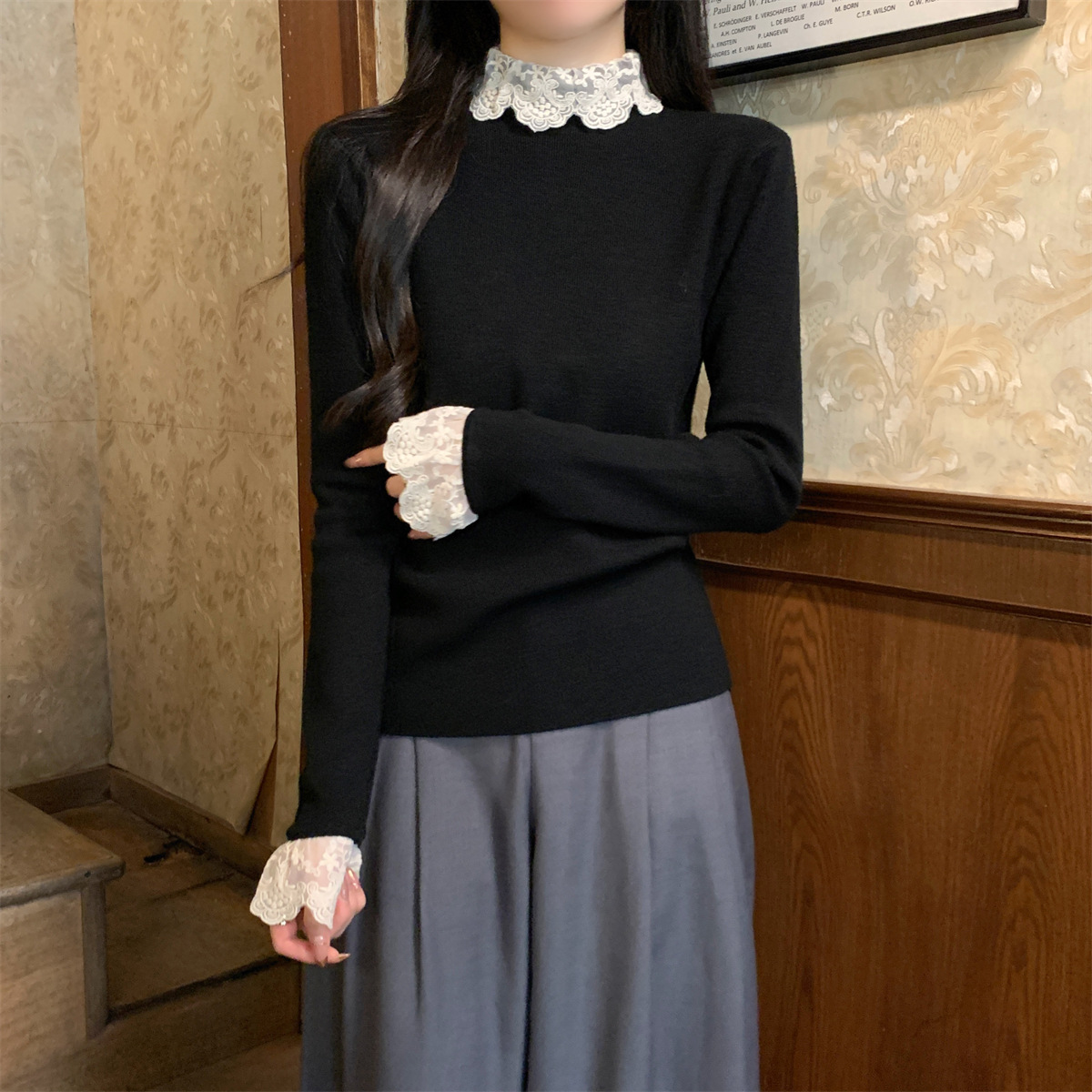 한국식 하이넥 레이스 엣지 디자인 젠틀베이스 니트 스웨터 가을과 겨울 여성 슬림핏 올매치 긴팔 스웨터