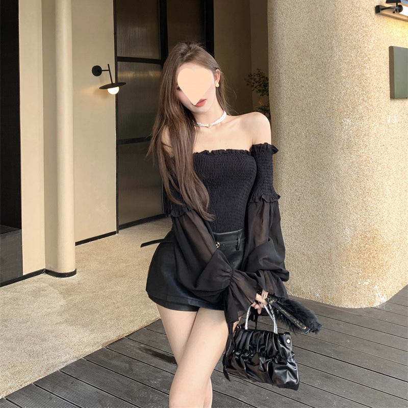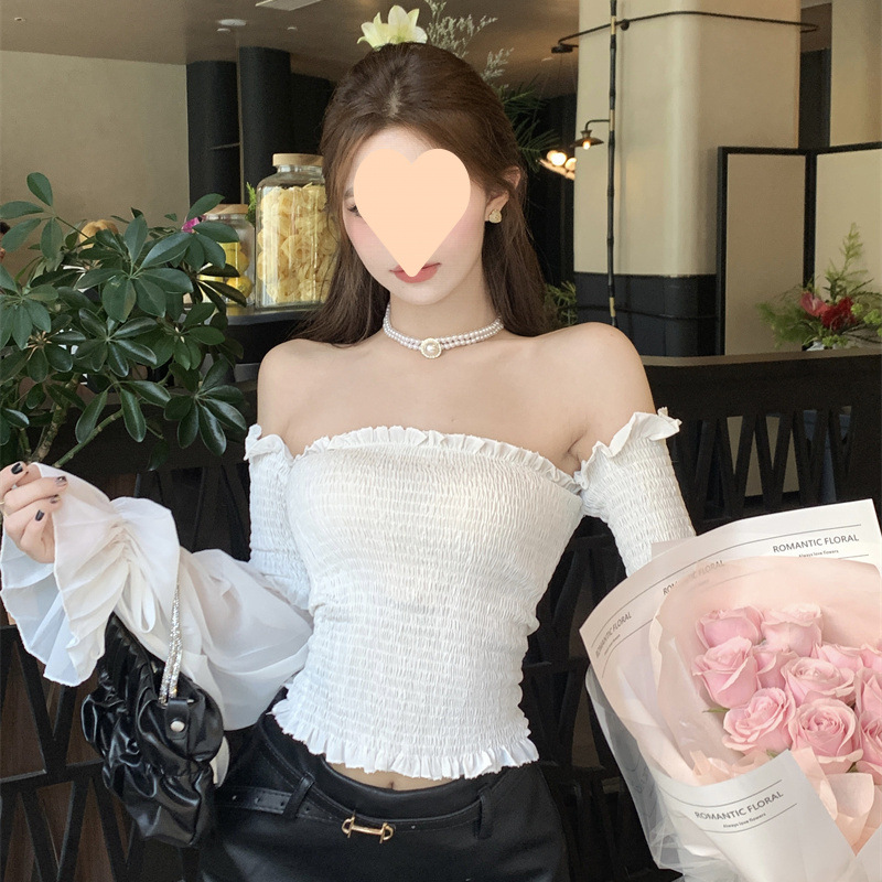순수한 욕망 달콤한 바느질 어깨 탑 여성의 이른 가을 새 귀 테두리 쉬폰 셔츠 섹시한 슬림 핏 슬림 셔츠