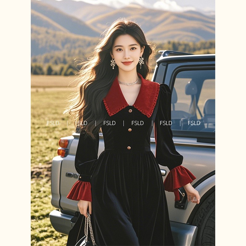 YT394096 올해 인기 부자 딸 프리미엄 블랙 벨벳 원피스 2024 새로운 여성스토어 가기