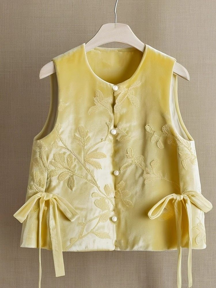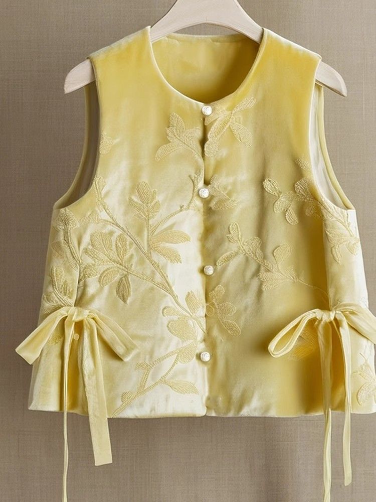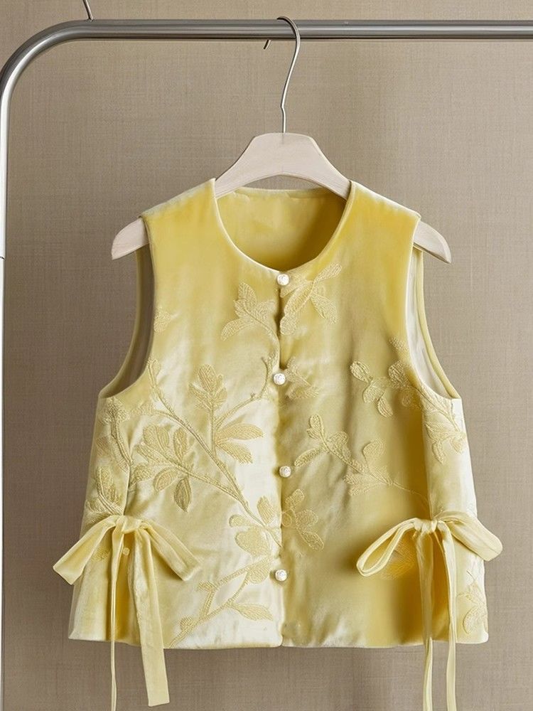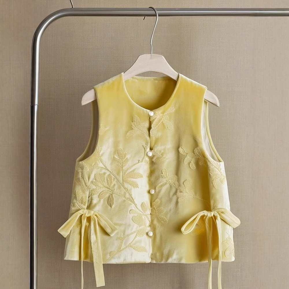 도파민 착용 새로운 중국 스타일 국가 스타일 독특한 아름다운 노란색 자카드 벨벳 조끼 최고 여성의 가을과 겨울