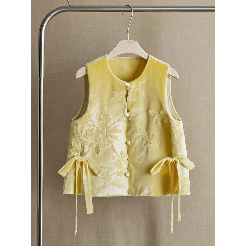 도파민 착용 새로운 중국 스타일 국가 스타일 독특한 아름다운 노란색 자카드 벨벳 조끼 최고 여성의 가을과 겨울스토어 가기