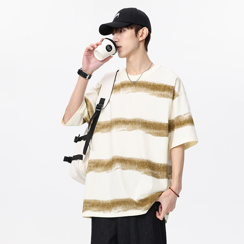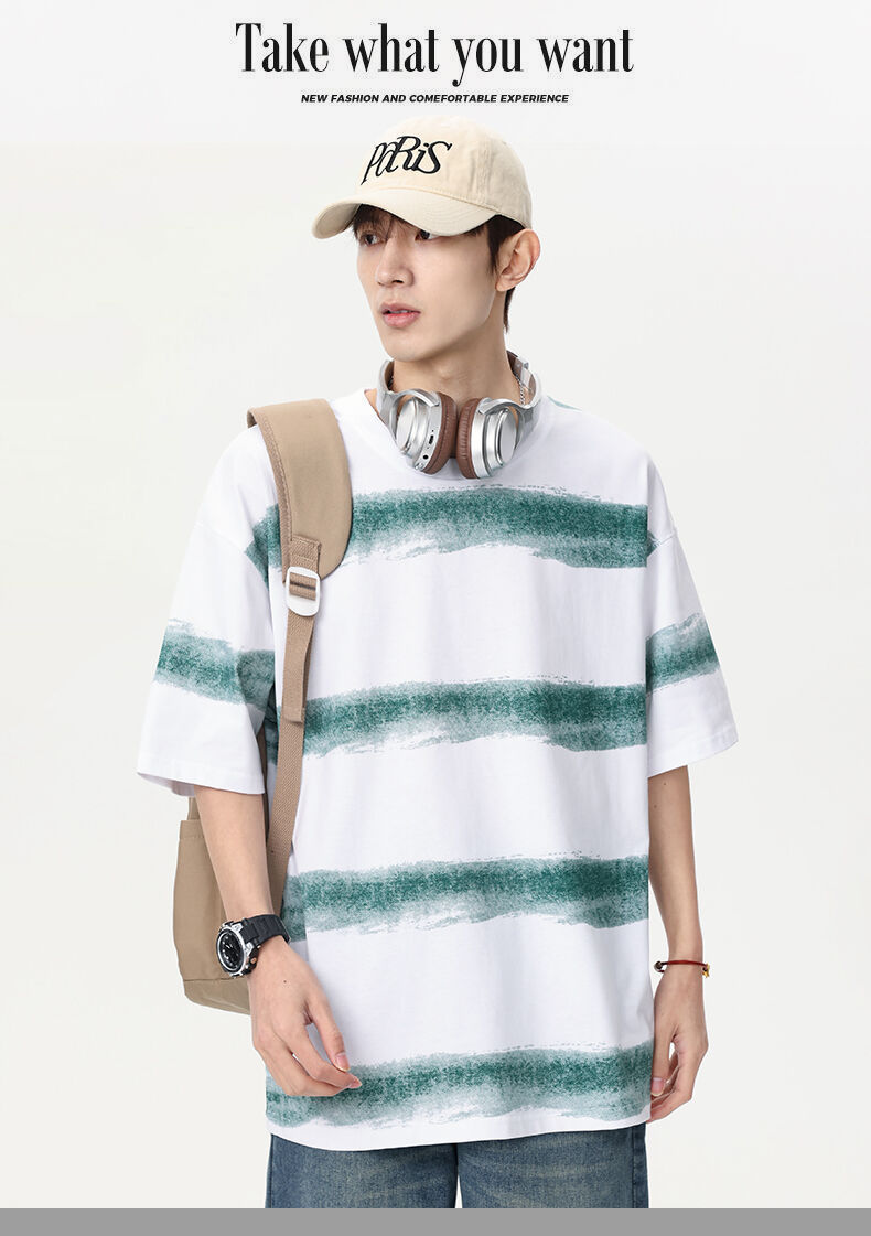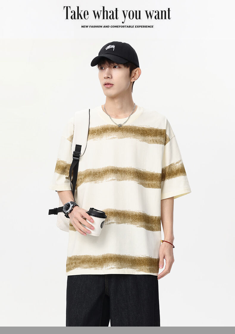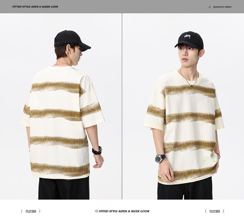2025 년 여름 새 라운드 넥 스트라이프 반팔 스포츠 트렌디 브랜드 남성 루즈 라이트 성숙한 유행 남성 및 여성 티셔츠 한국 스타일